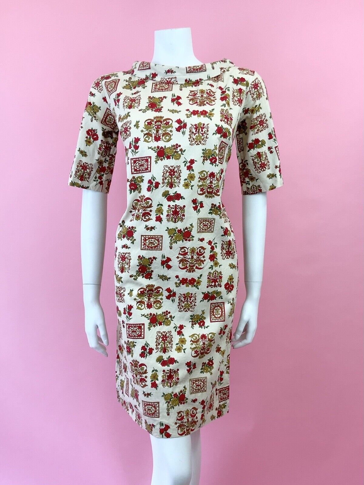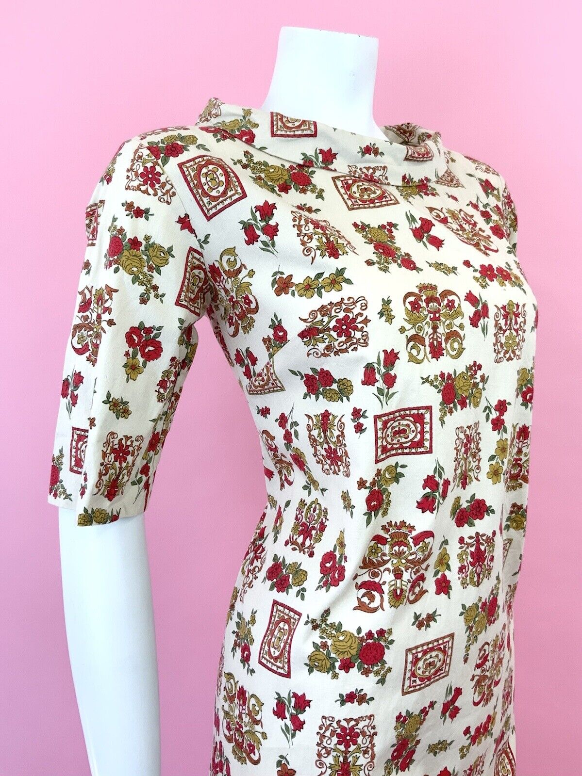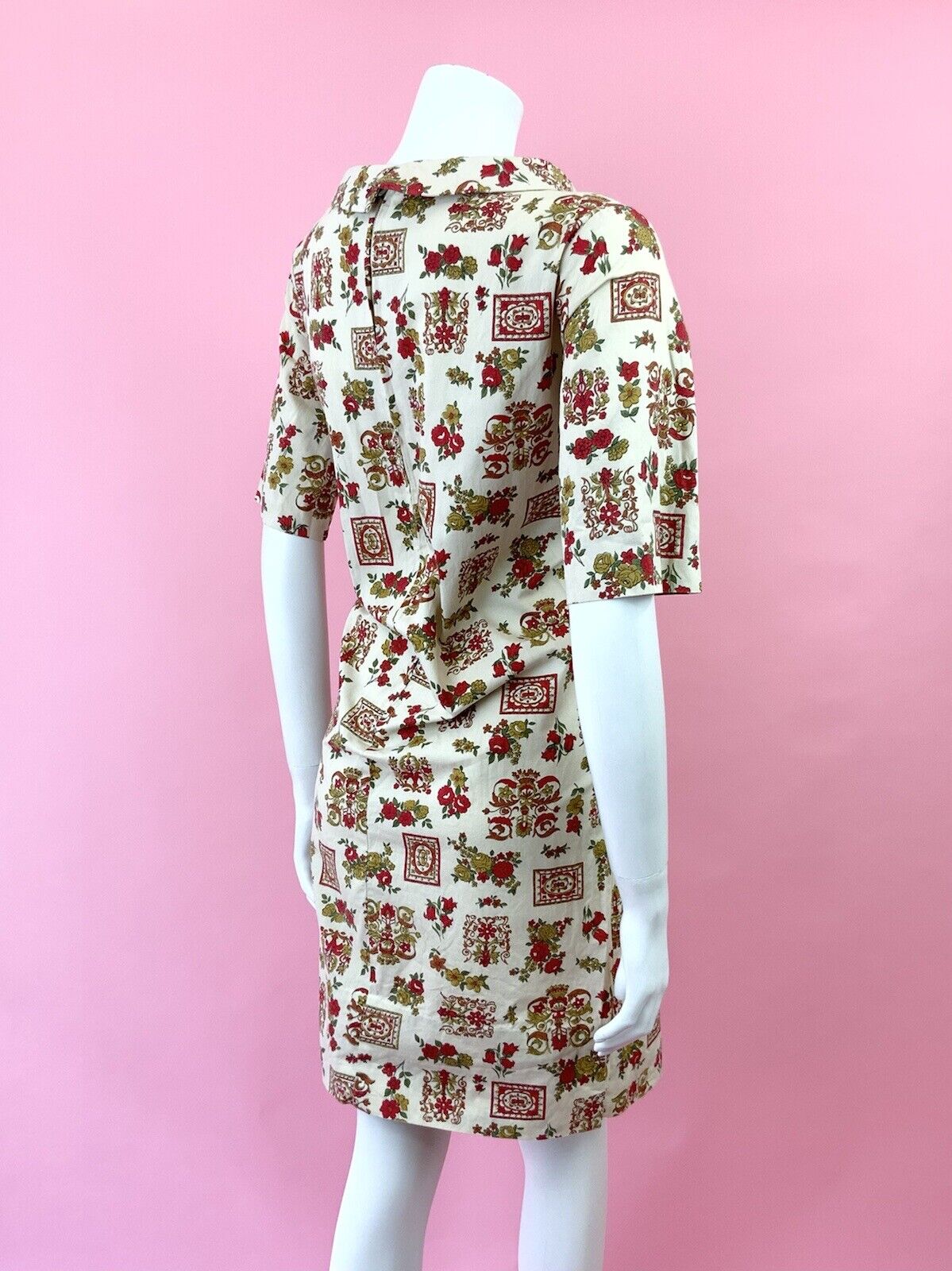 VINTAGE 60s 70s CREAM GREEN RED ORNATE FLORAL ROSE DECO MOD SHIFT DRESS 10