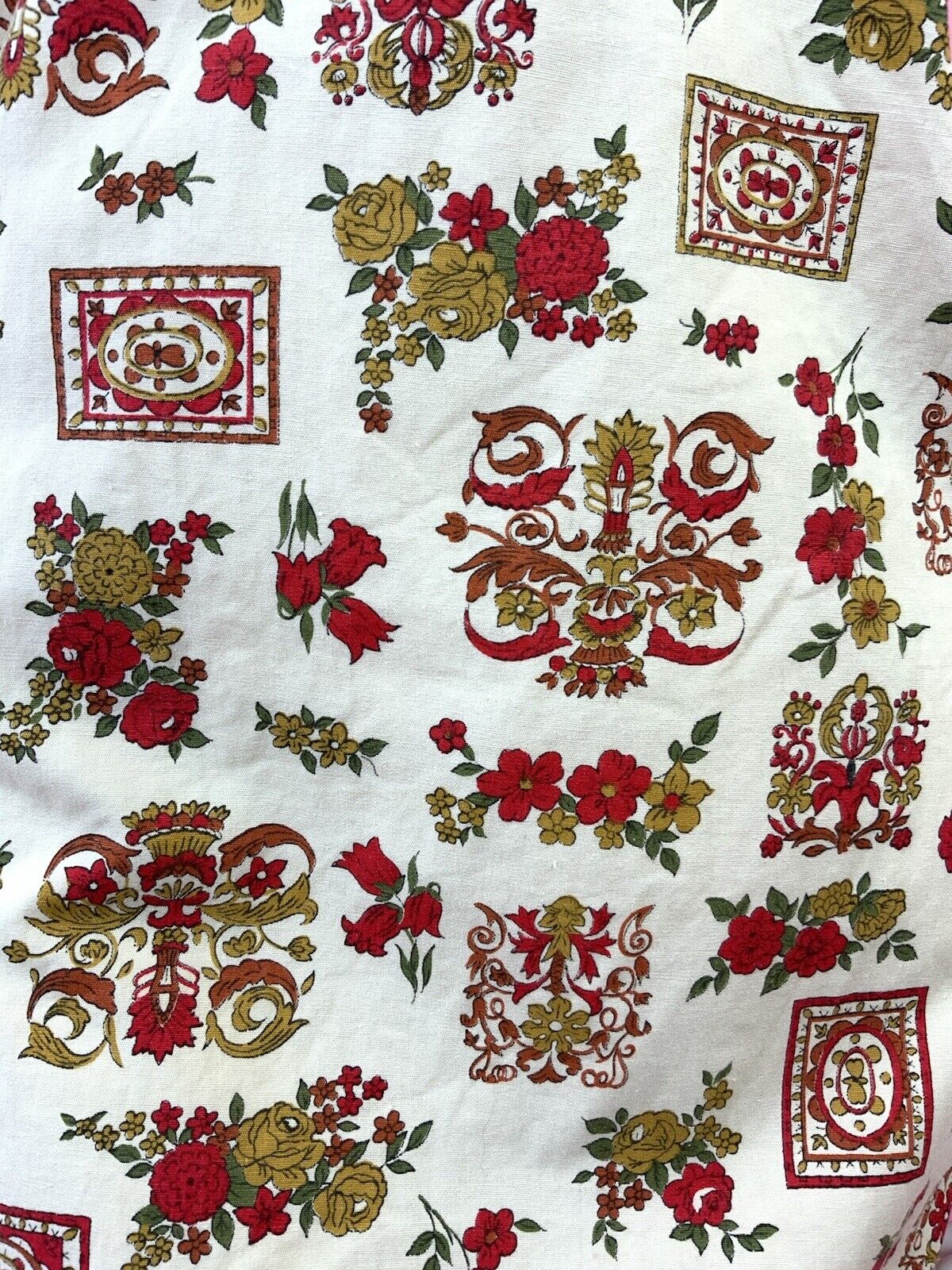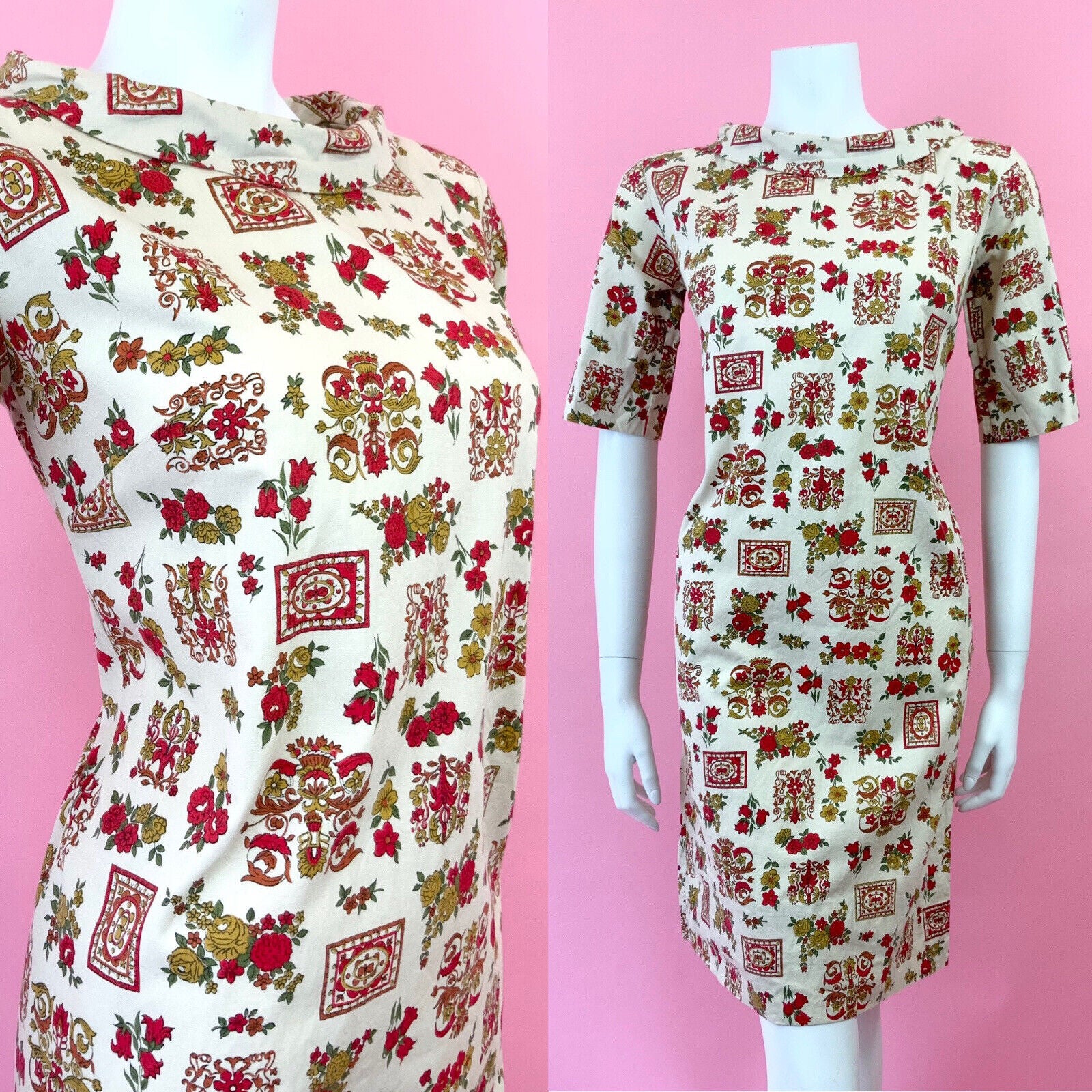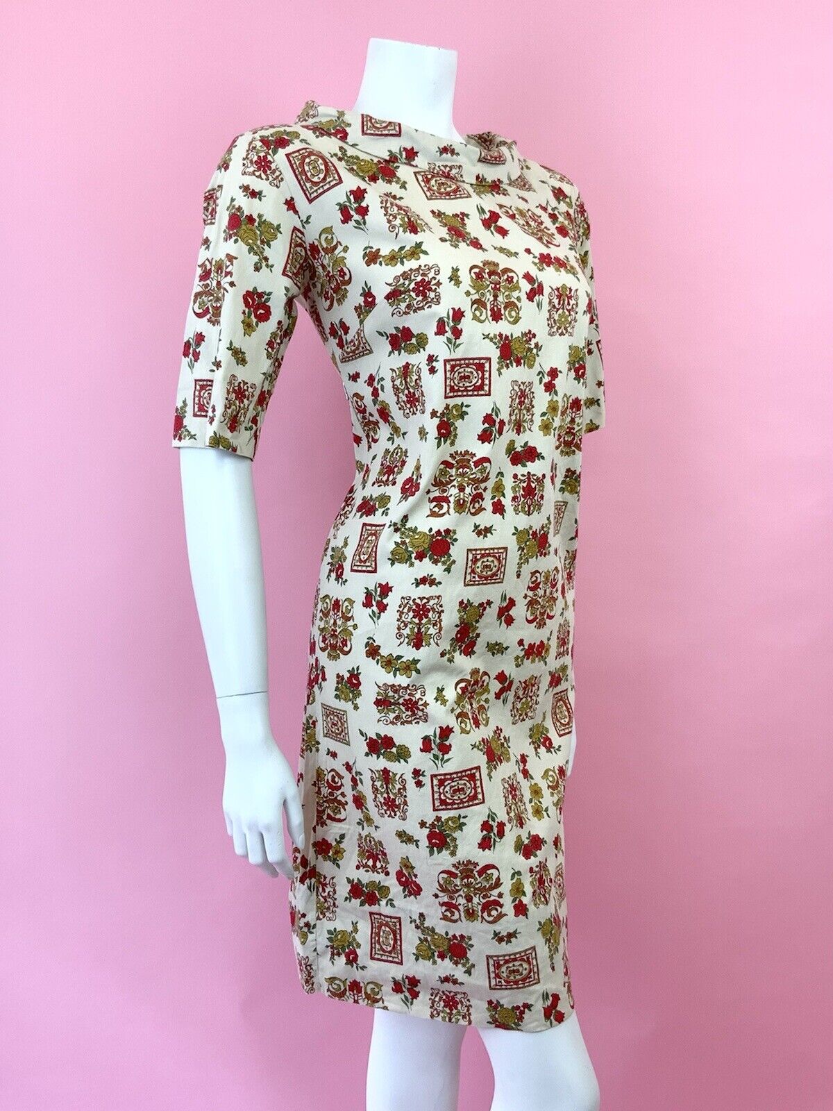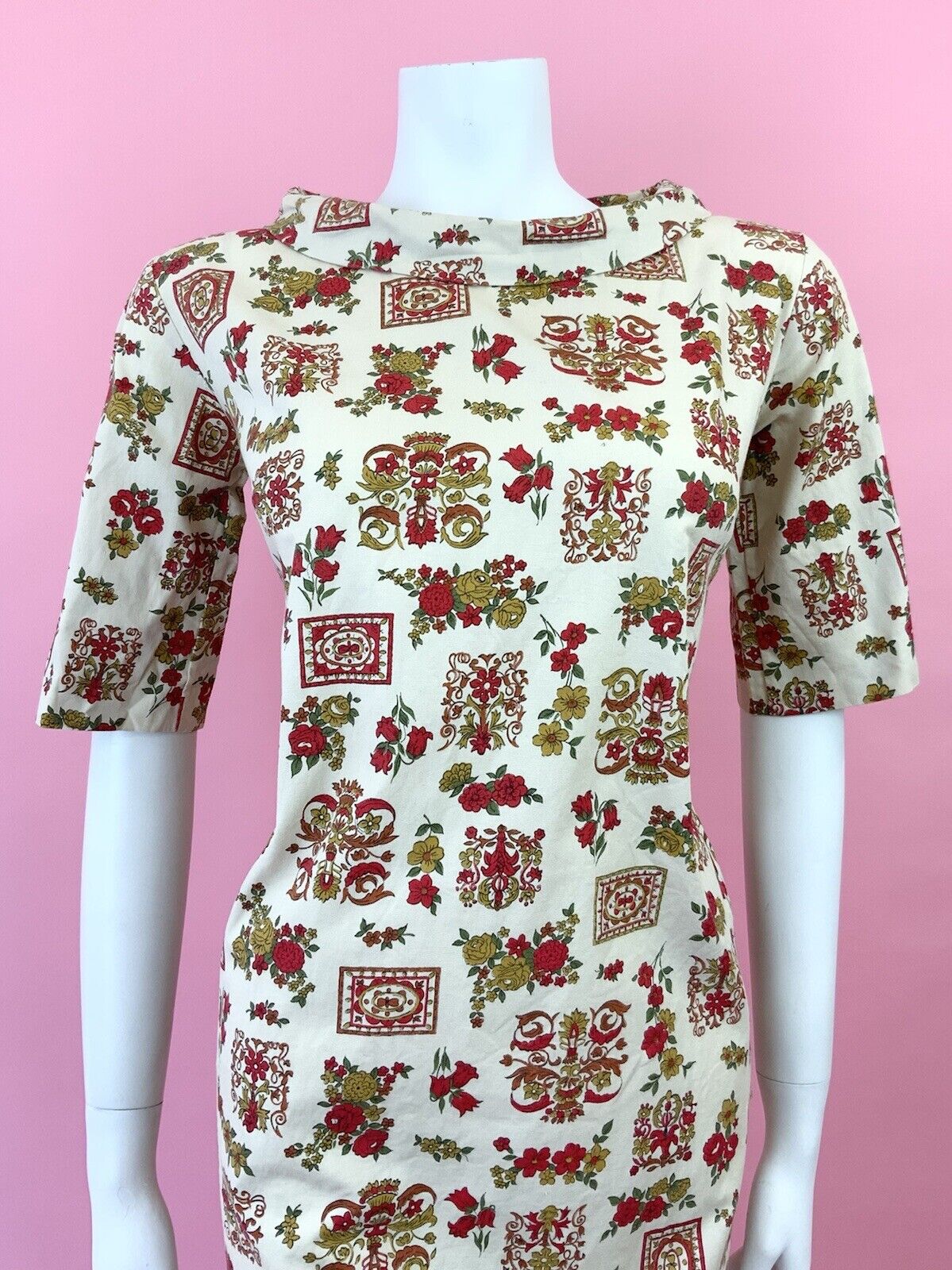 VINTAGE 60s 70s CREAM GREEN RED ORNATE FLORAL ROSE DECO MOD SHIFT DRESS 10