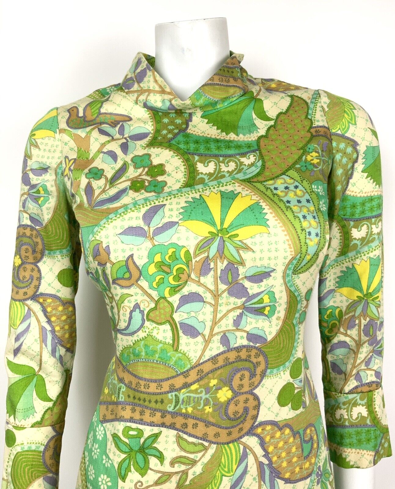 VINTAGE 60s 70s CREAM GREEN YELLOW PURPLE PSYCHEDELIC BIRD FLORAL DRESS 8