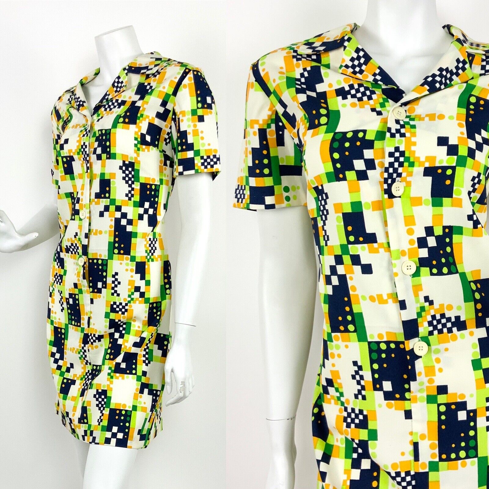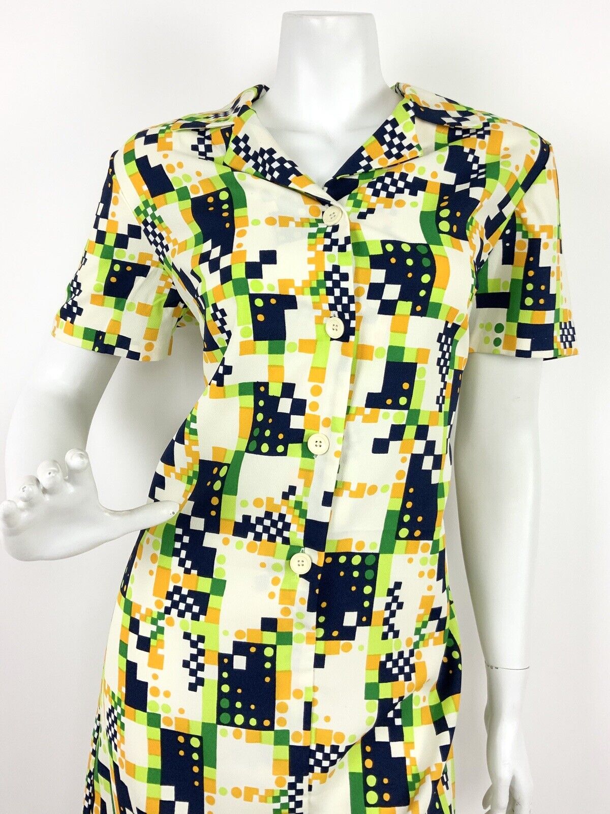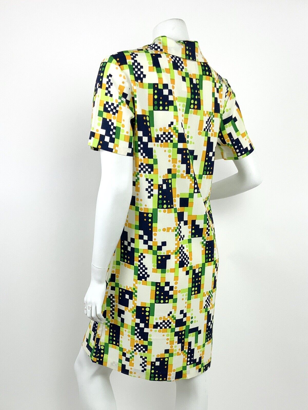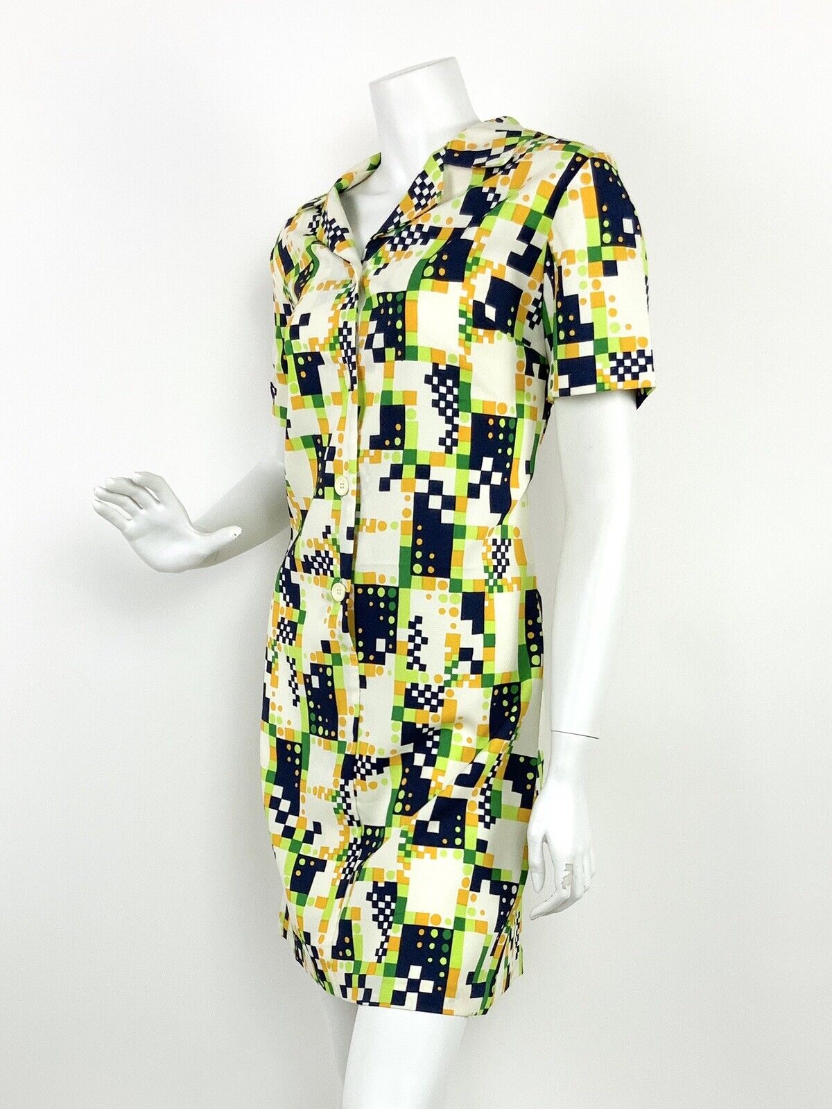 VINTAGE 60s 70s CREAM LIME GREEN BLUE ORANGE GEOMETRIC PIXEL SHIRT DRESS 10 12