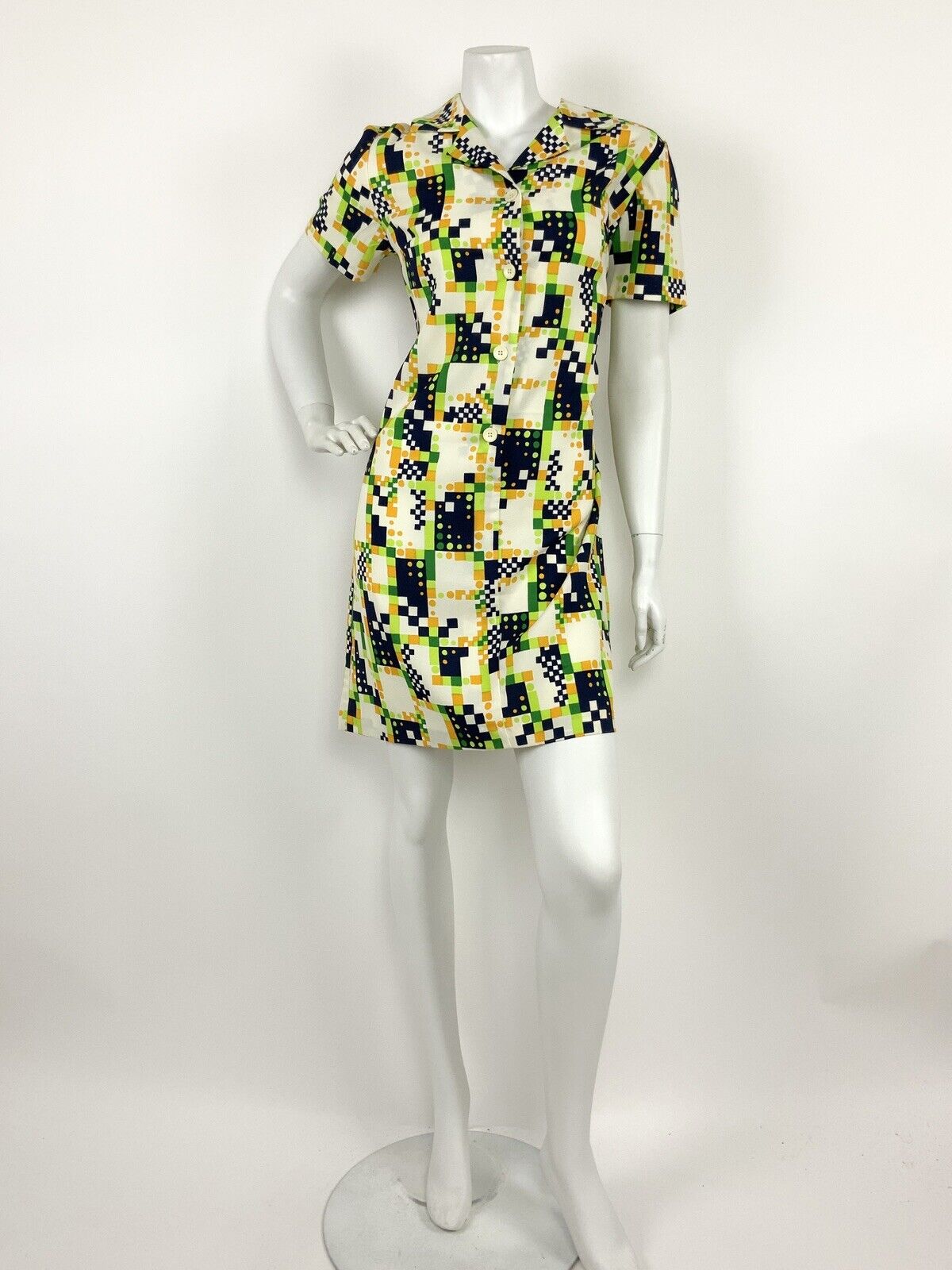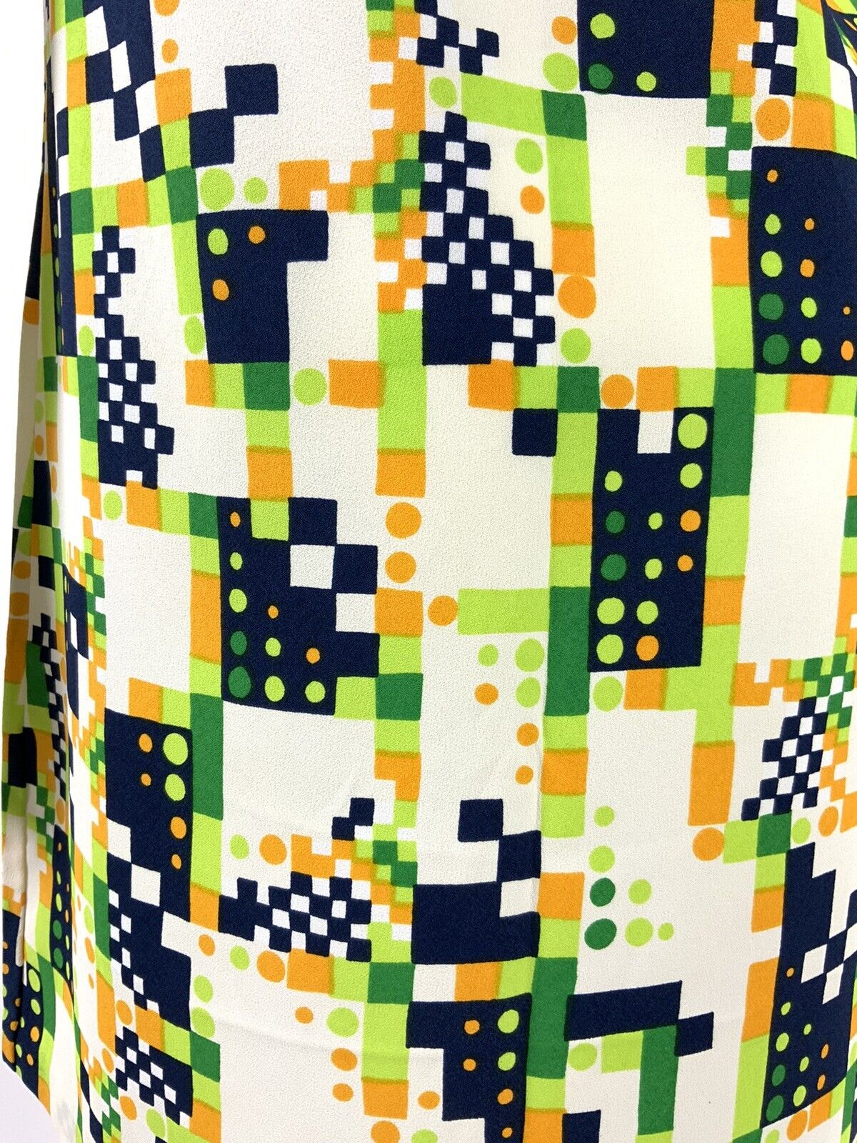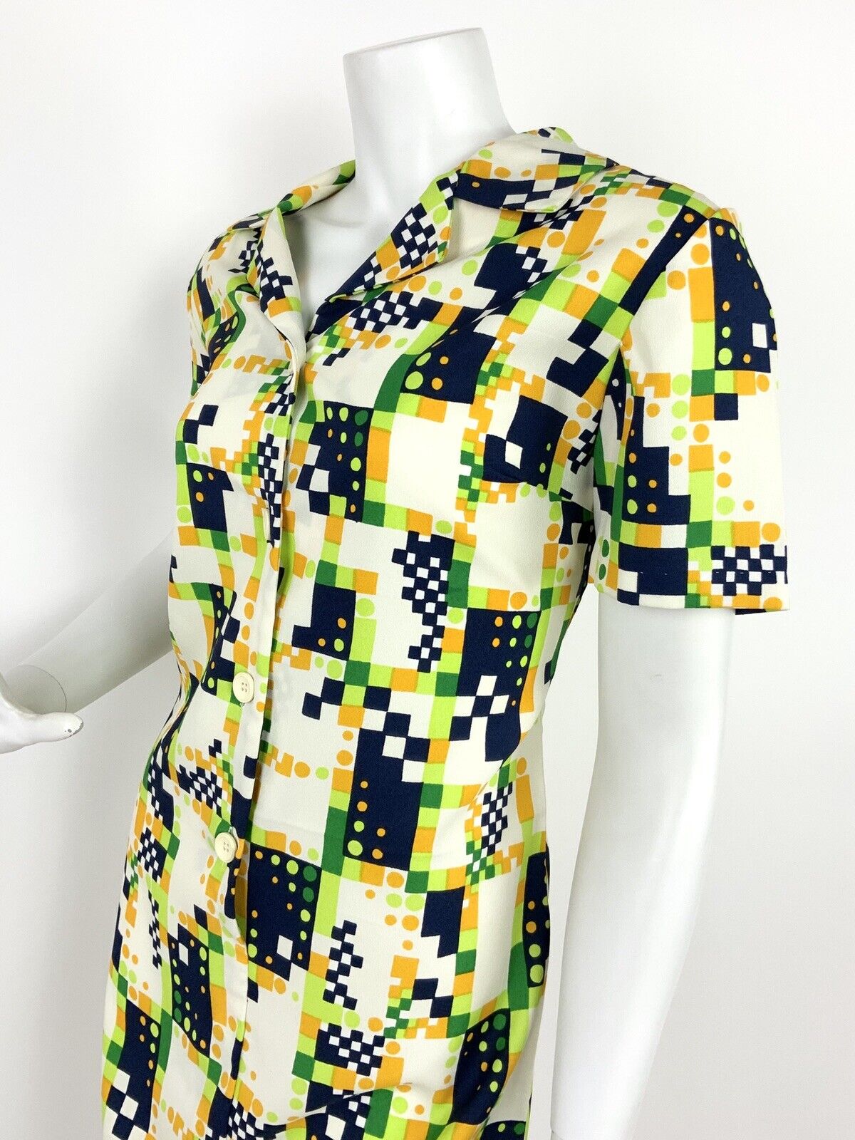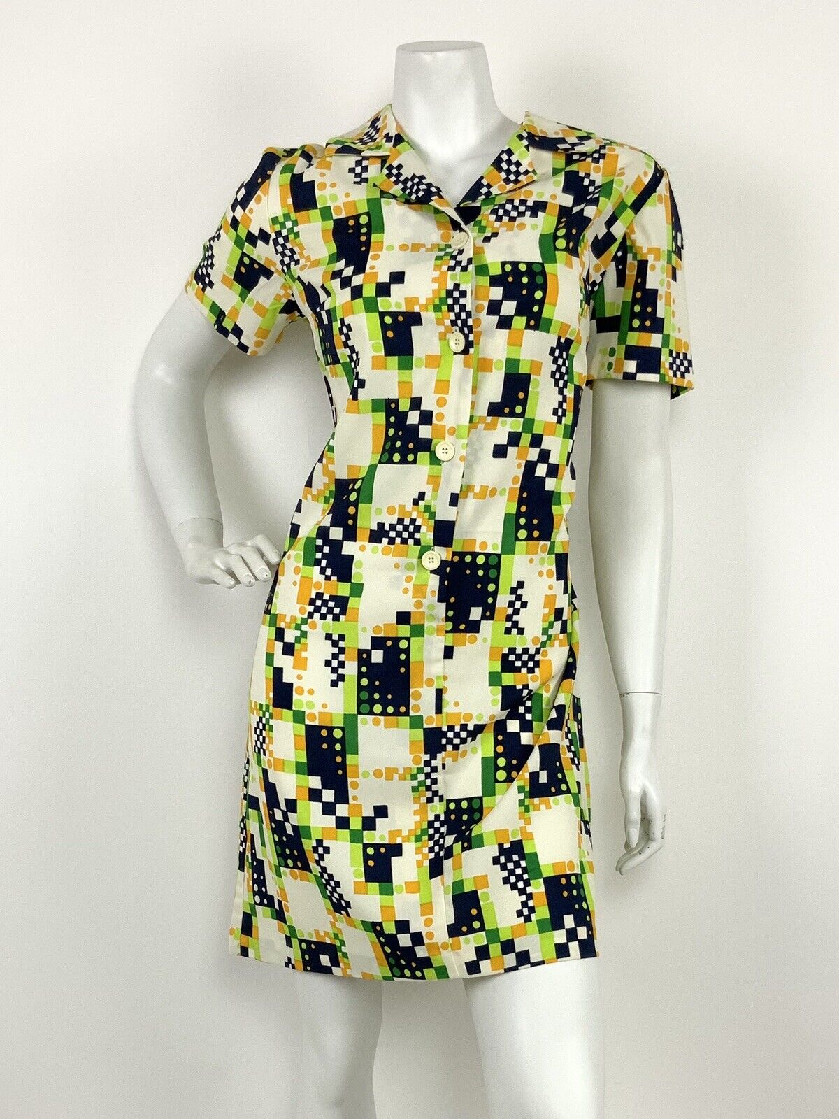 VINTAGE 60s 70s CREAM LIME GREEN BLUE ORANGE GEOMETRIC PIXEL SHIRT DRESS 10 12