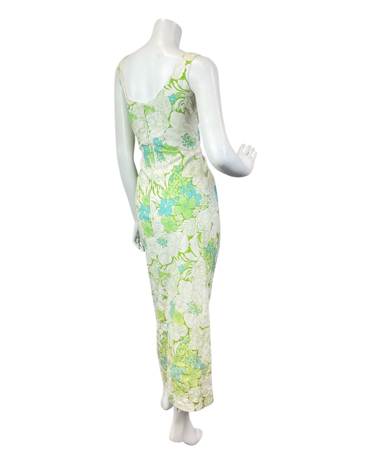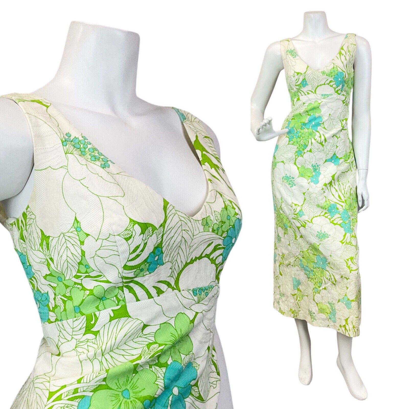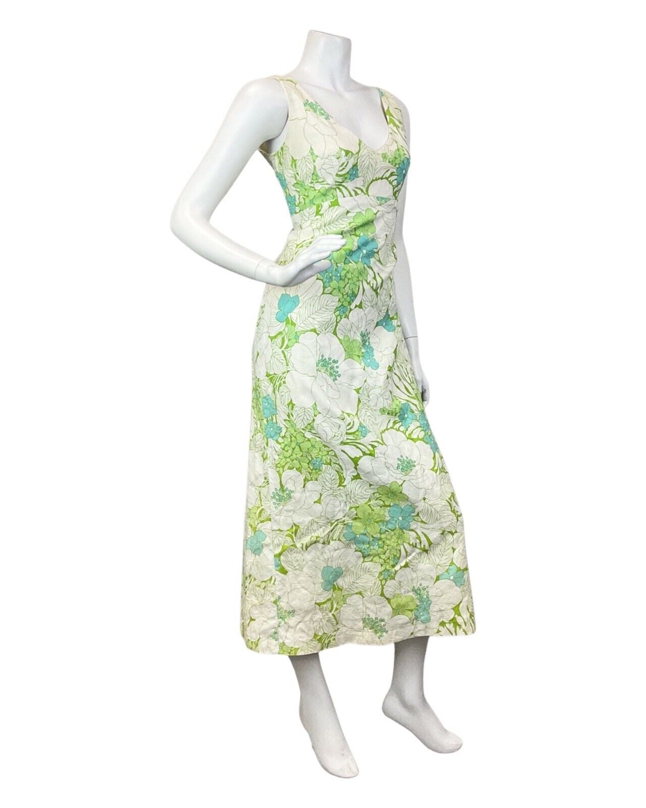 VINTAGE 60s 70s CREAM LIME GREEN FLORAL LEAFY SLEEVELESS MAXI DRESS 10