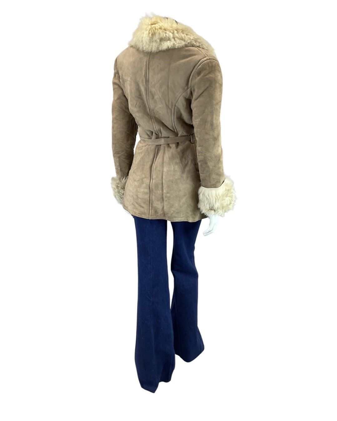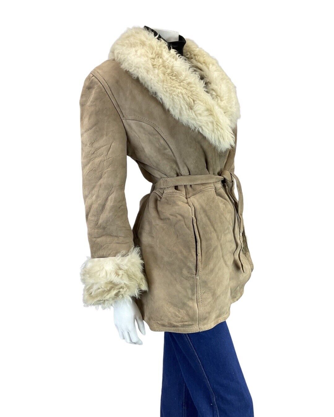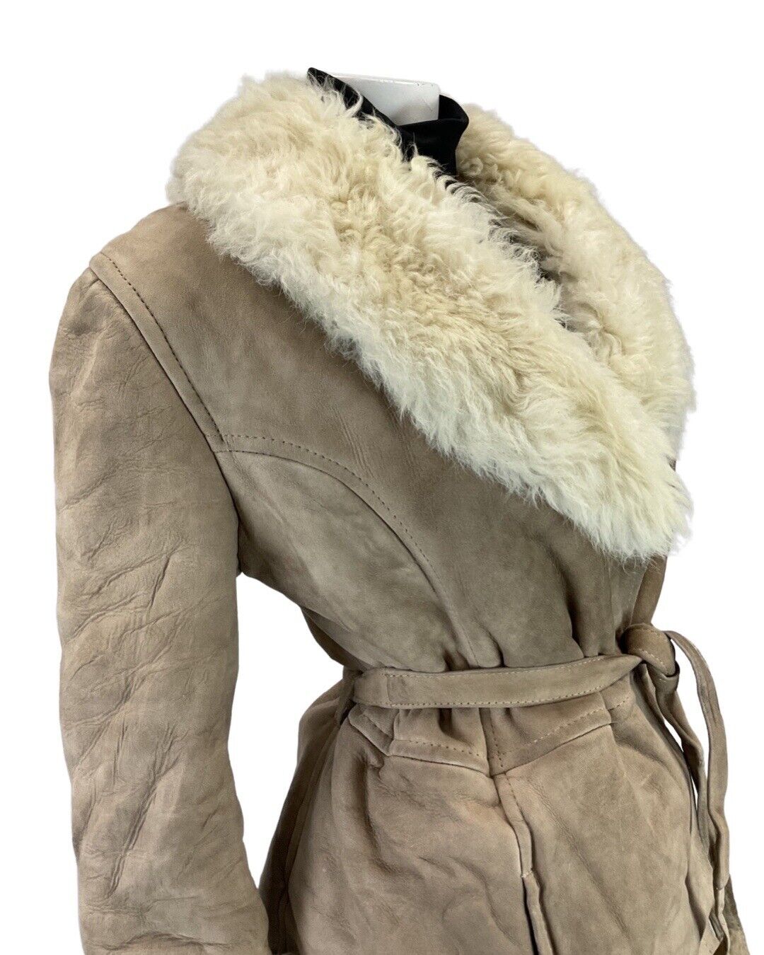 VINTAGE 60s 70s CREAM SAND BROWN BELTED MOD SUEDE SHEARLING WRAP COAT 12 14