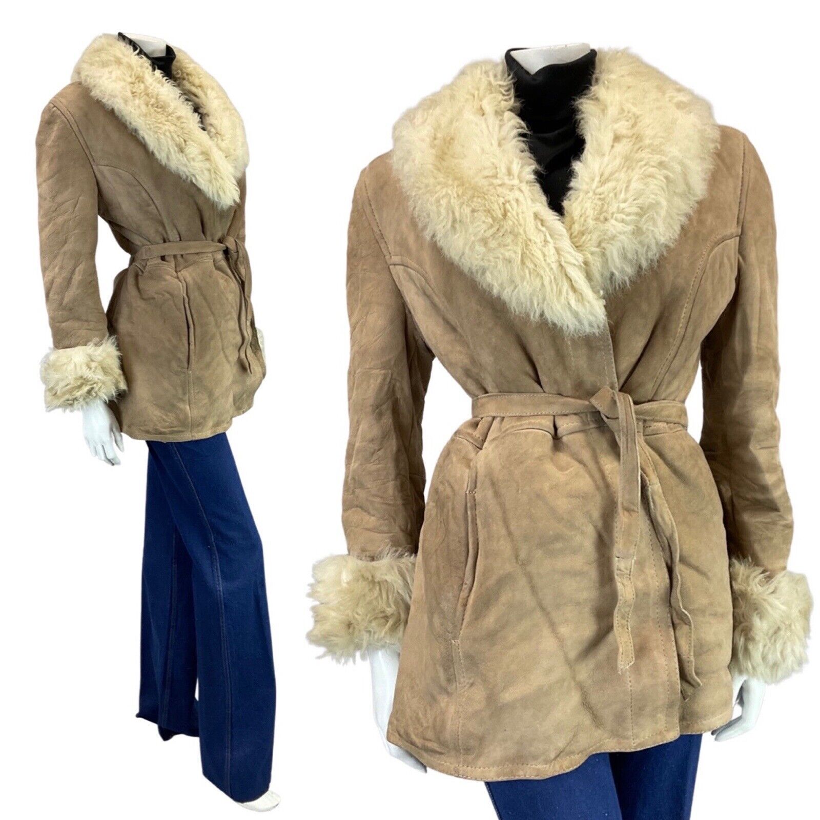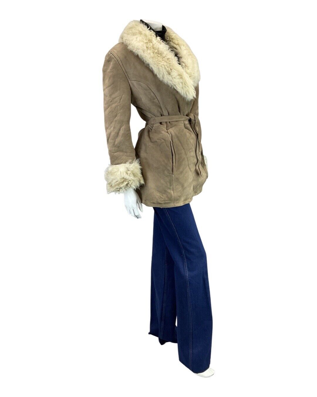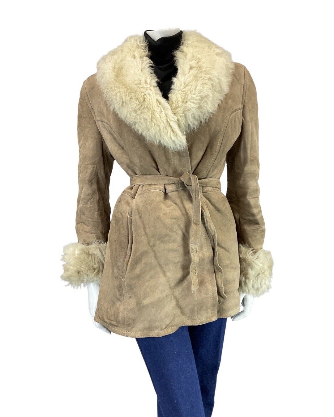 VINTAGE 60s 70s CREAM SAND BROWN BELTED MOD SUEDE SHEARLING WRAP COAT 12 14