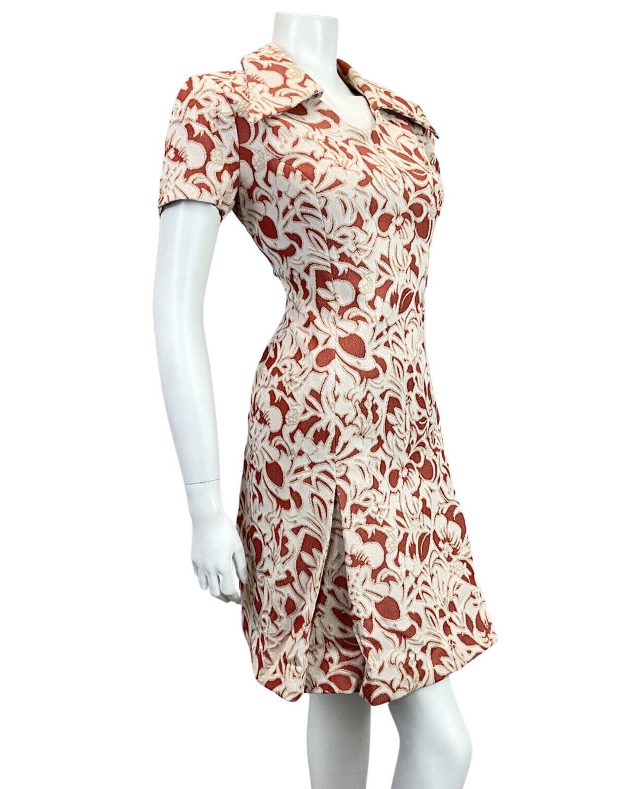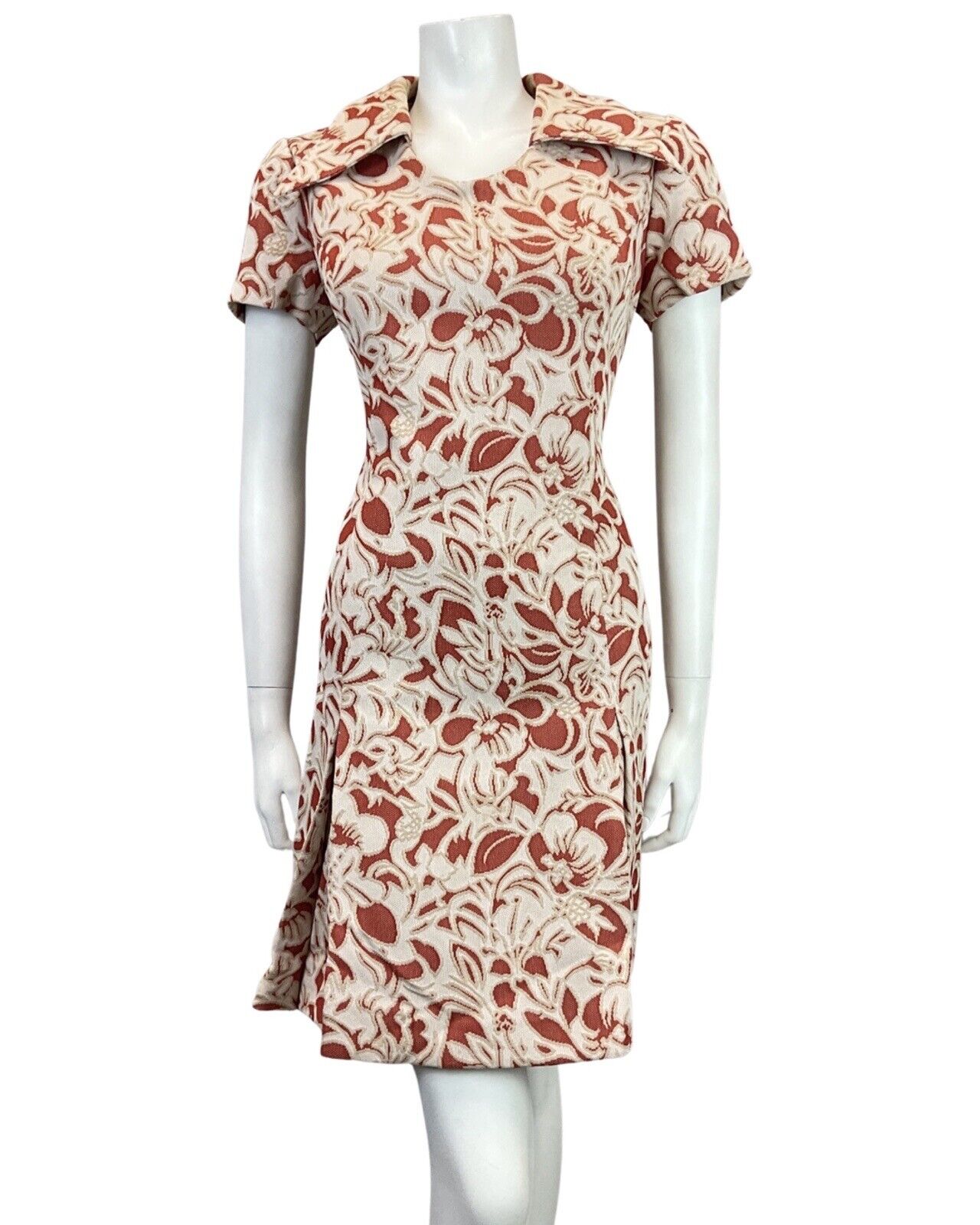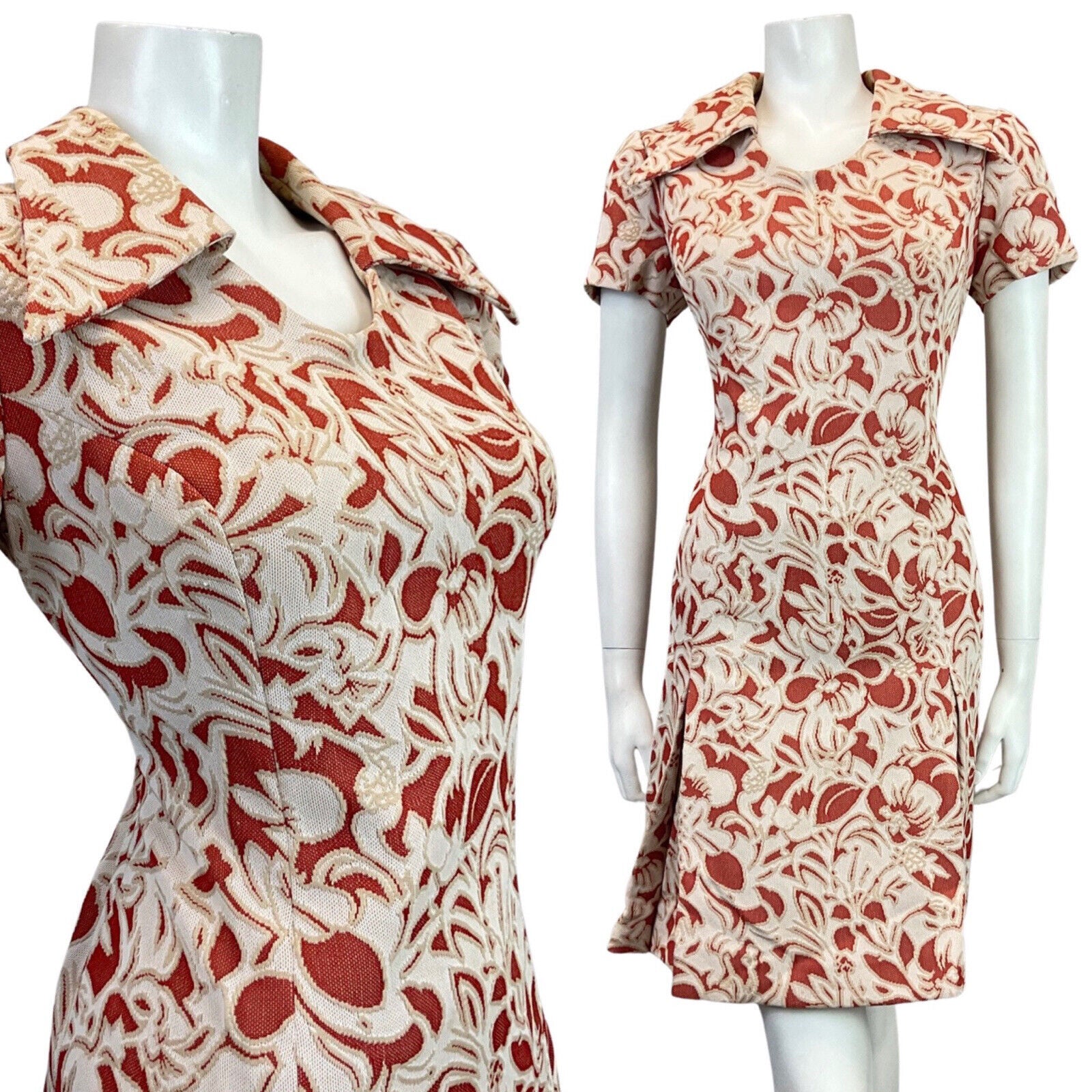 VINTAGE 60s 70s CREAM WHITE RED FLORAL PSYCHEDELIC MOD DAGGER COLLAR DRESS 14