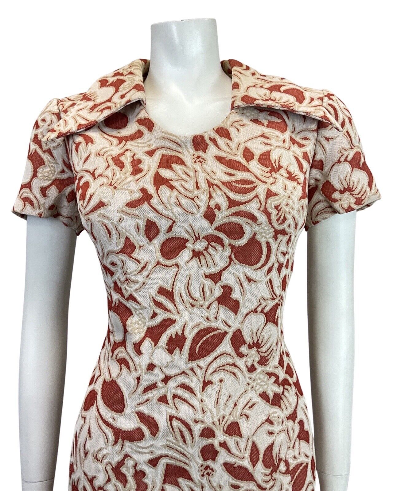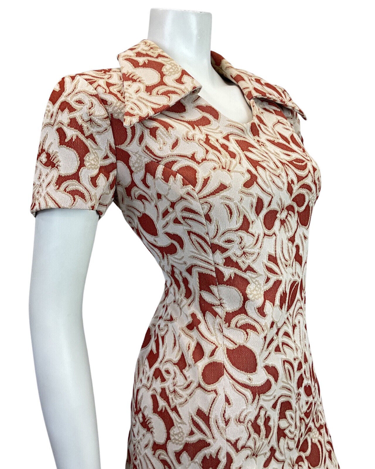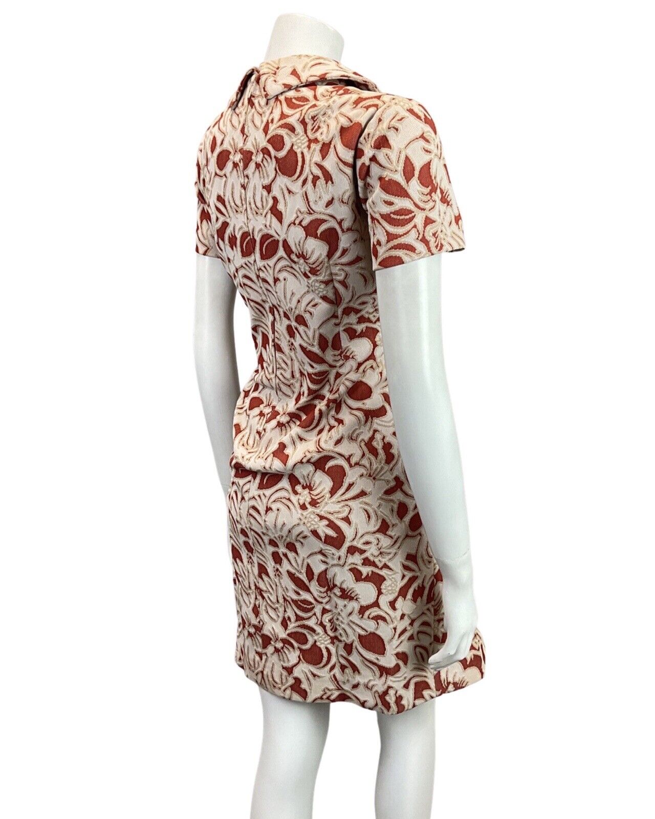 VINTAGE 60s 70s CREAM WHITE RED FLORAL PSYCHEDELIC MOD DAGGER COLLAR DRESS 14