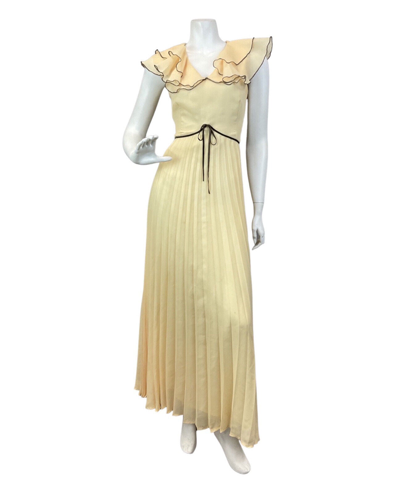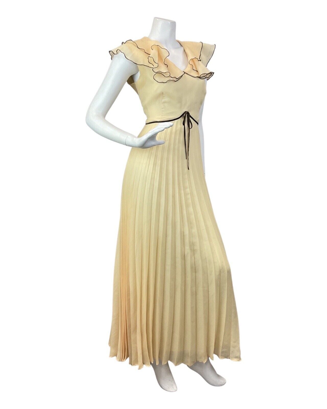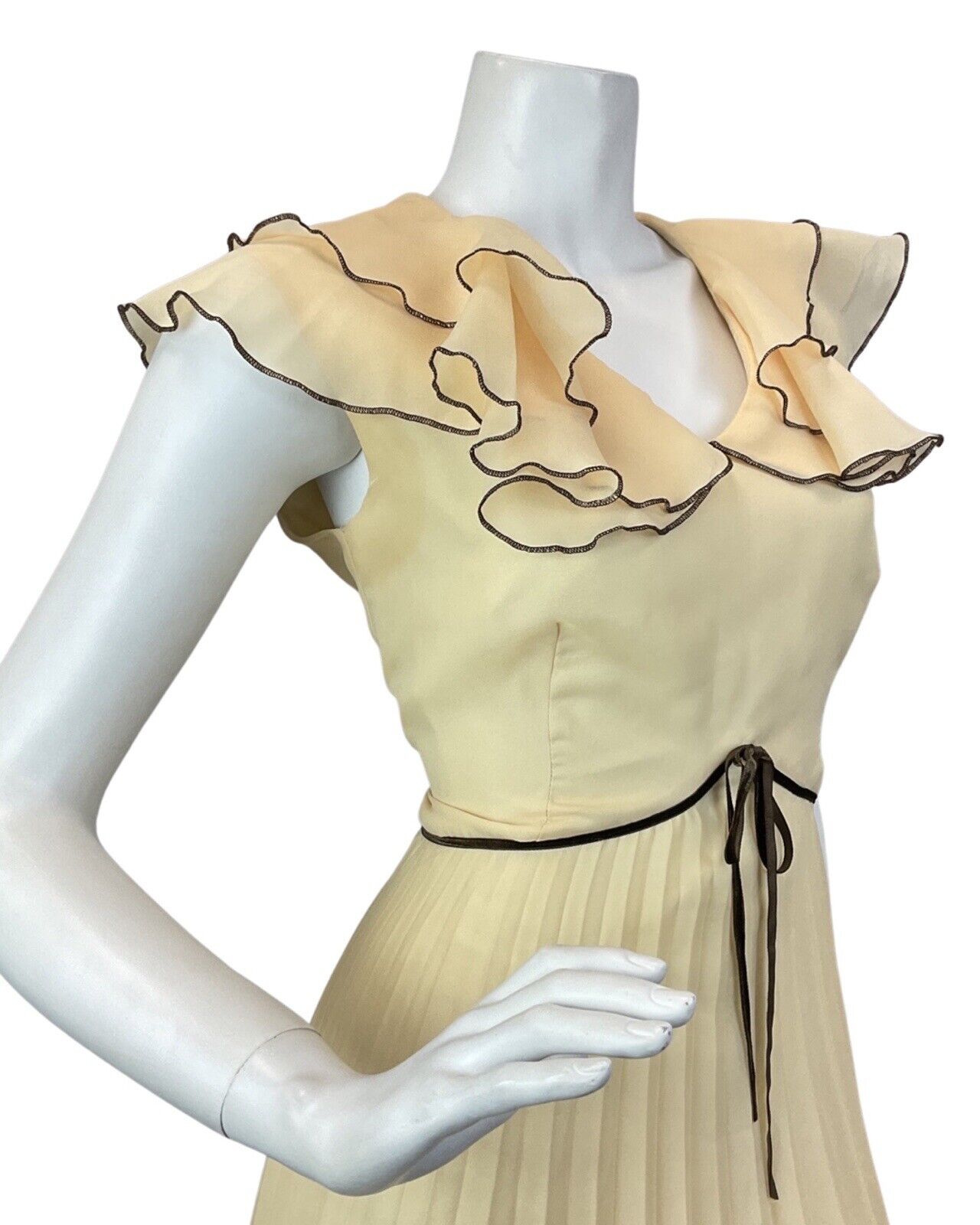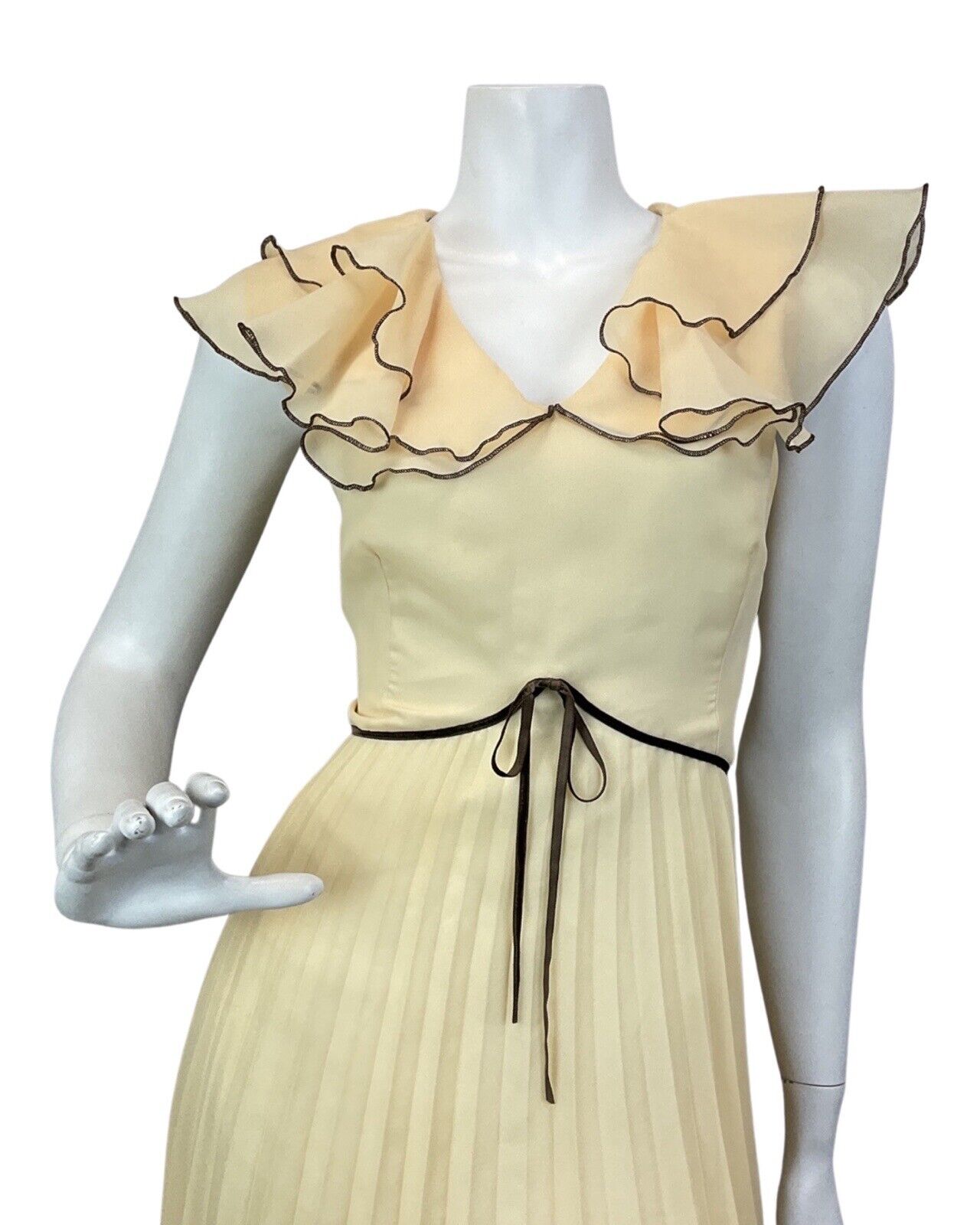 VINTAGE 60s 70s CREAM YELLOW BROWN RUFFLED PLEATED MAXI DRESS 10