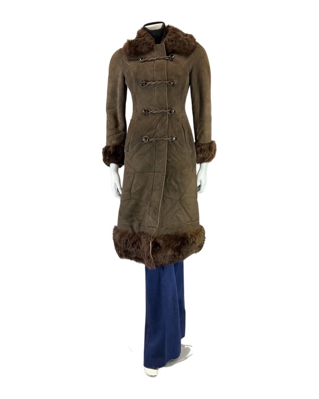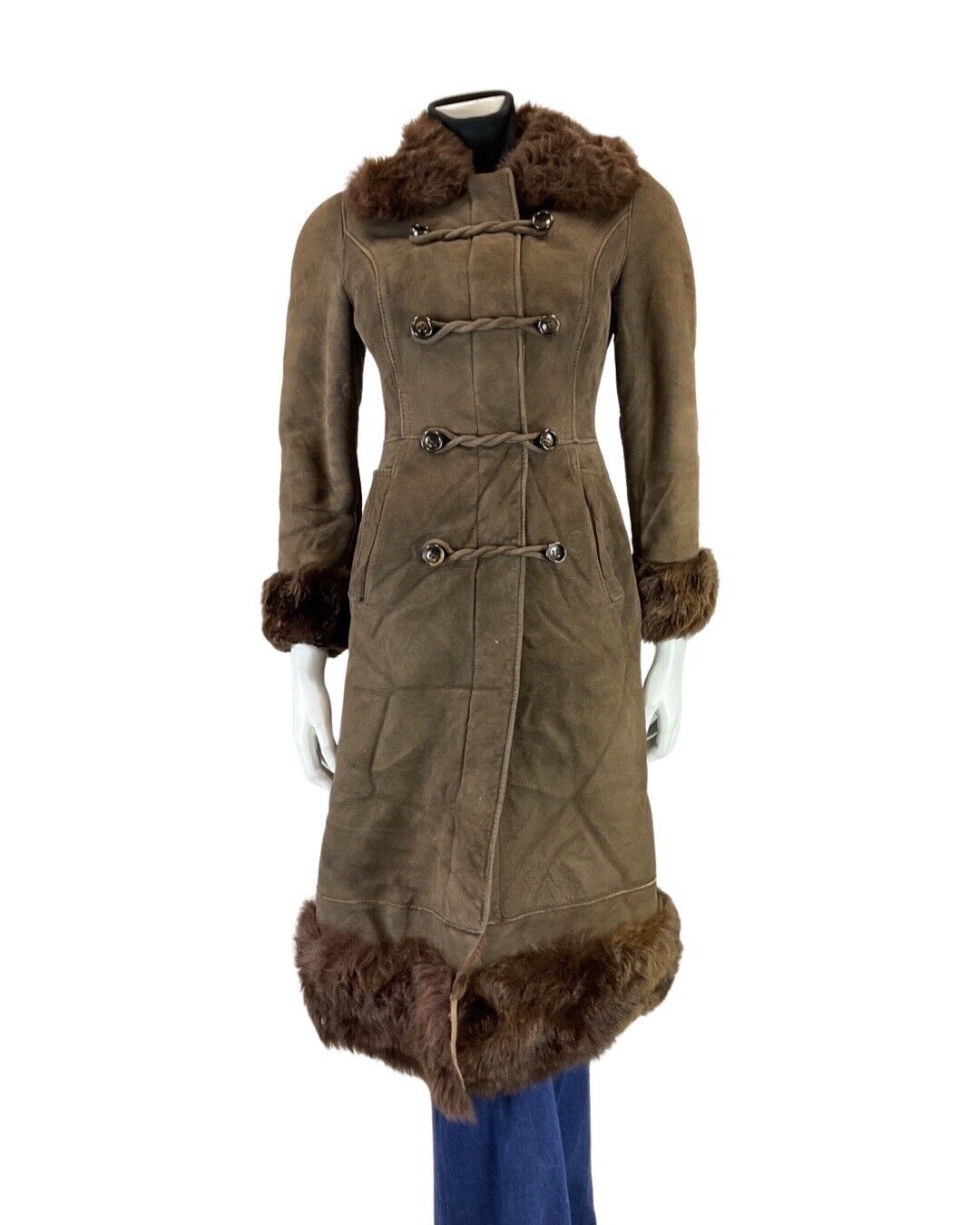 VINTAGE 60s 70s DARK BROWN BROCADE PRINCESS LONG SHEARLING COAT 6 8