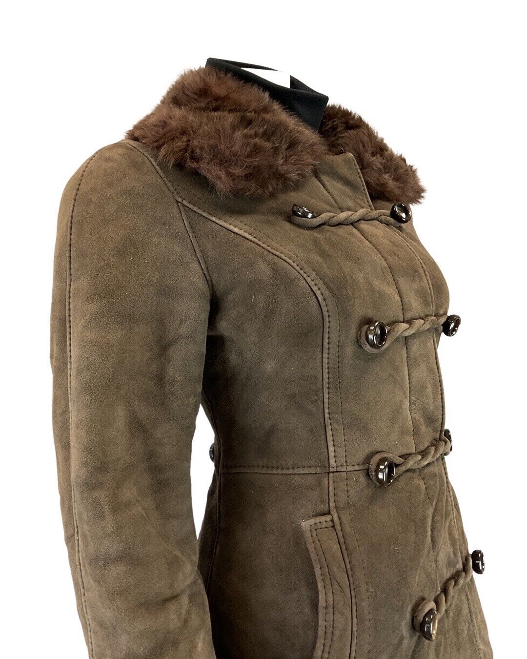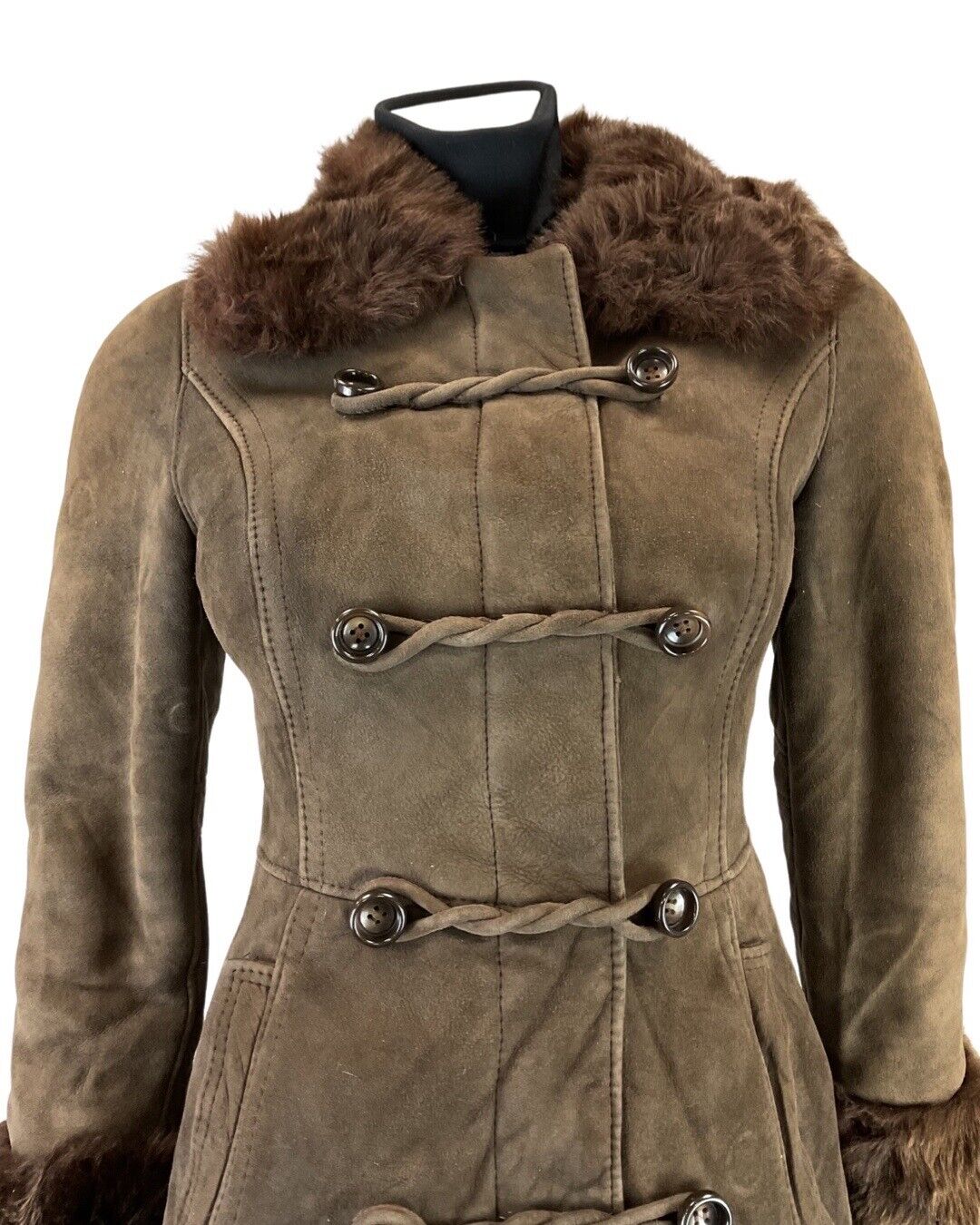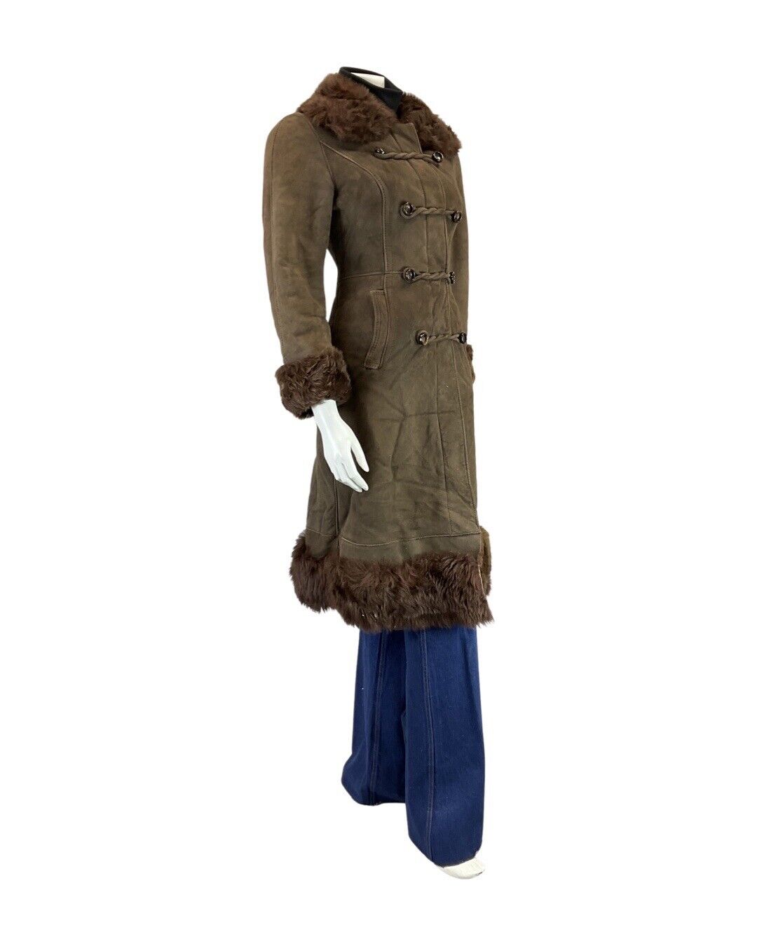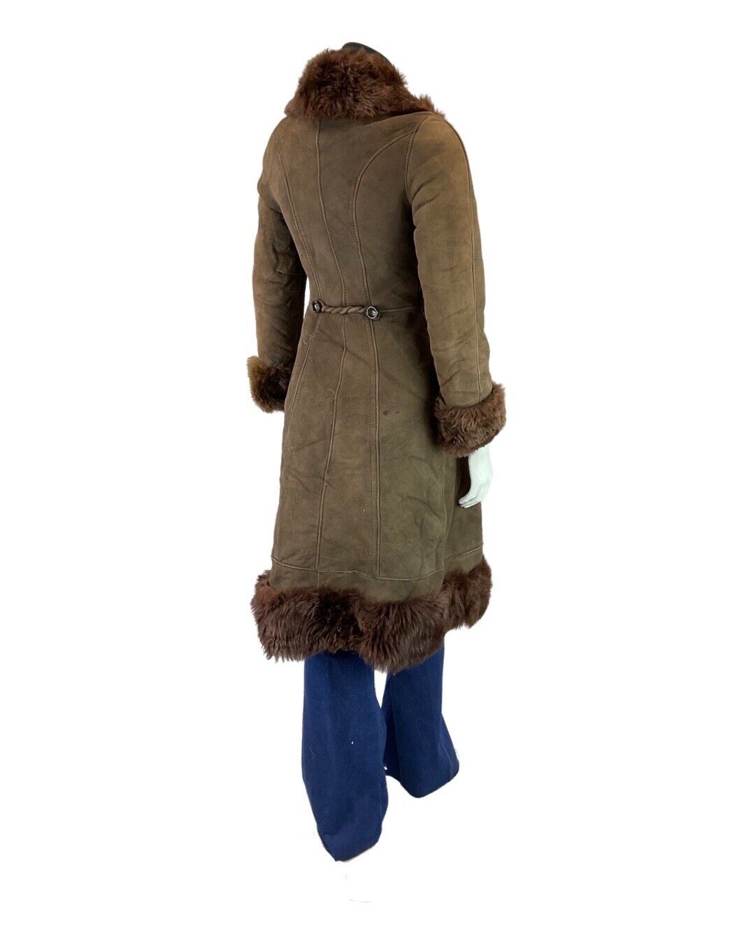 This is a gorgeous vintage long coat made from a heavy, brown, suede leather sheepskin fabric with a soft fluffy lining throughout to keep you warm and cosy throughout the cooler seasons. |