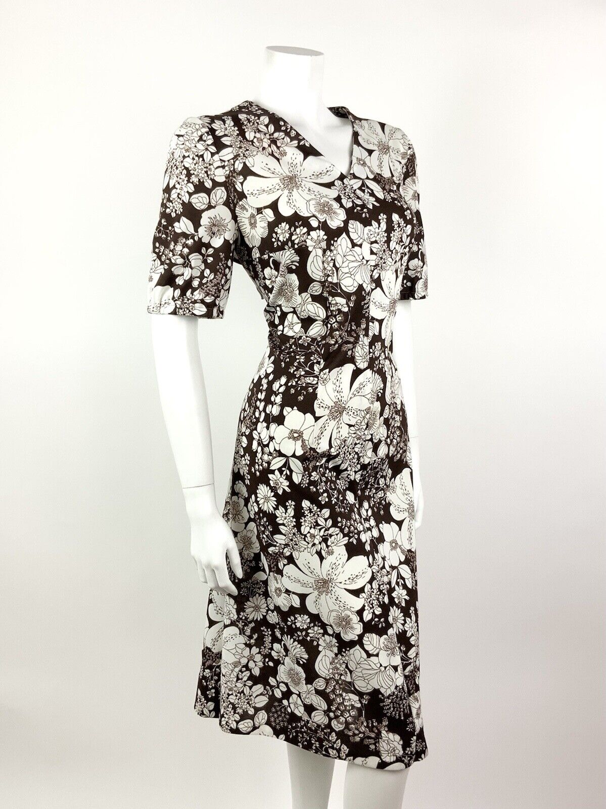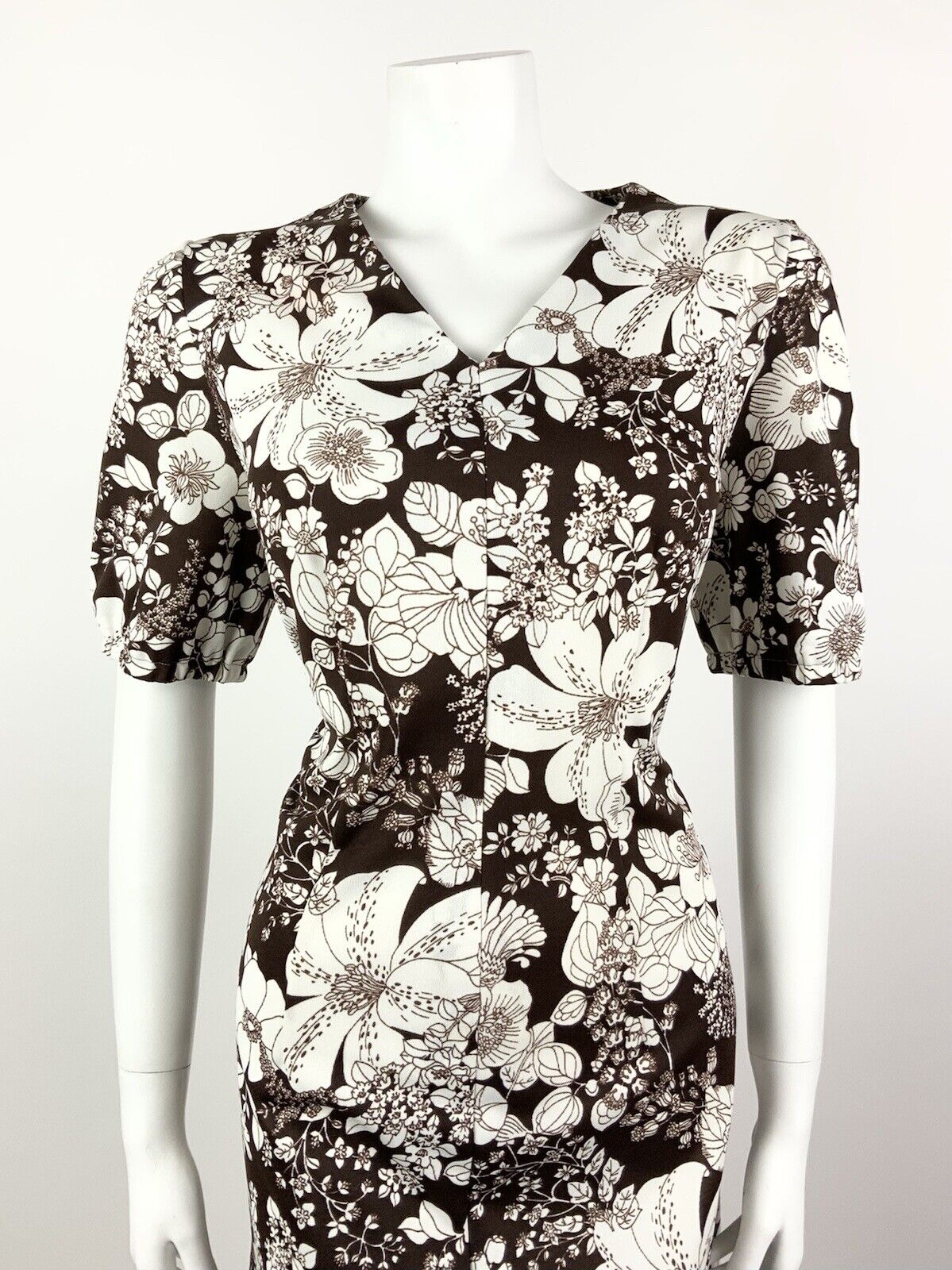 VINTAGE 60s 70s DEEP BROWN WHITE FLORAL BOTANICAL SUMMER DRESS 16 18