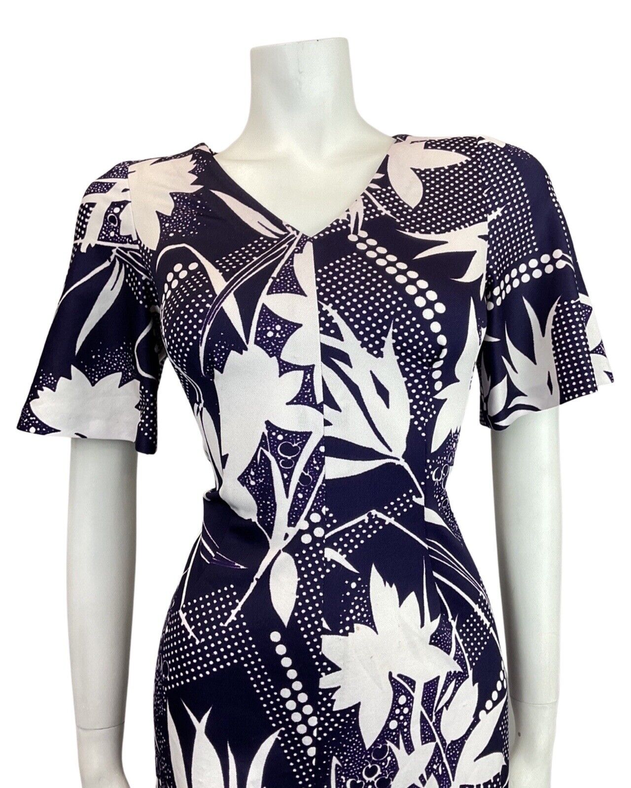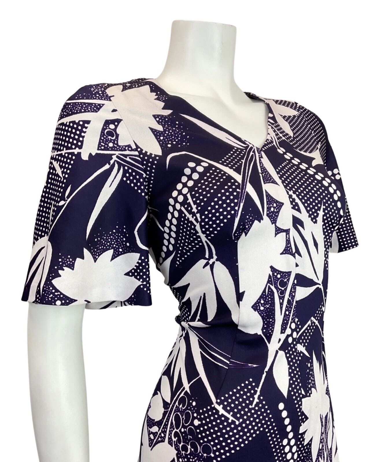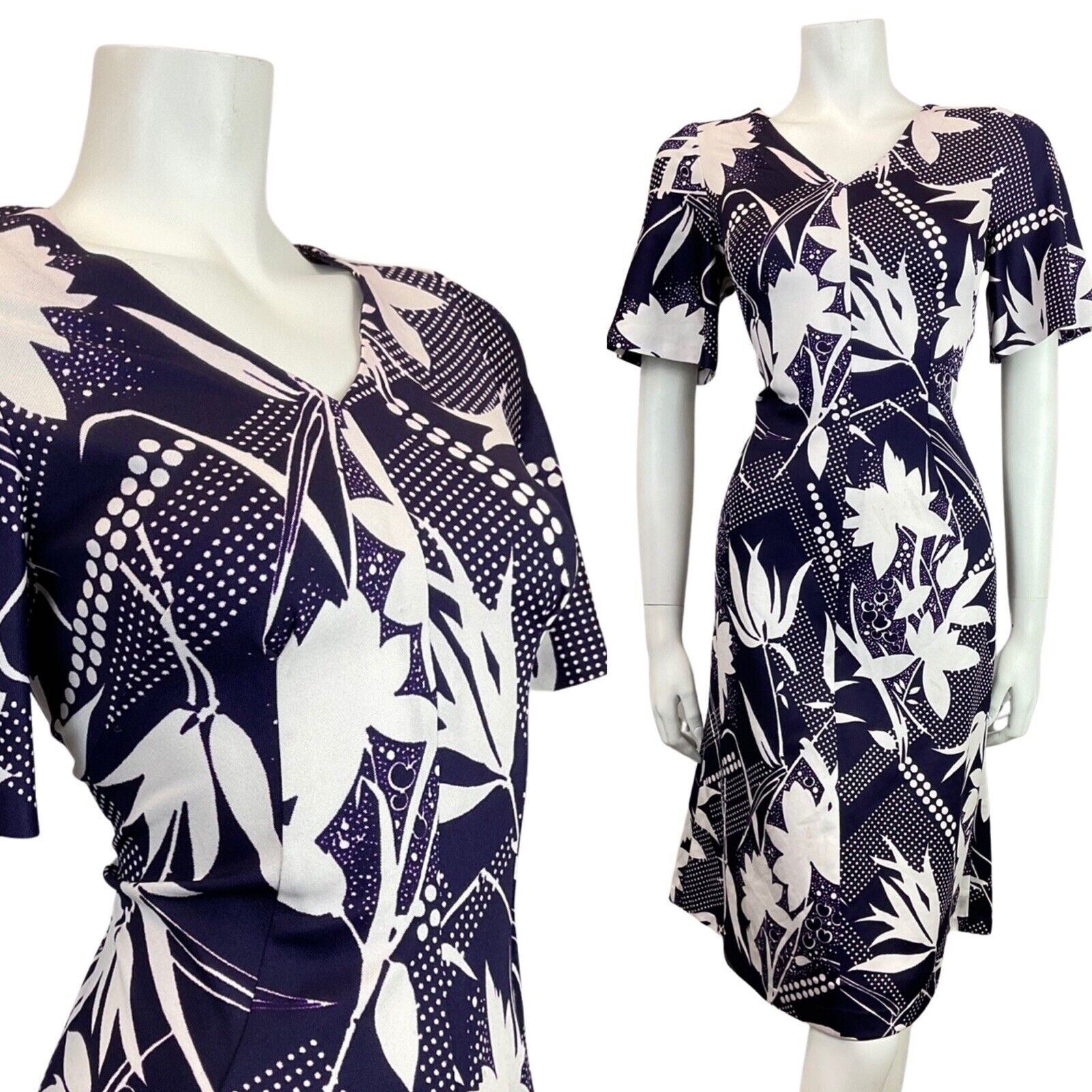 VINTAGE 60s 70s DEEP PURPLE WHITE FLORAL LEAFY DOTTY MOD SHORT DRESS 10 12