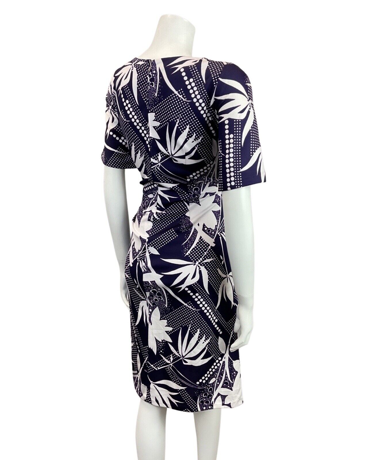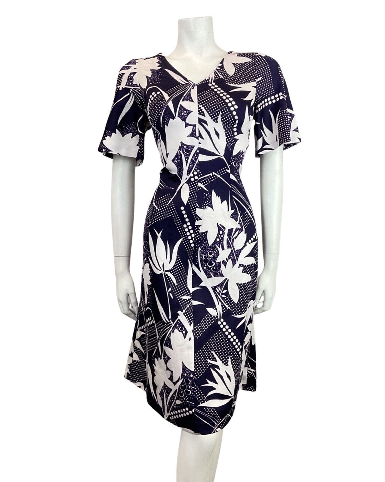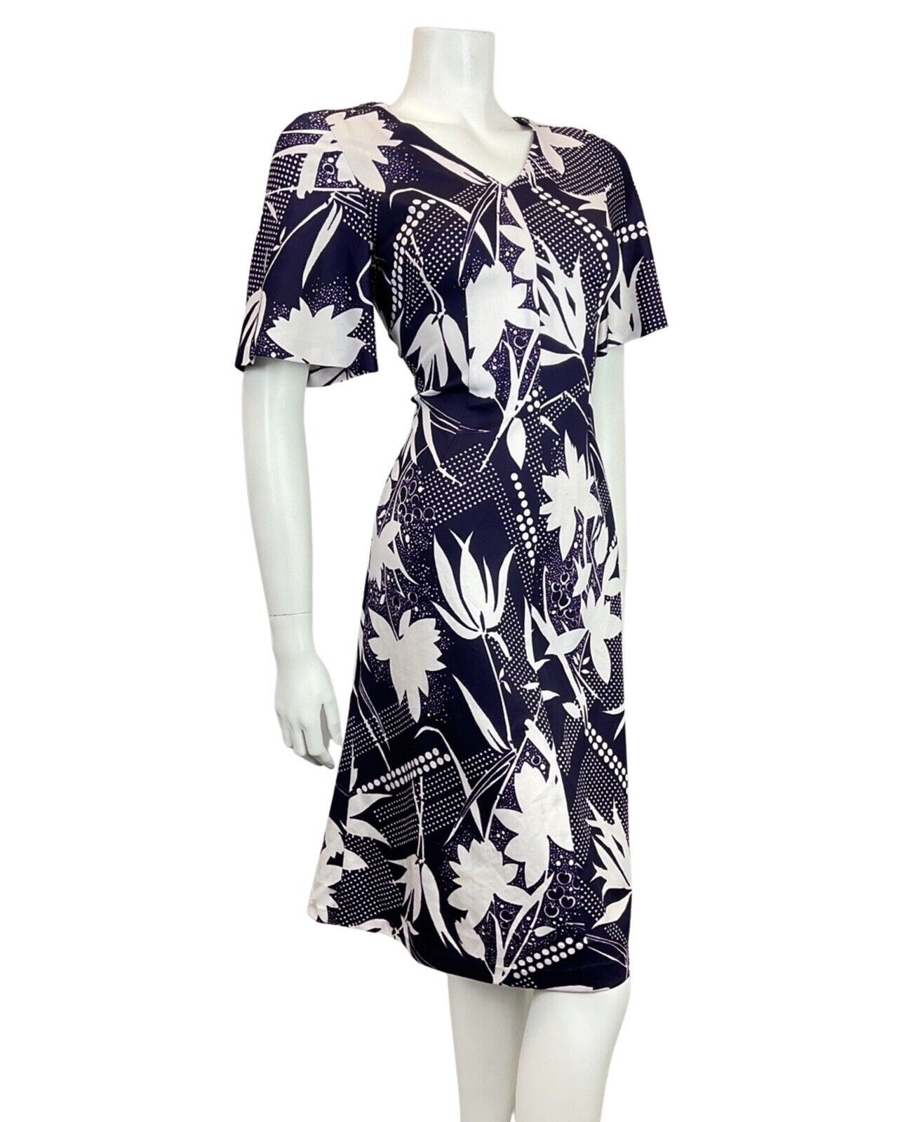 VINTAGE 60s 70s DEEP PURPLE WHITE FLORAL LEAFY DOTTY MOD SHORT DRESS 10 12