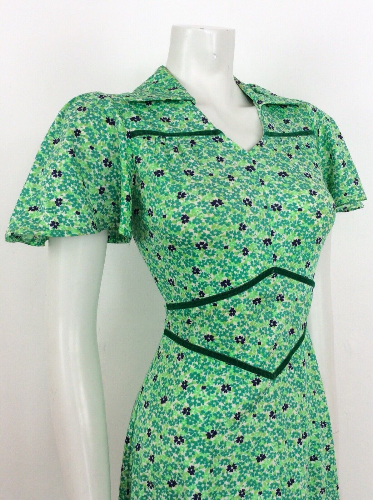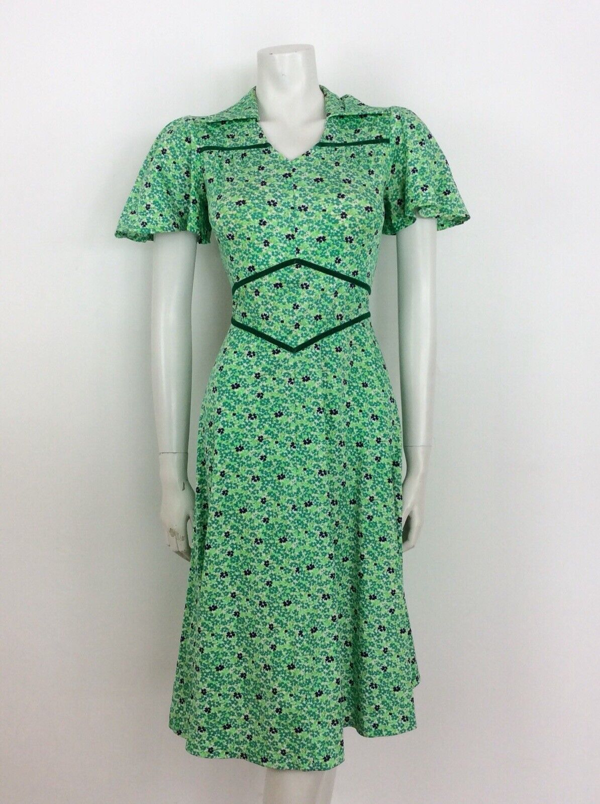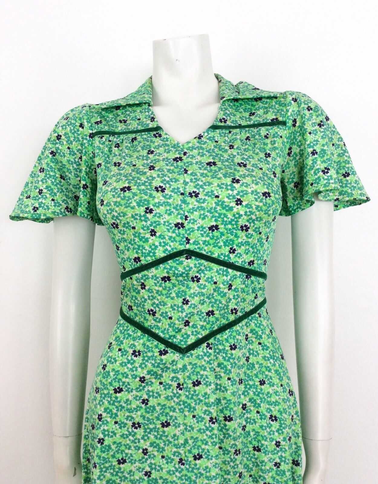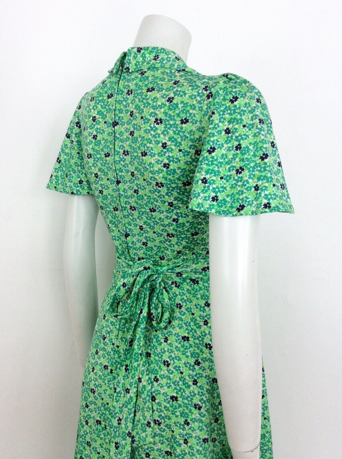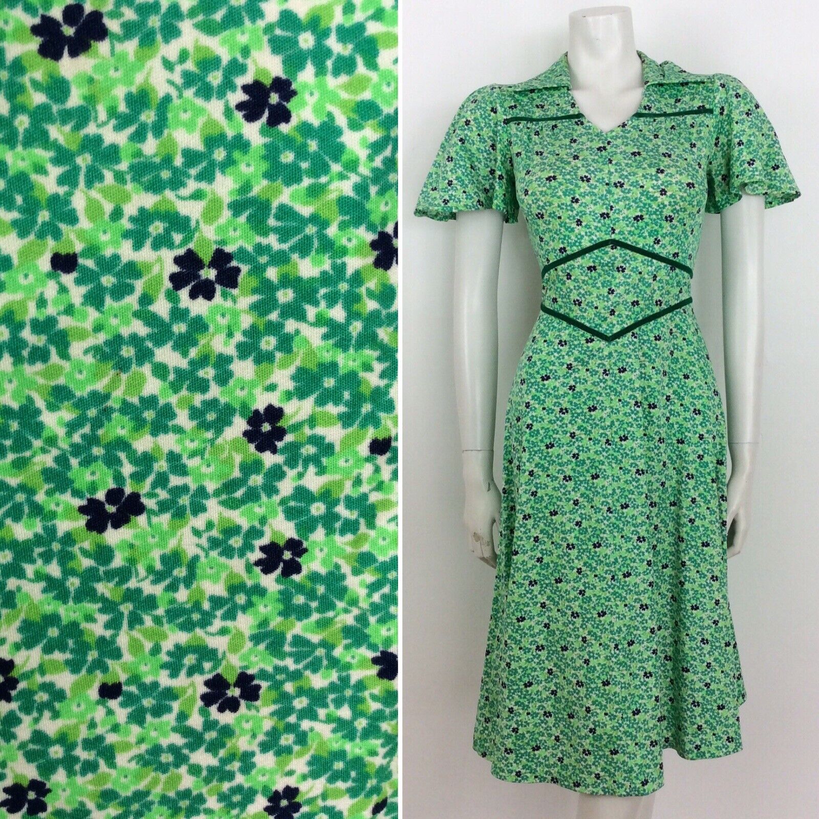 VINTAGE 60s 70s DITSY FLORAL DRESS FLUTTER SLEEVE GREEN BLUE WHITE 8 10