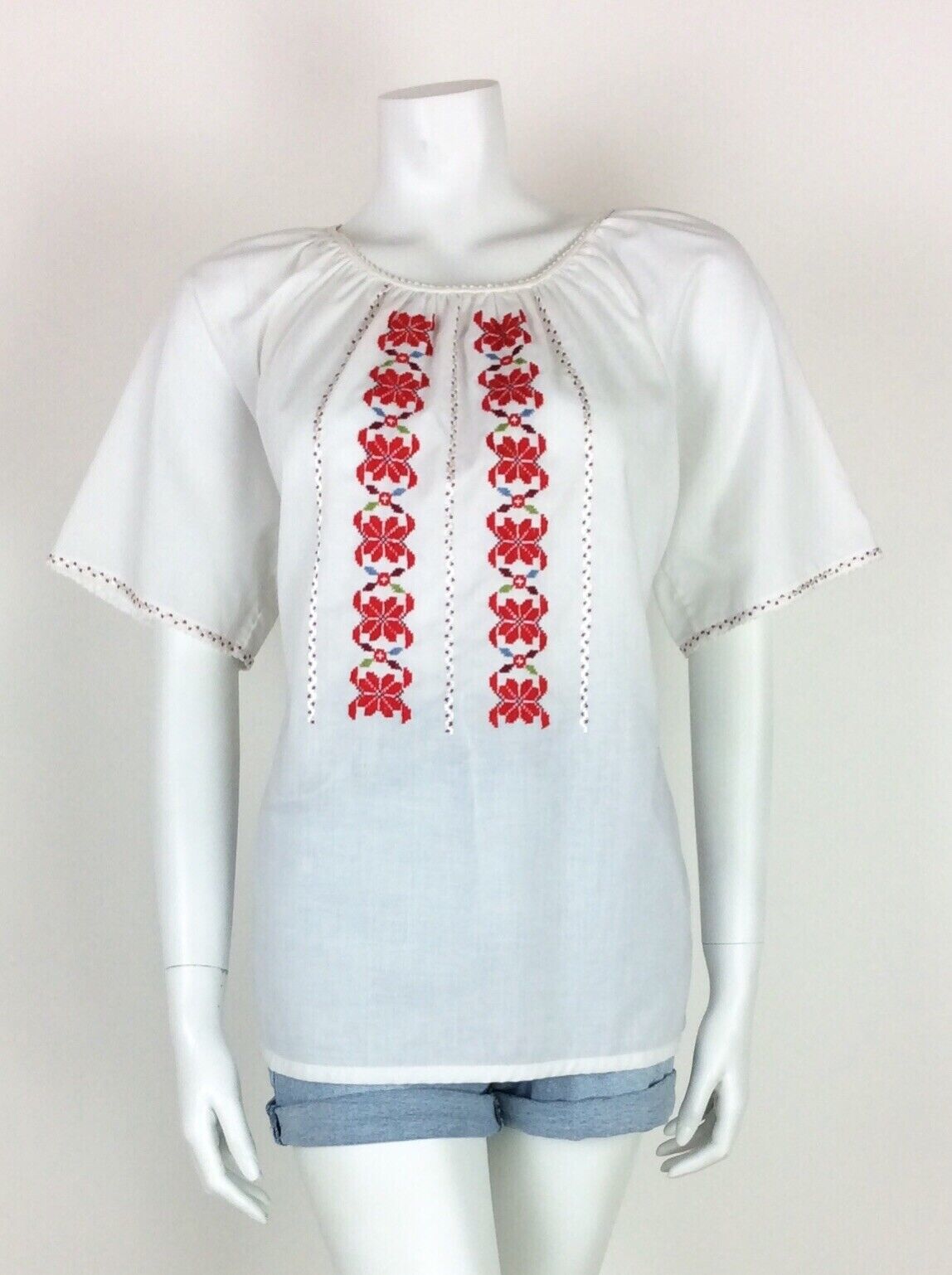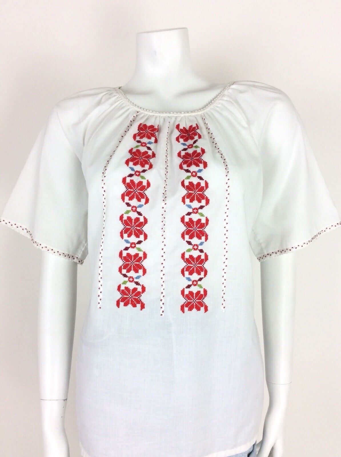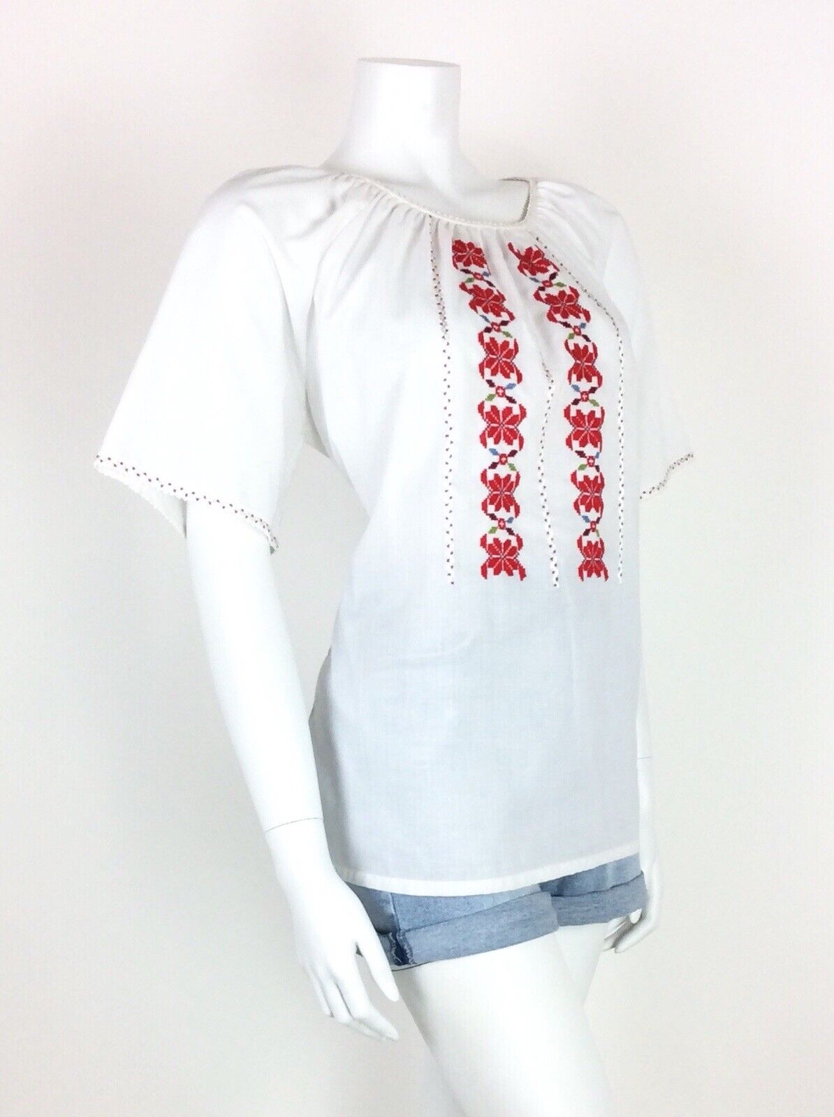 VINTAGE 60s 70s ETHNIC BLOUSE WHITE RED FLORAL CROSS STITCH HIPPY 12 14