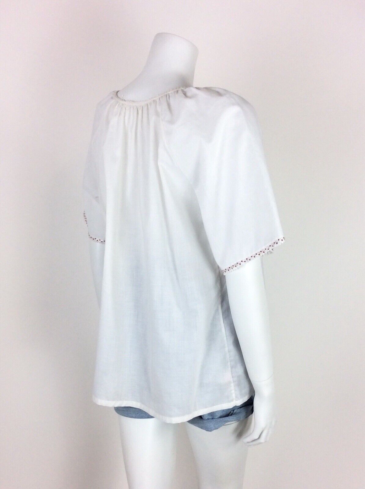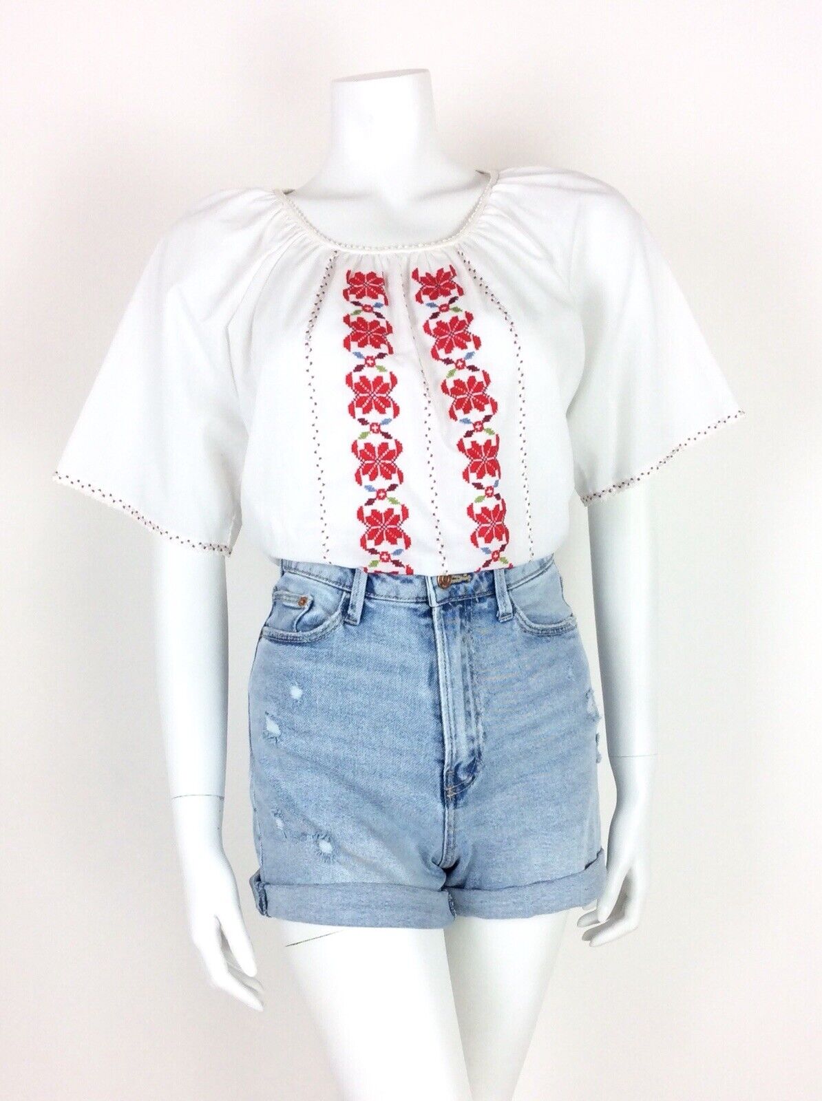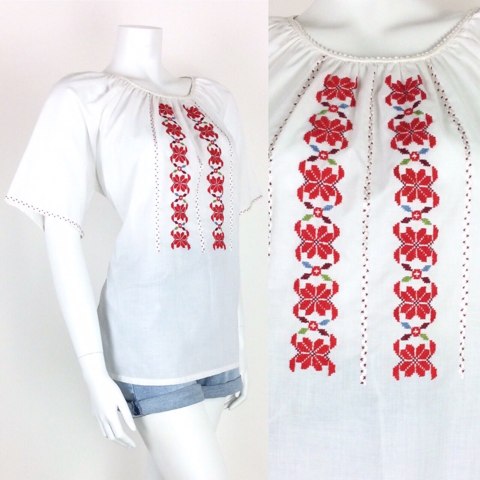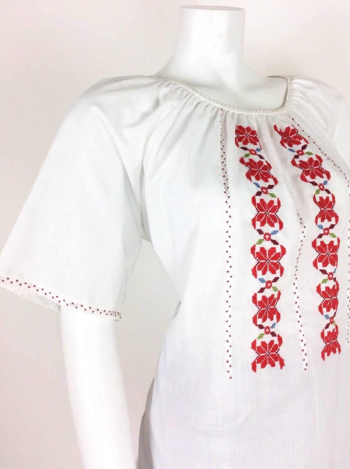 VINTAGE 60s 70s ETHNIC BLOUSE WHITE RED FLORAL CROSS STITCH HIPPY 12 14