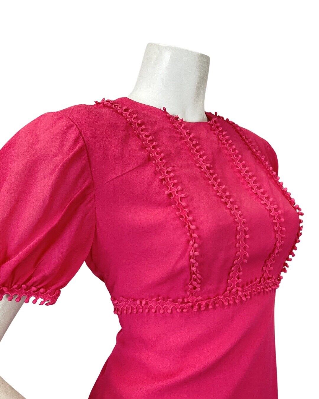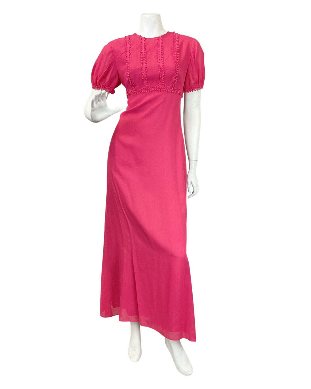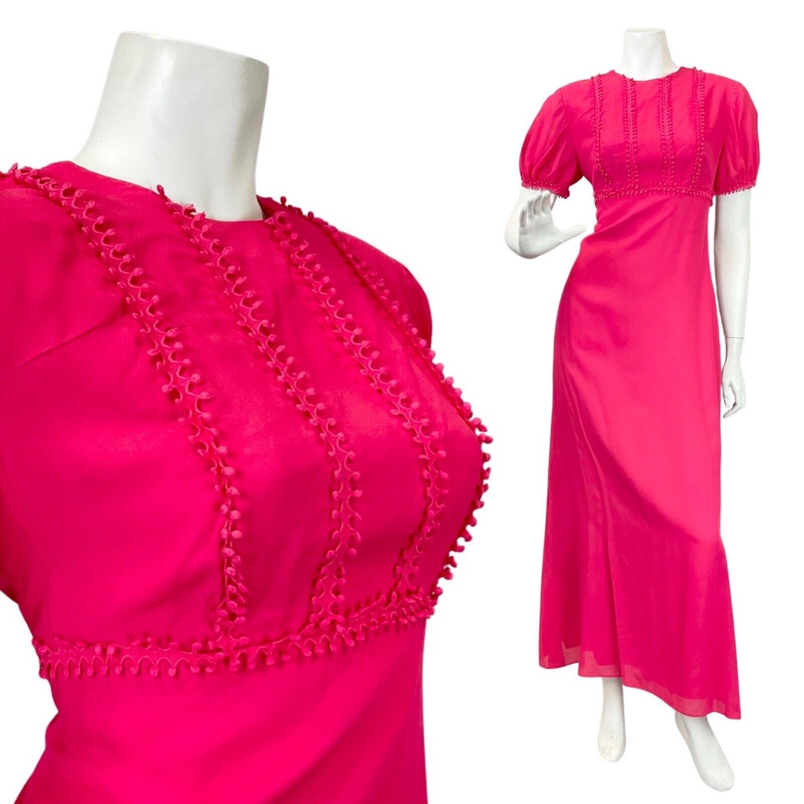 VINTAGE 60s 70s FUCHSIA PINK POM-POM MOD PUFF SLEEVE MAXI DRESS 12