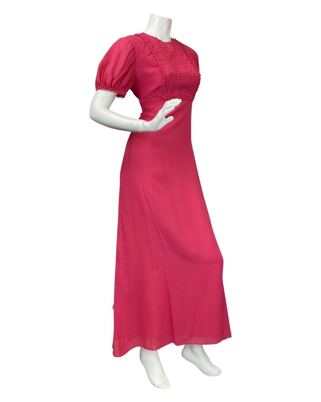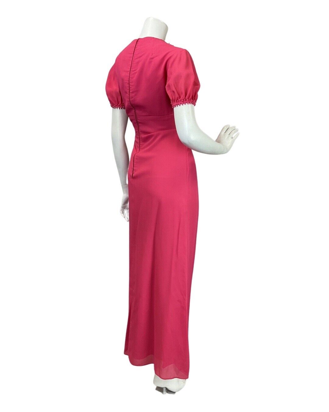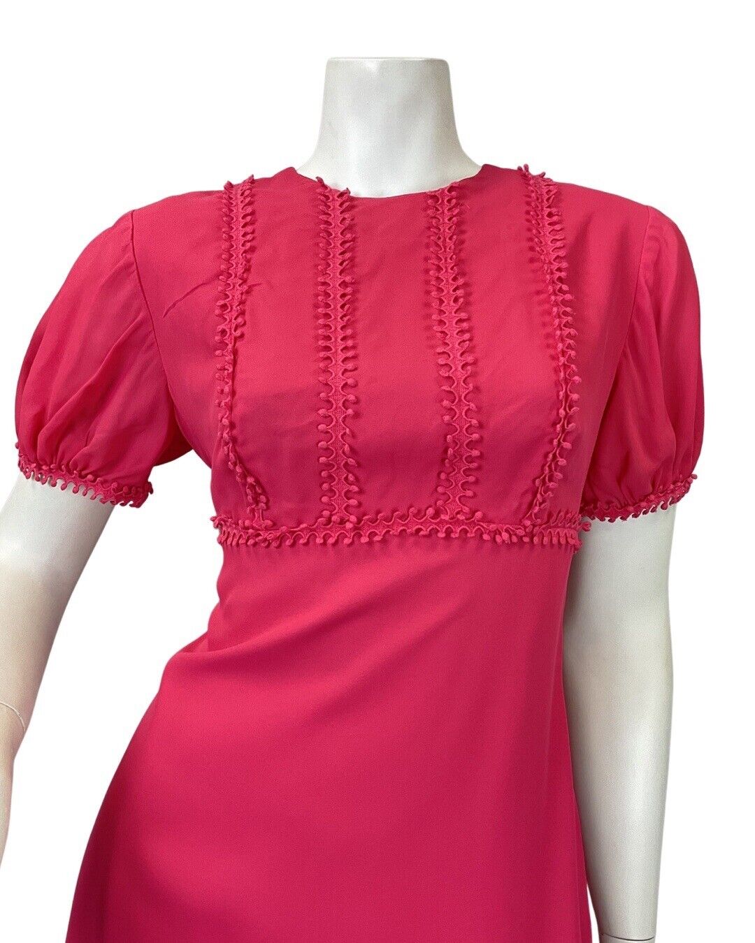 VINTAGE 60s 70s FUCHSIA PINK POM-POM MOD PUFF SLEEVE MAXI DRESS 12