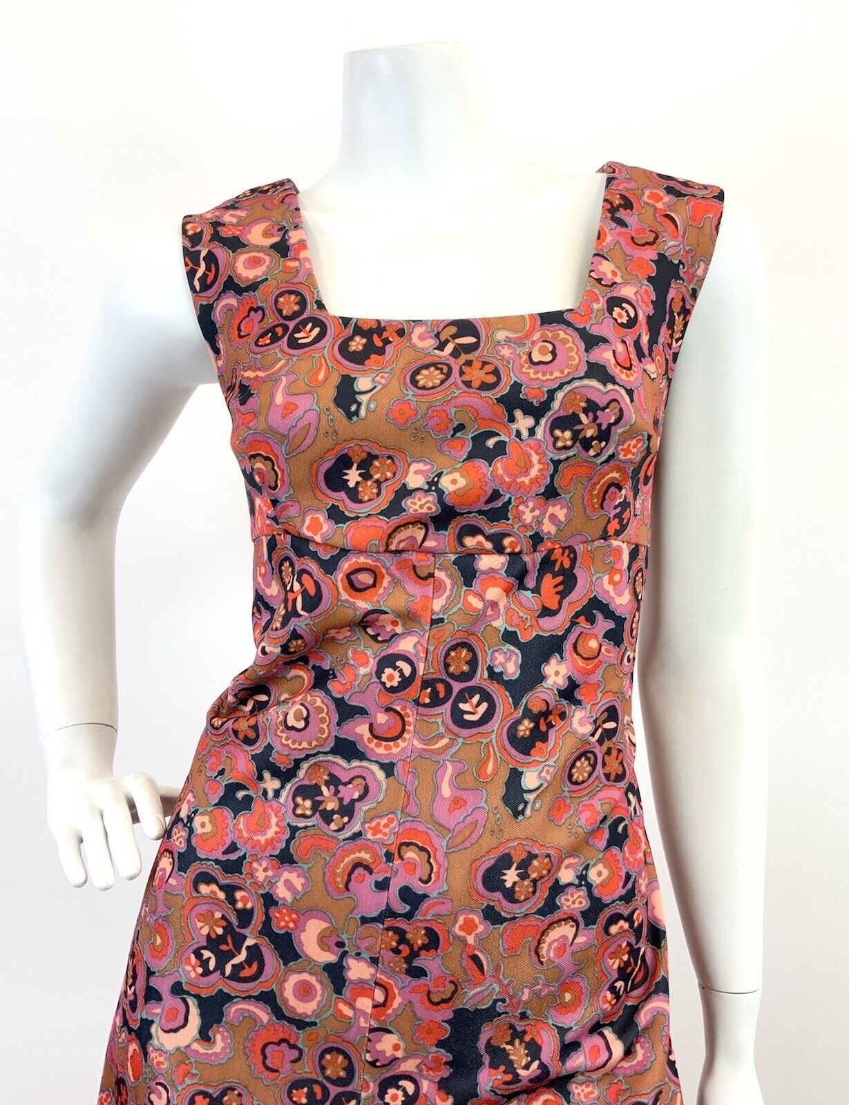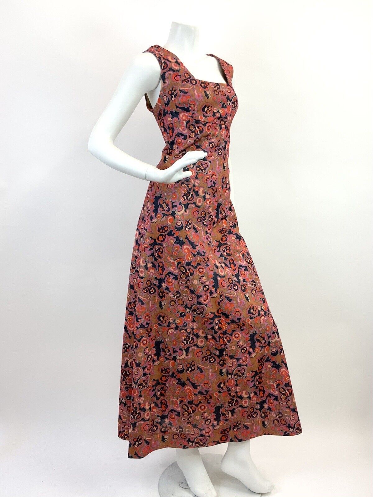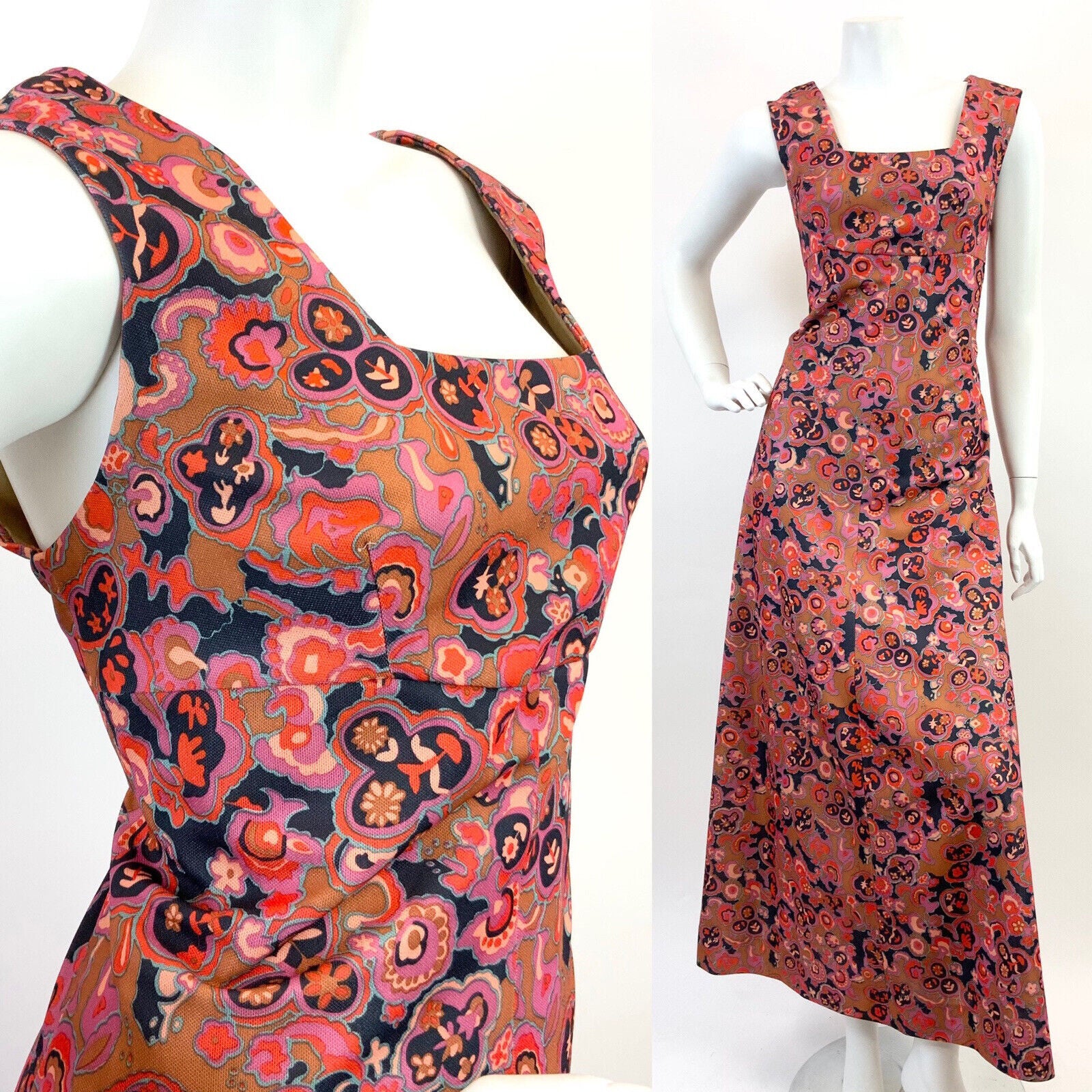 VINTAGE 60s 70s GOLD PINK BLUE PSYCHEDELIC FLORAL EMPIRE MOD MAXI DRESS 12 14
