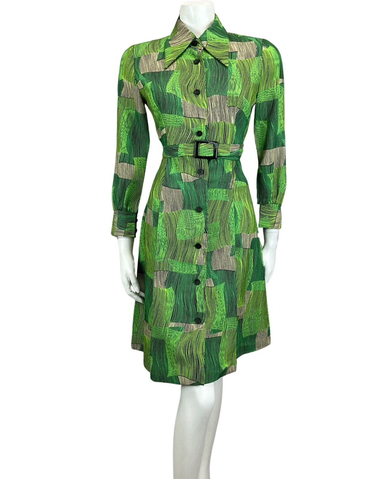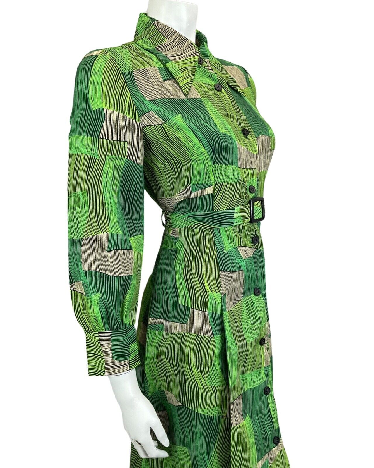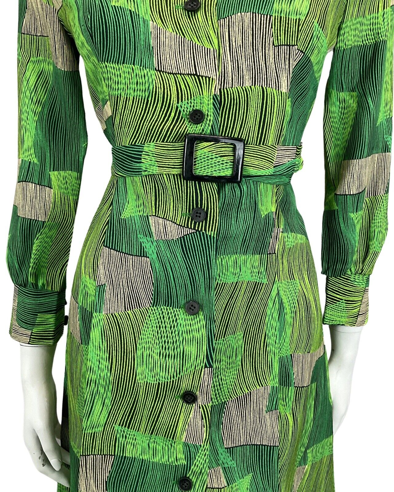 VINTAGE 60s 70s GREEN ABSTRACT PRINT DAGGER COLLAR MIDI MOD BOHO DRESS 12
