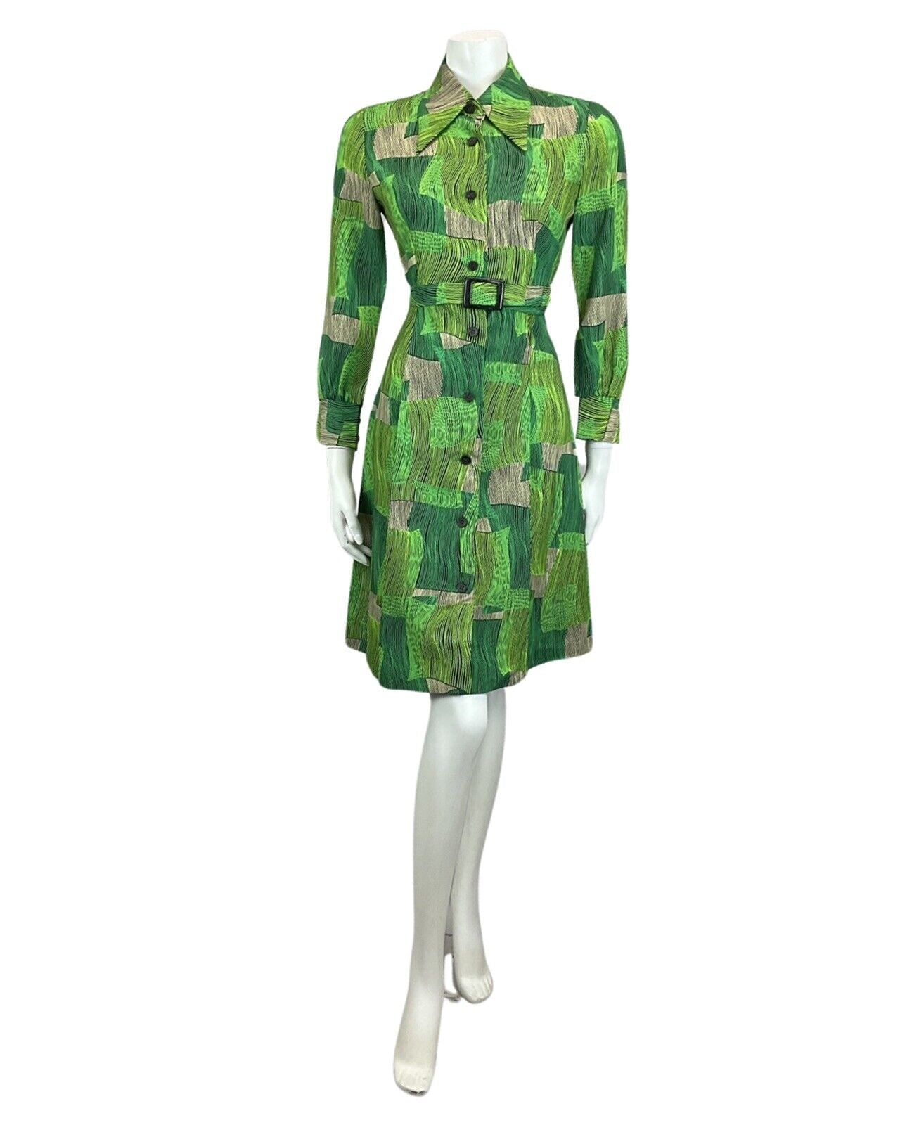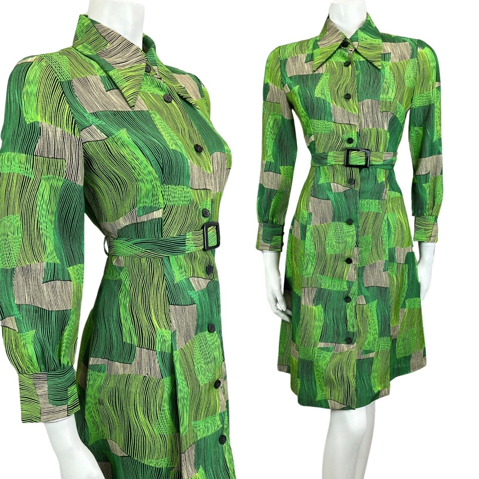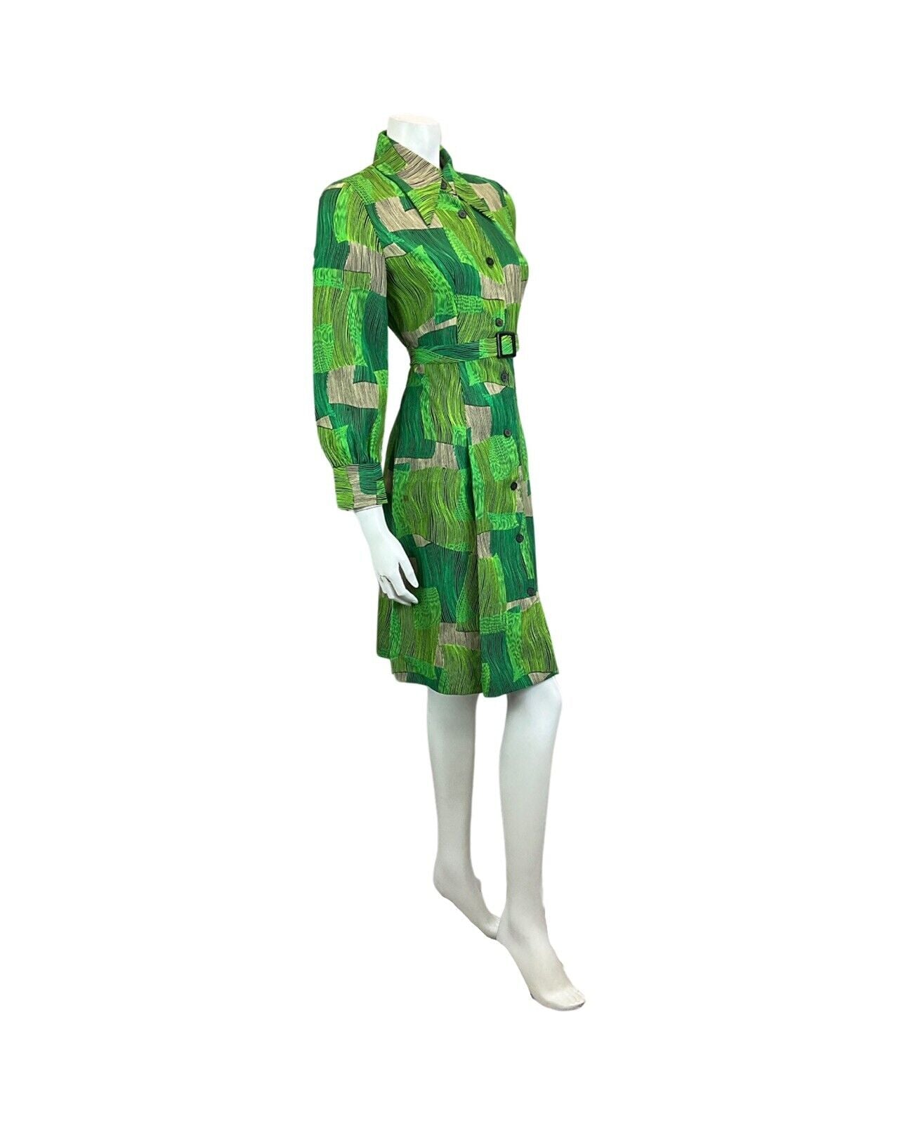 VINTAGE 60s 70s GREEN ABSTRACT PRINT DAGGER COLLAR MIDI MOD BOHO DRESS 12