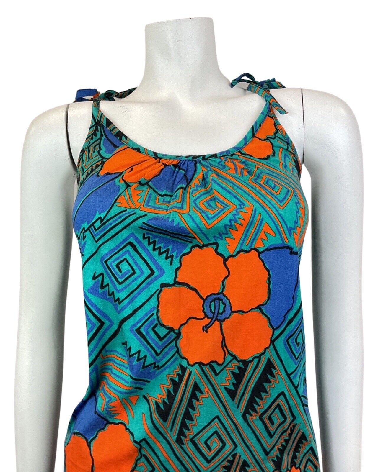 VINTAGE 60s 70s GREEN BLUE ORANGE HAWAIIAN FLORAL GEOMETRIC SUN DRESS 10