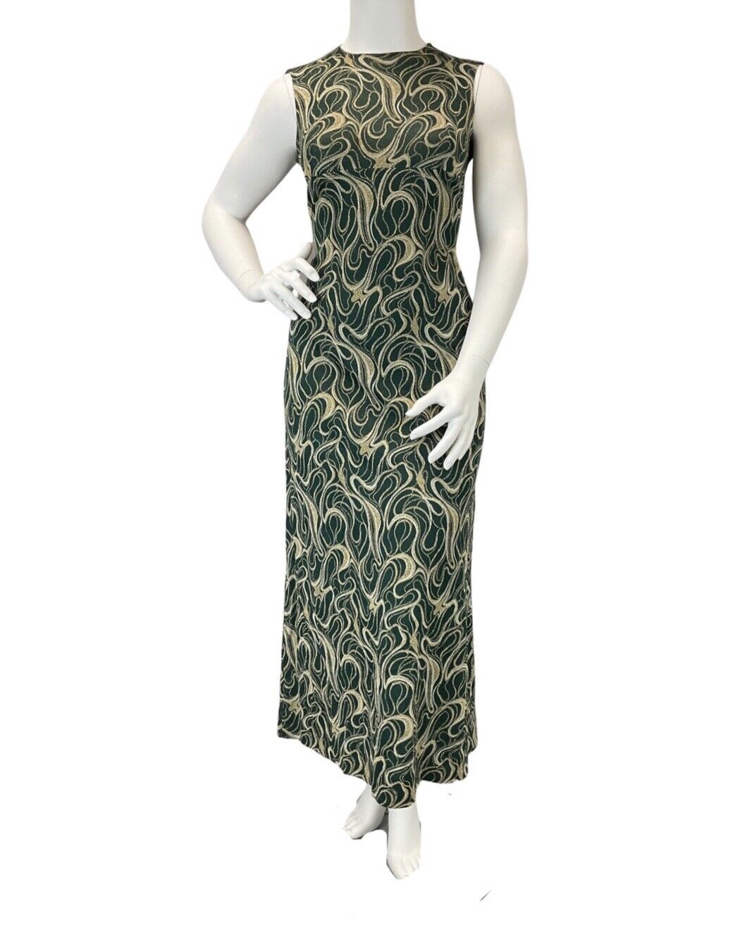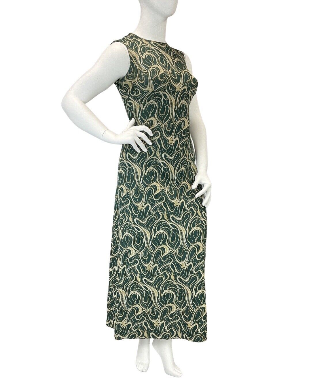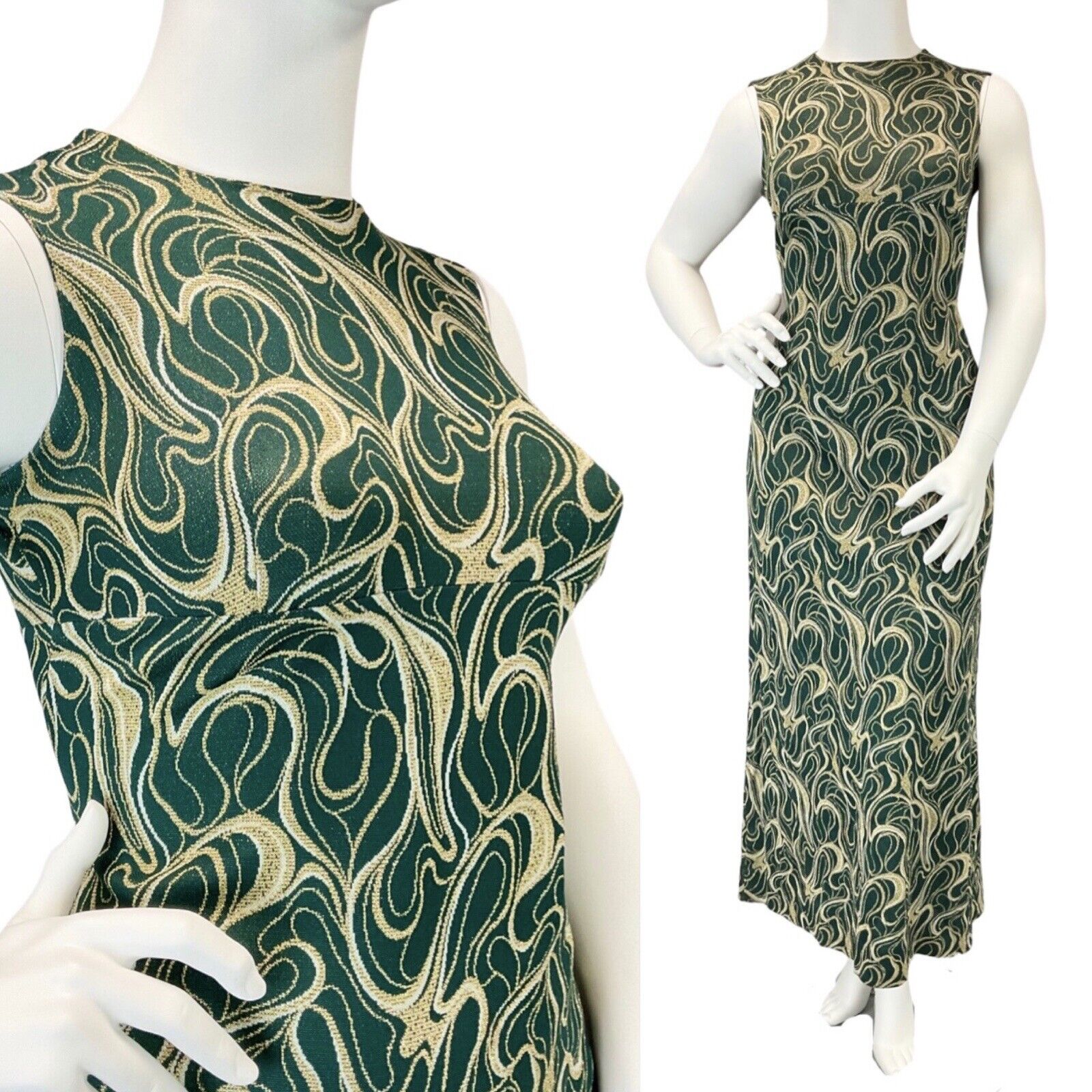 VINTAGE 60s 70s GREEN GOLD WHITE SWIRLING STUDIO 54 SLEEVELESS MAXI DRESS 14 16