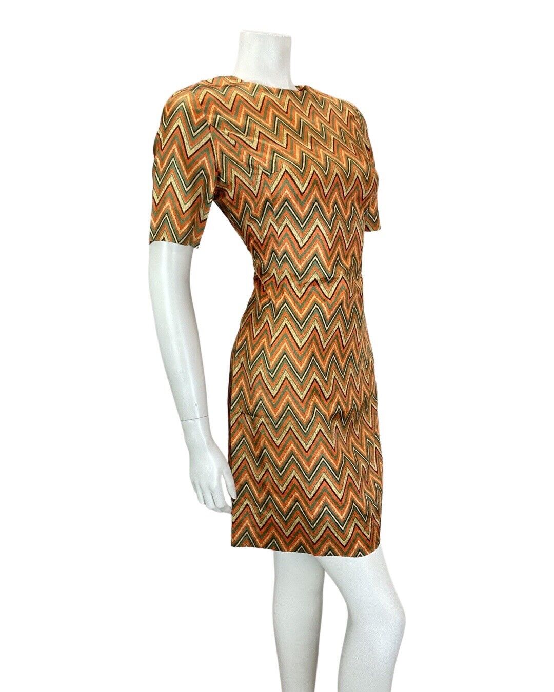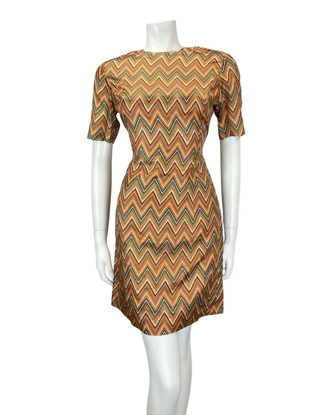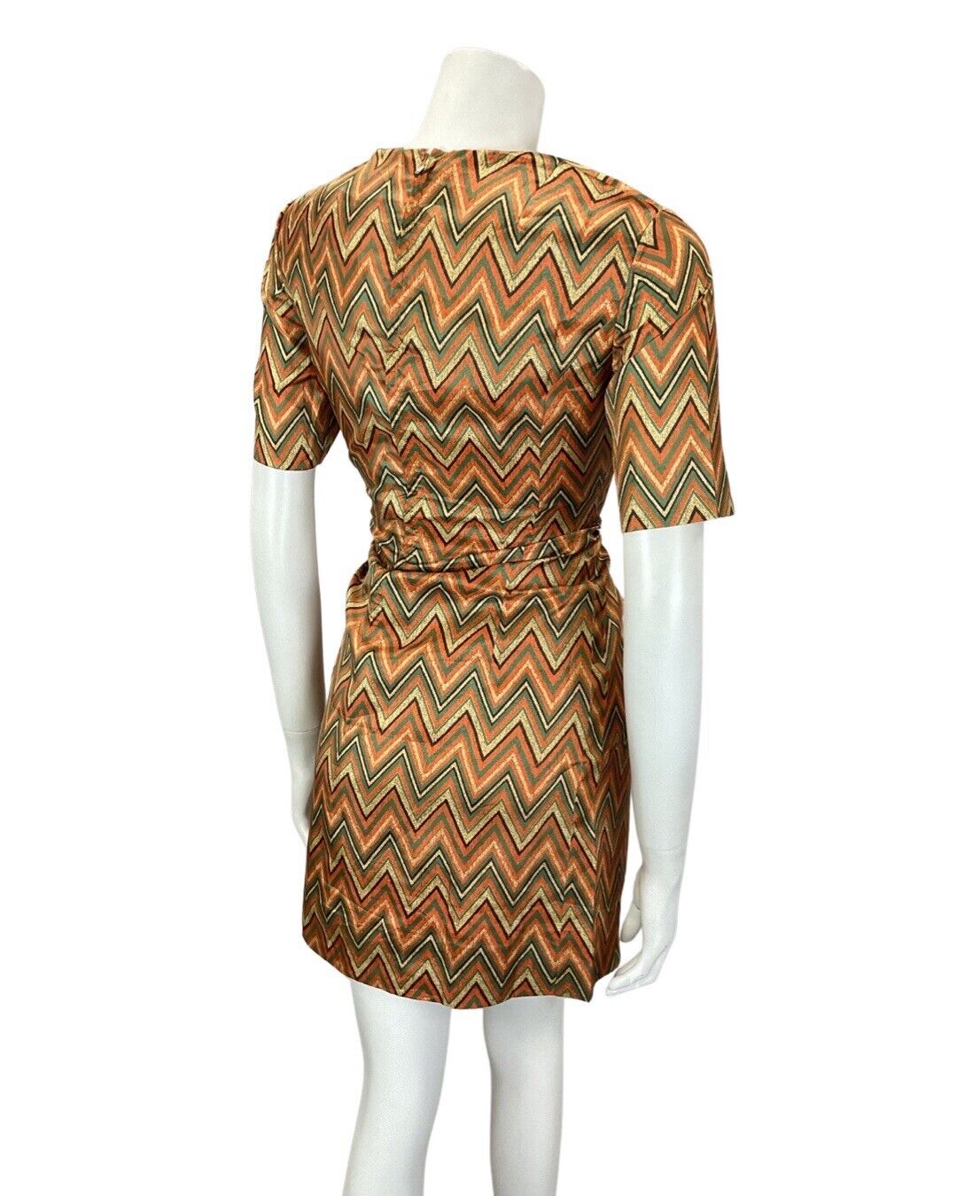 VINTAGE 60s 70s GREEN ORANGE CREAM ZIG-ZAG CHEVRON MOD SHORT FITTED DRESS 10 12