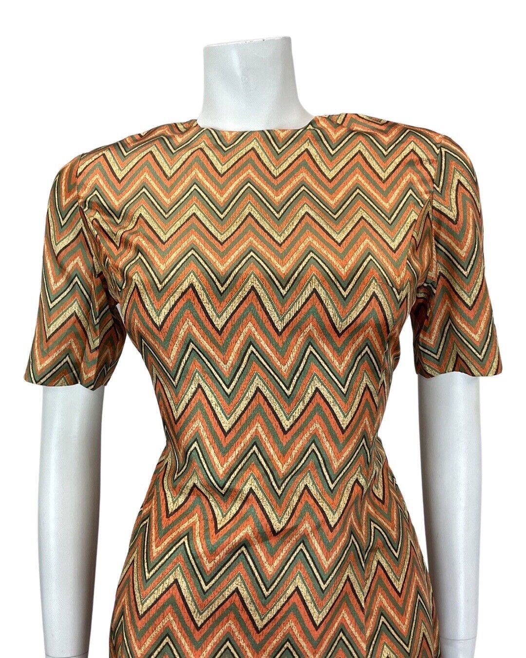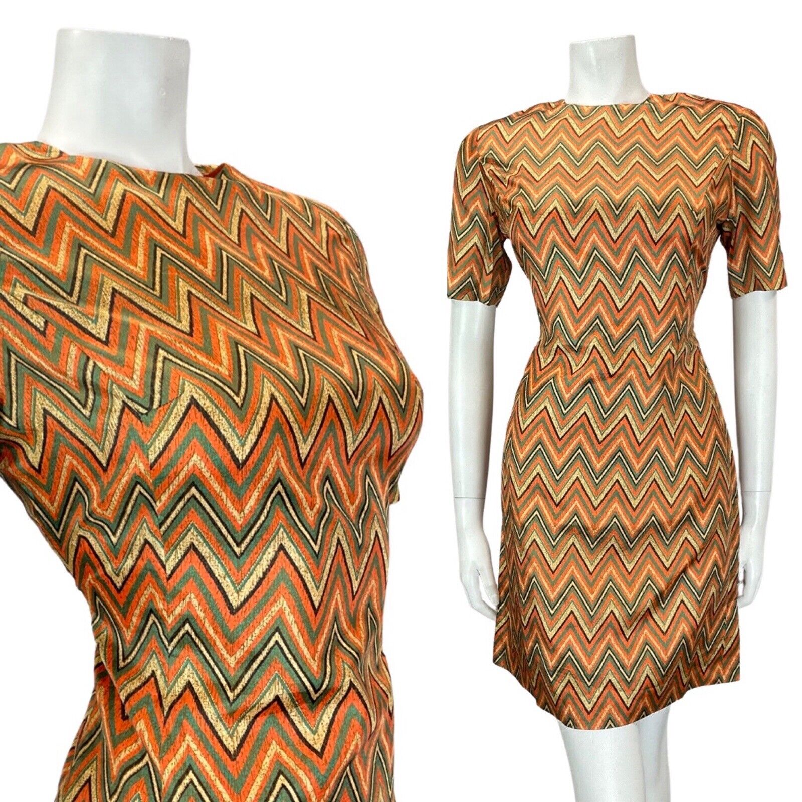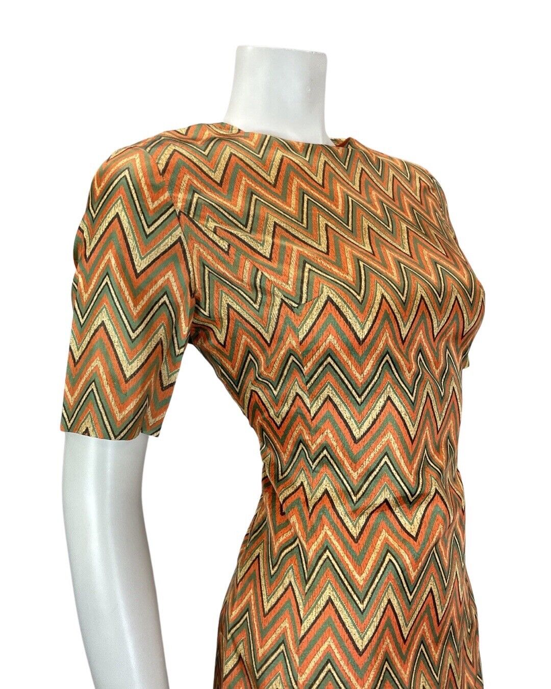 VINTAGE 60s 70s GREEN ORANGE CREAM ZIG-ZAG CHEVRON MOD SHORT FITTED DRESS 10 12