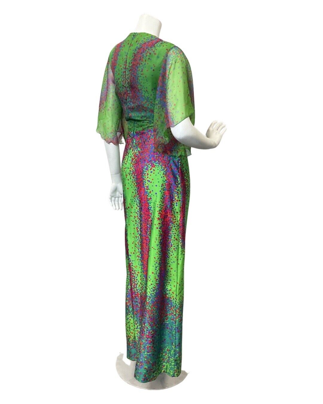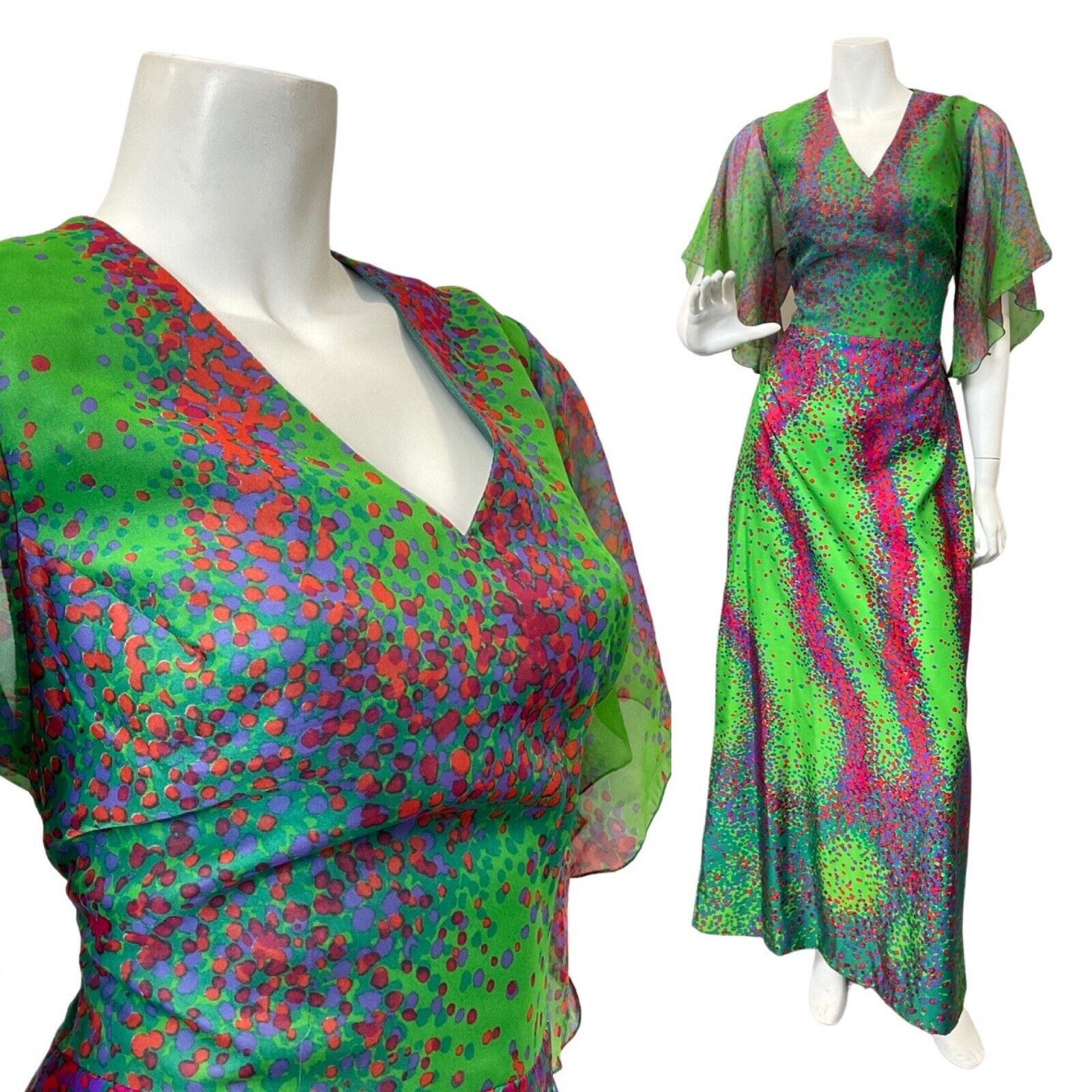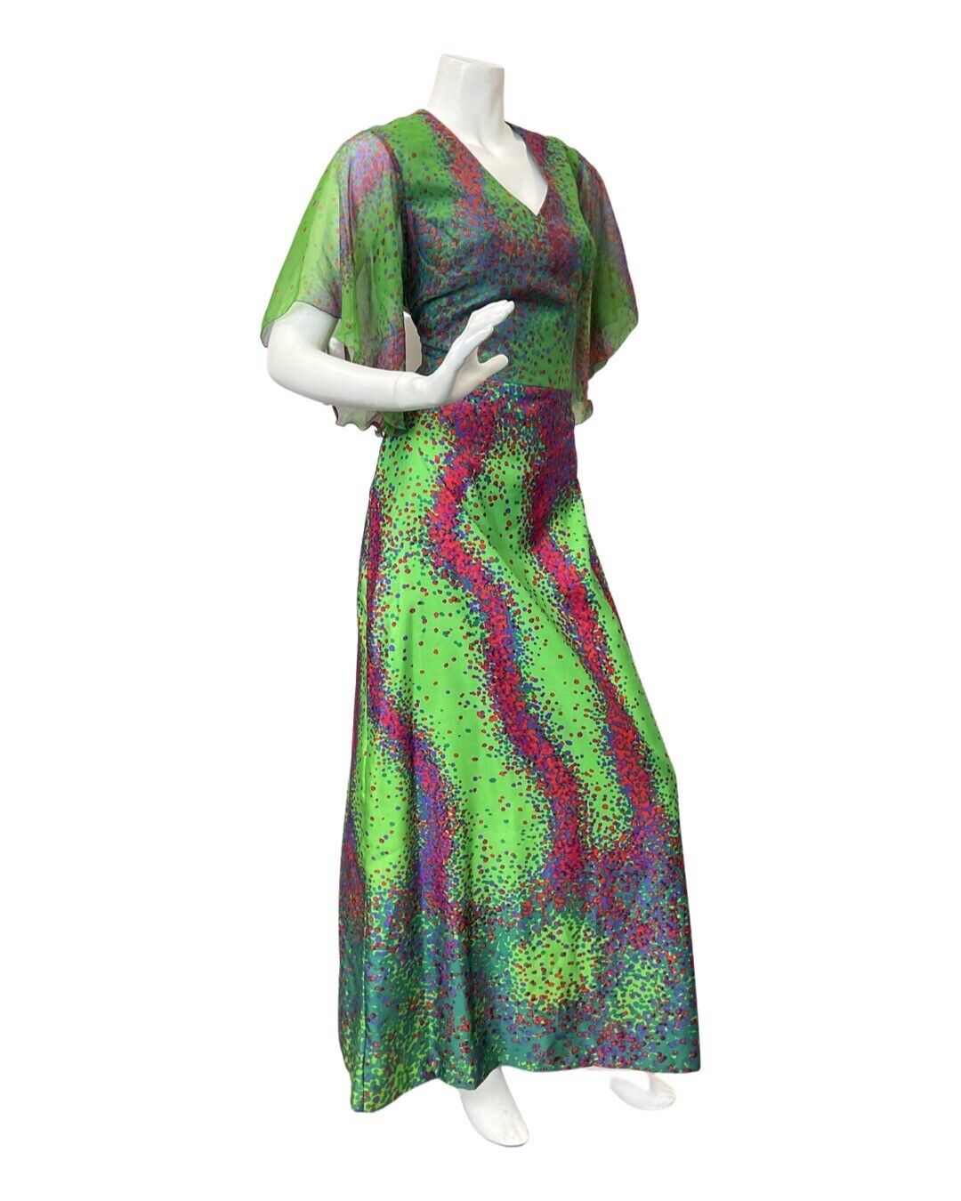 VINTAGE 60s 70s GREEN PINK BLUE PSYCHEDELIC DOTTY ANGEL SLEEVE MAXI DRESS 8 10
