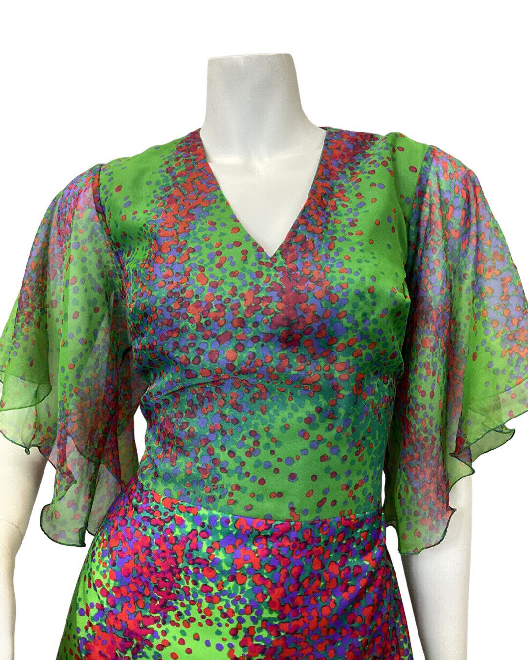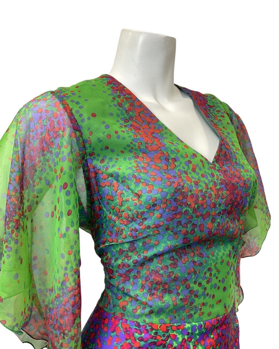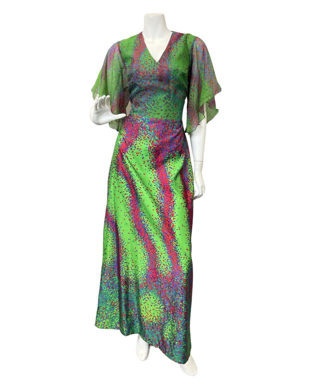 VINTAGE 60s 70s GREEN PINK BLUE PSYCHEDELIC DOTTY ANGEL SLEEVE MAXI DRESS 8 10