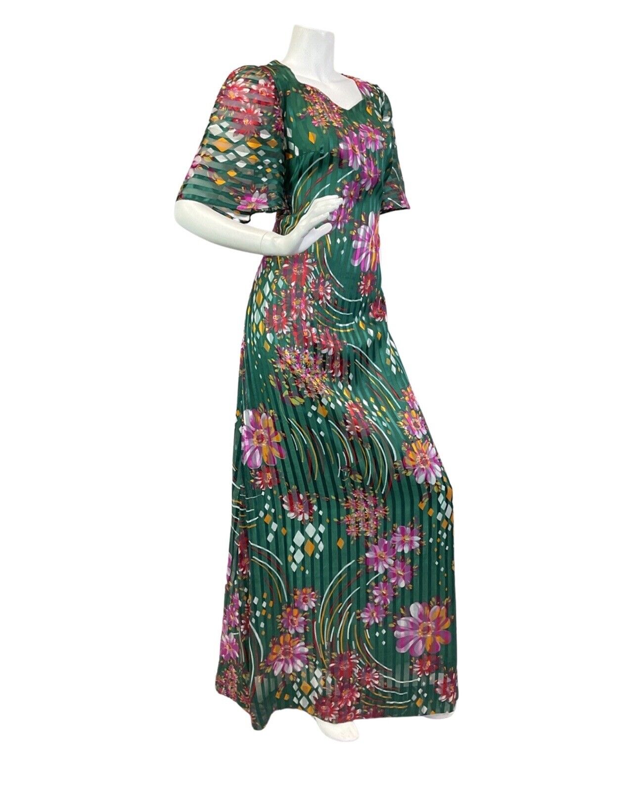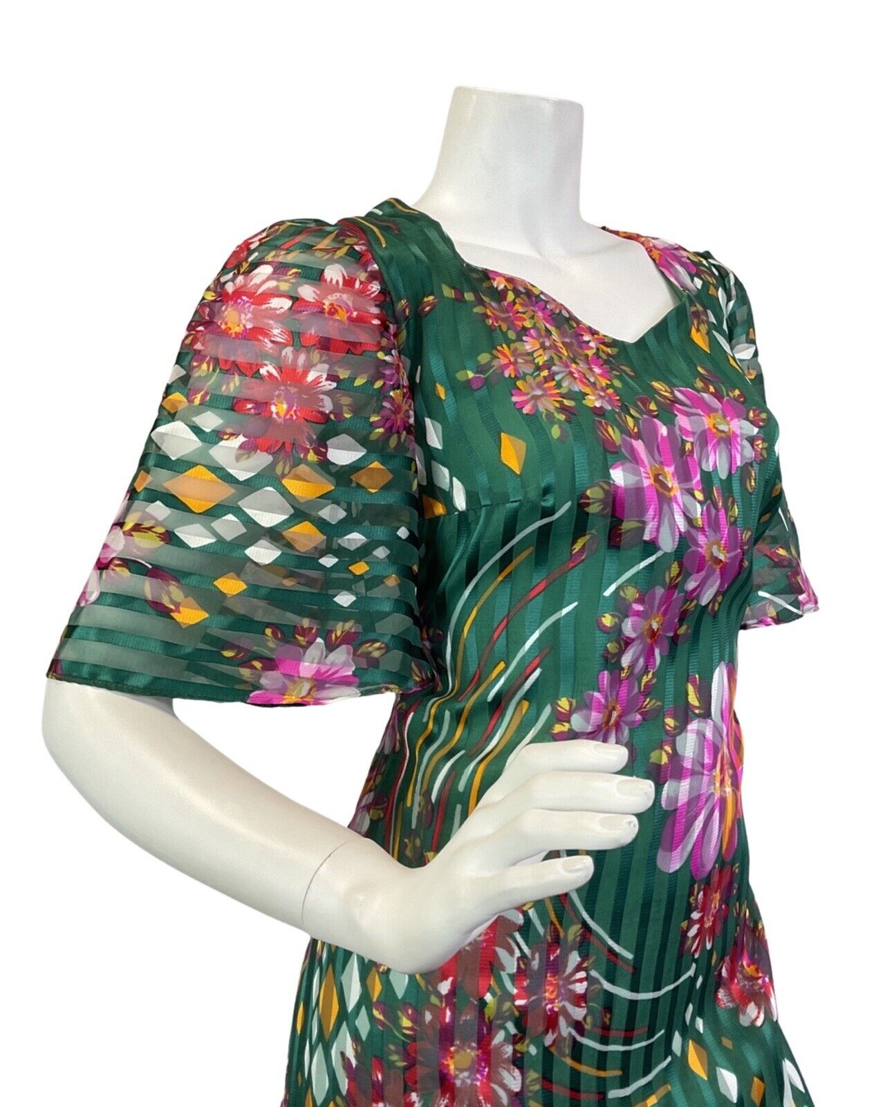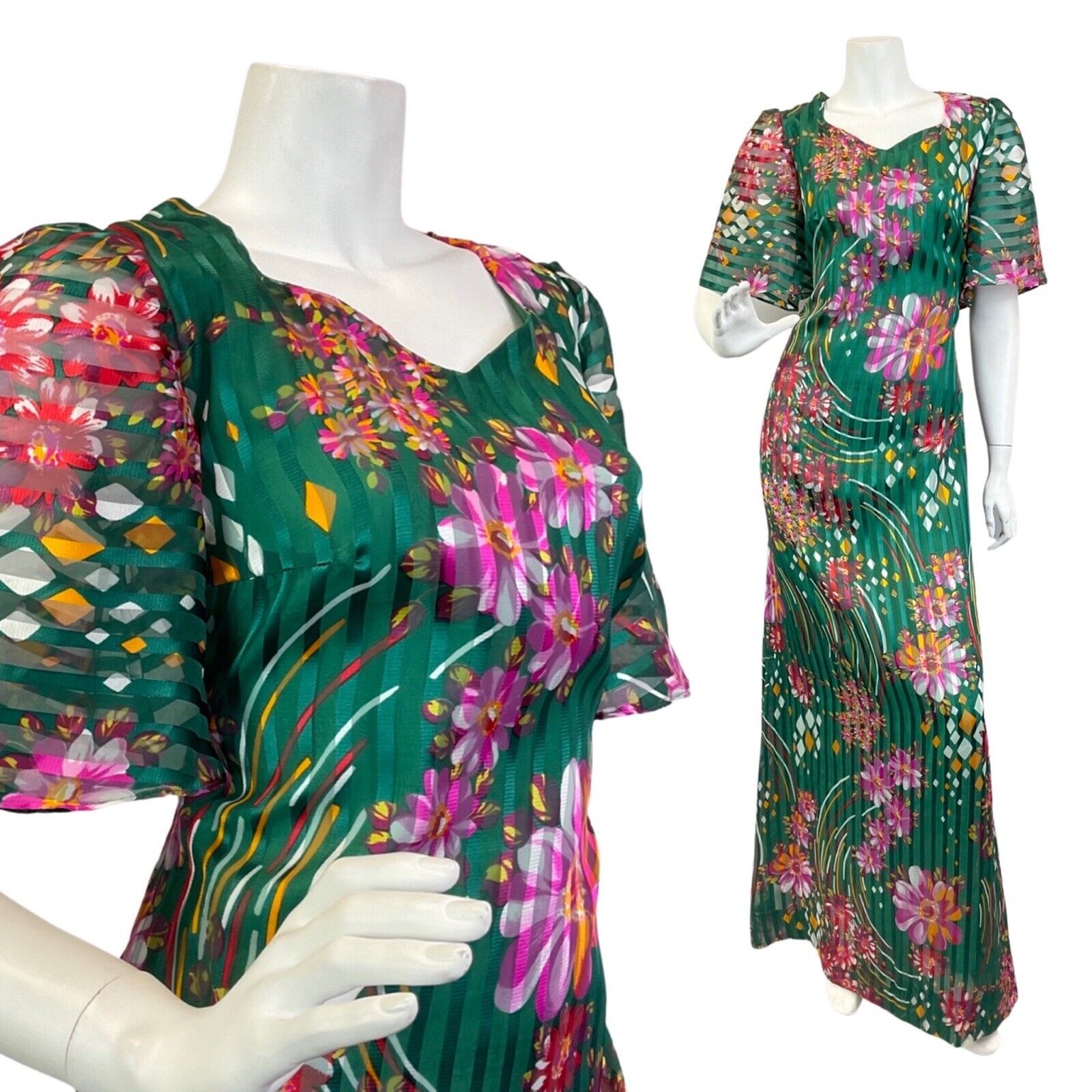VINTAGE 60s 70s GREEN PURPLE ORANGE FLORAL STRIPED SHEER SUMMER MAXI DRESS 10 12