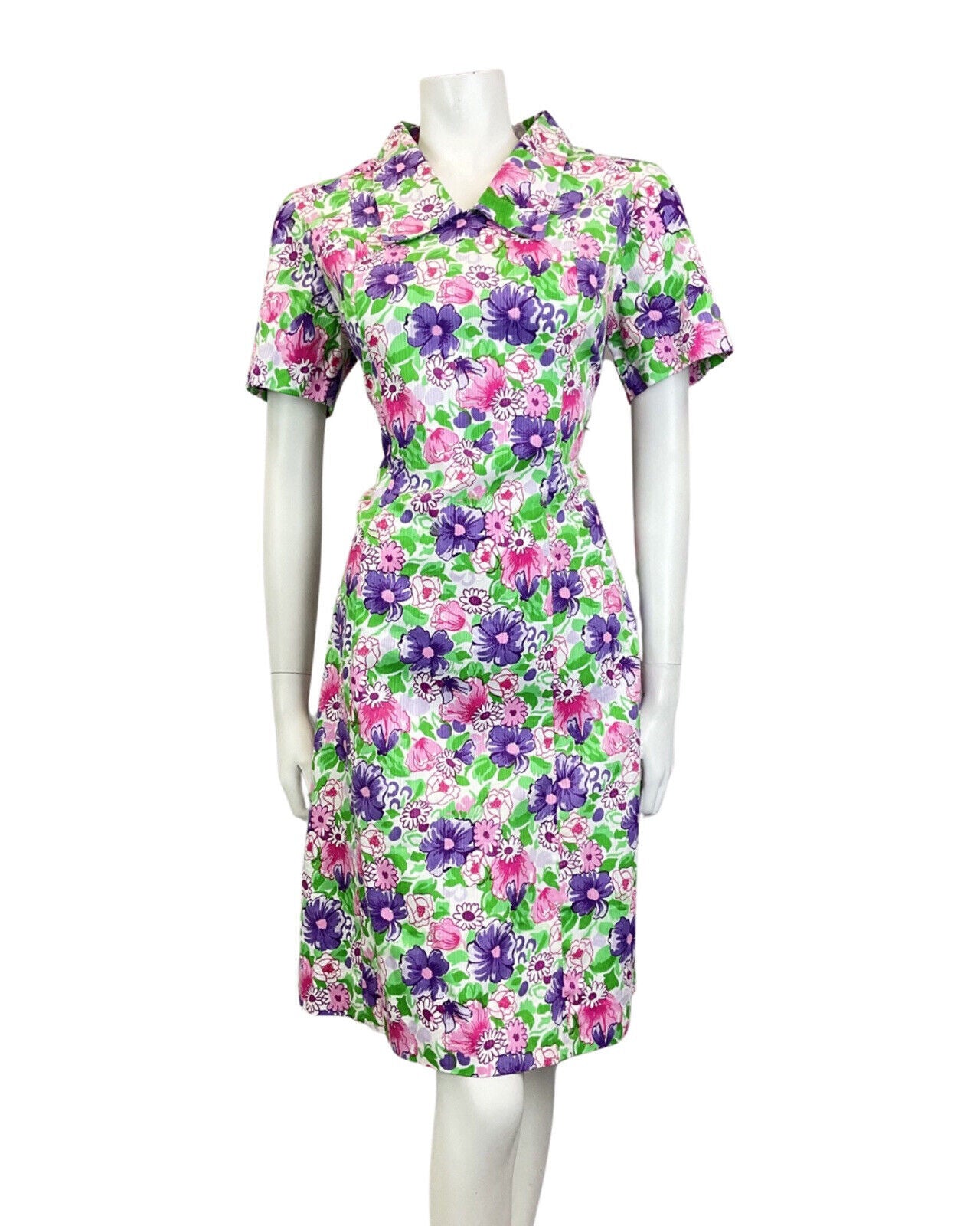 VINTAGE 60s 70s GREEN PURPLE PINK FLORAL GARDEN SHORT SHIRT DRESS 14 16