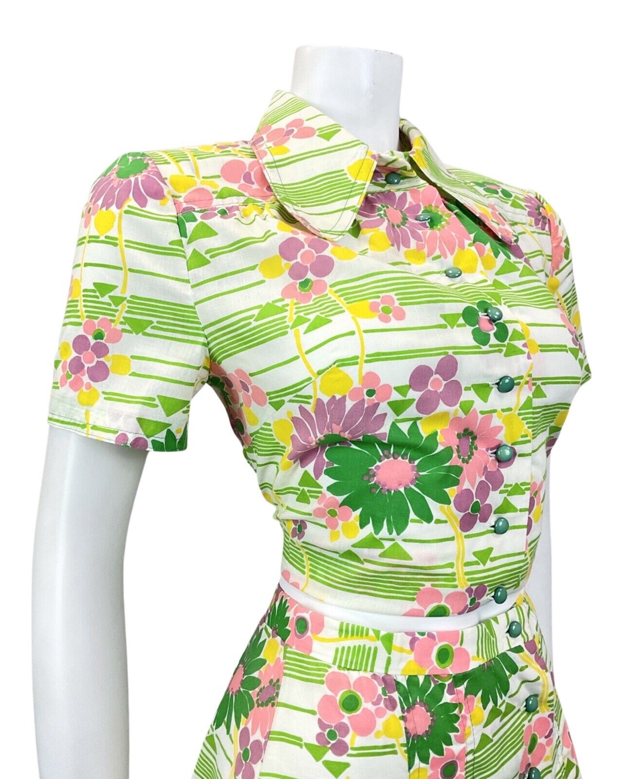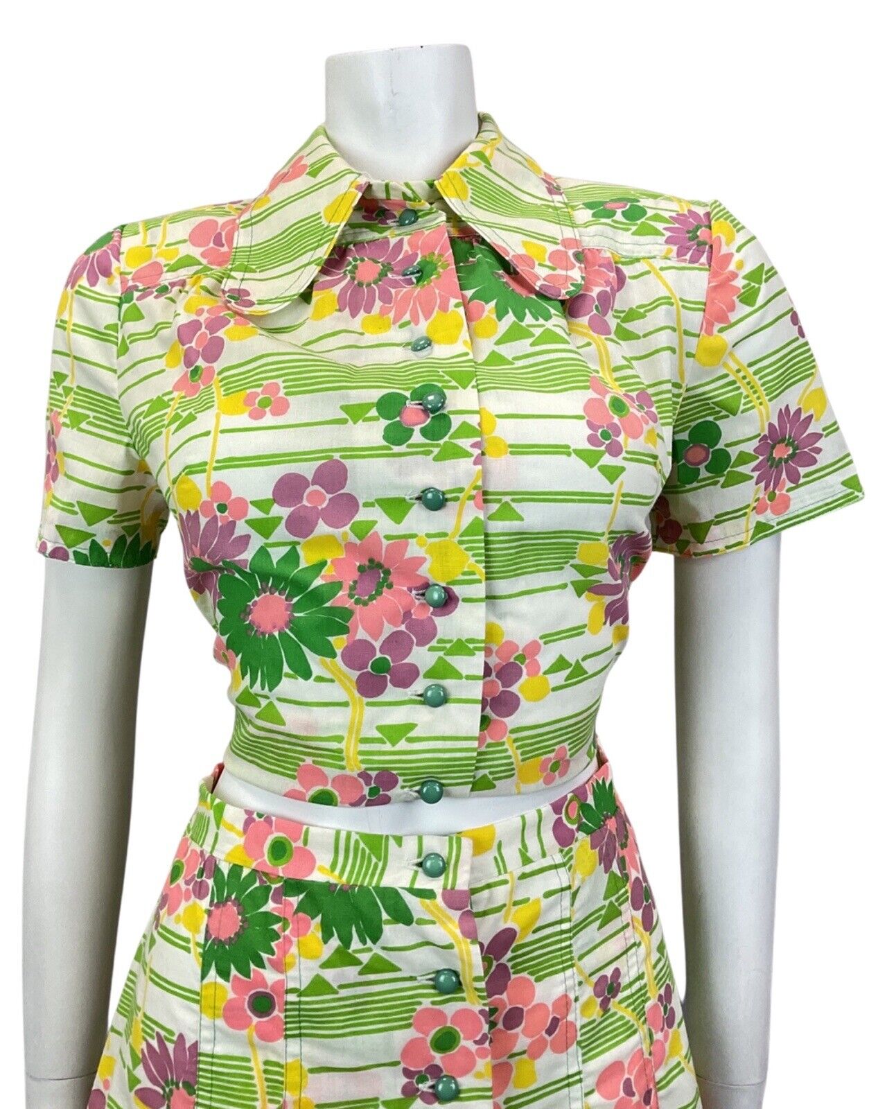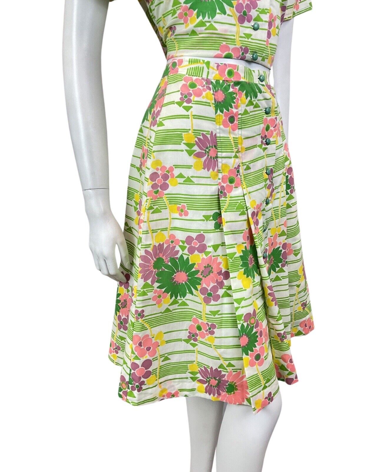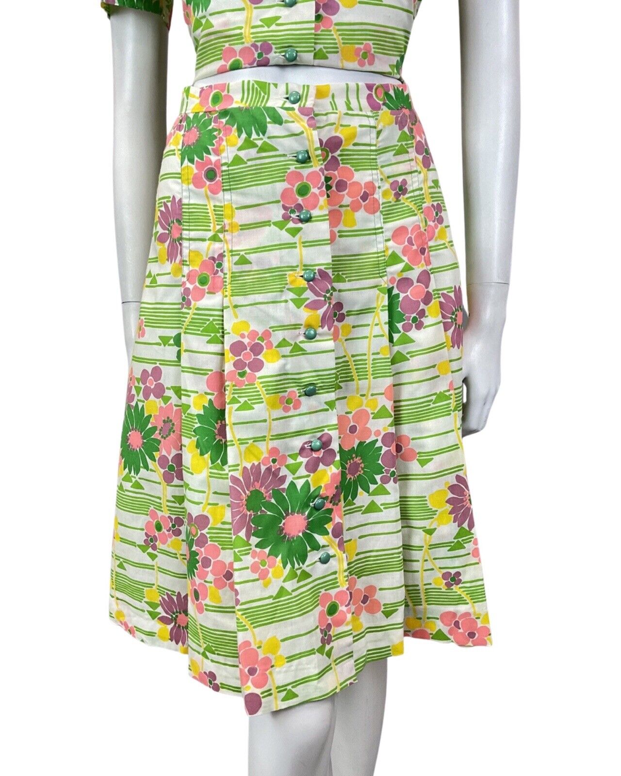 VINTAGE 60s 70s GREEN WHITE PINK STRIPED FLORAL MOD TWO-PIECE SHIRT SKIRT 10