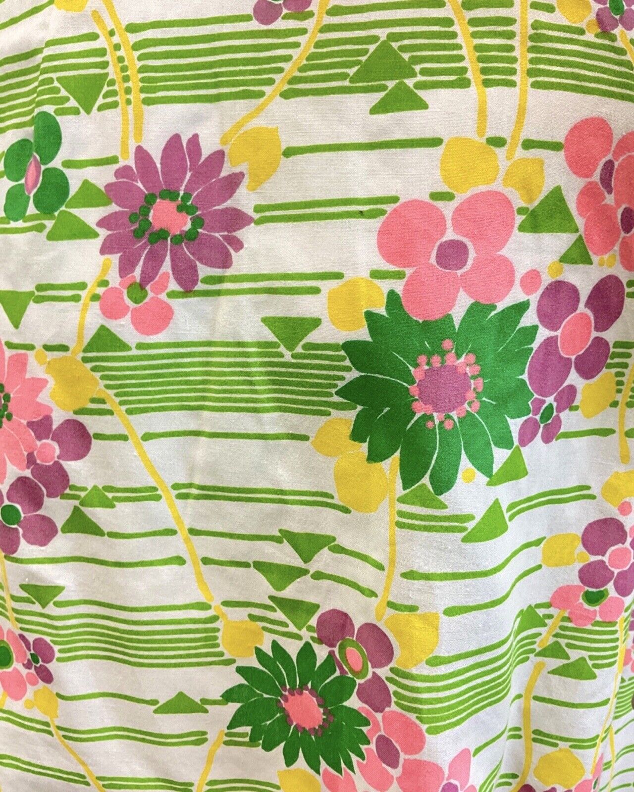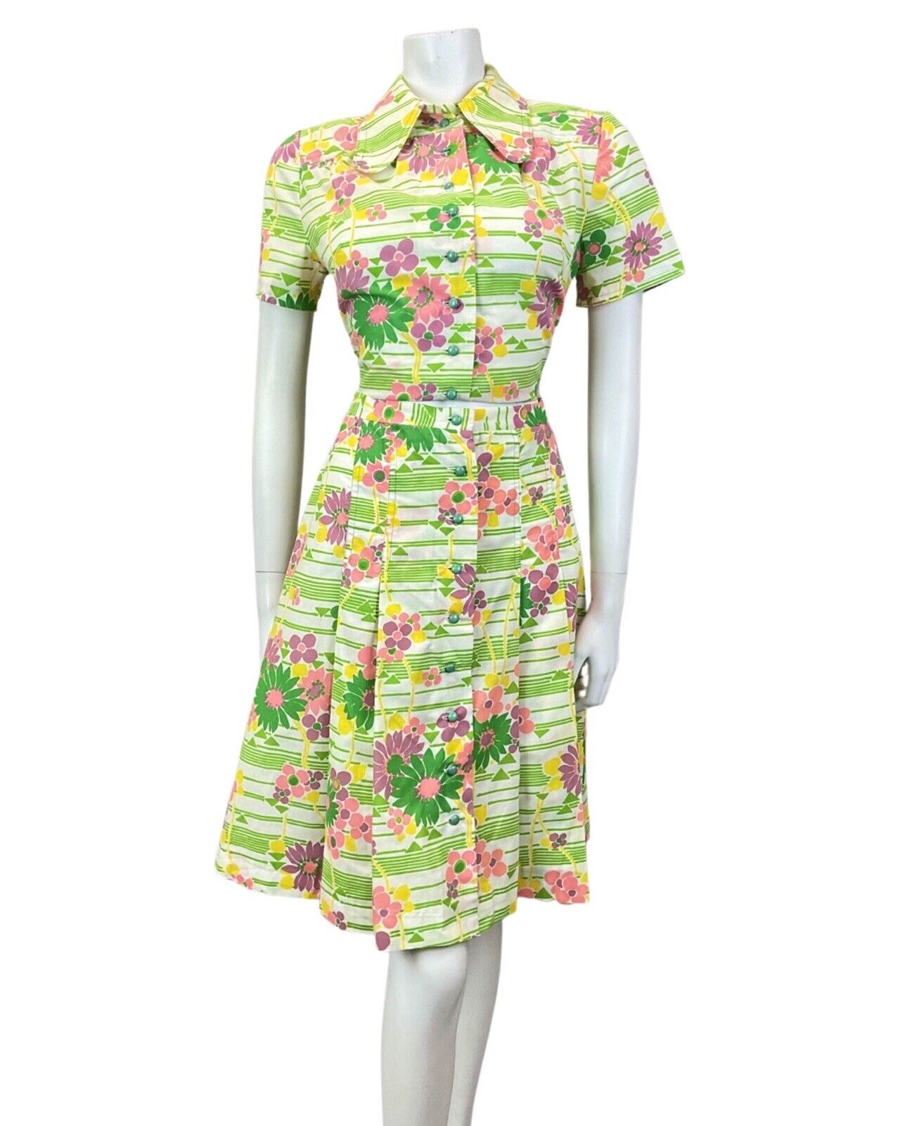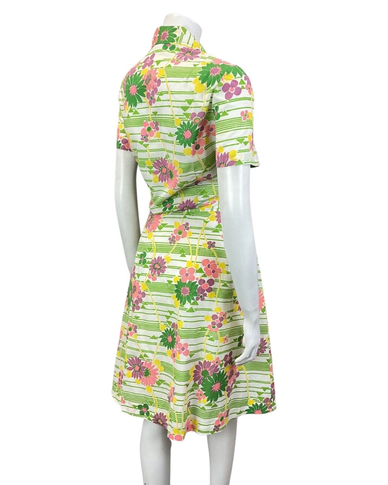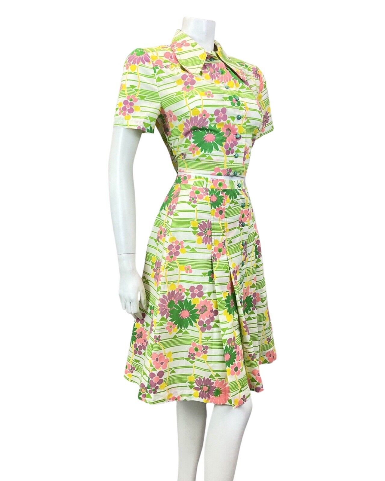 VINTAGE 60s 70s GREEN WHITE PINK STRIPED FLORAL MOD TWO-PIECE SHIRT SKIRT 10