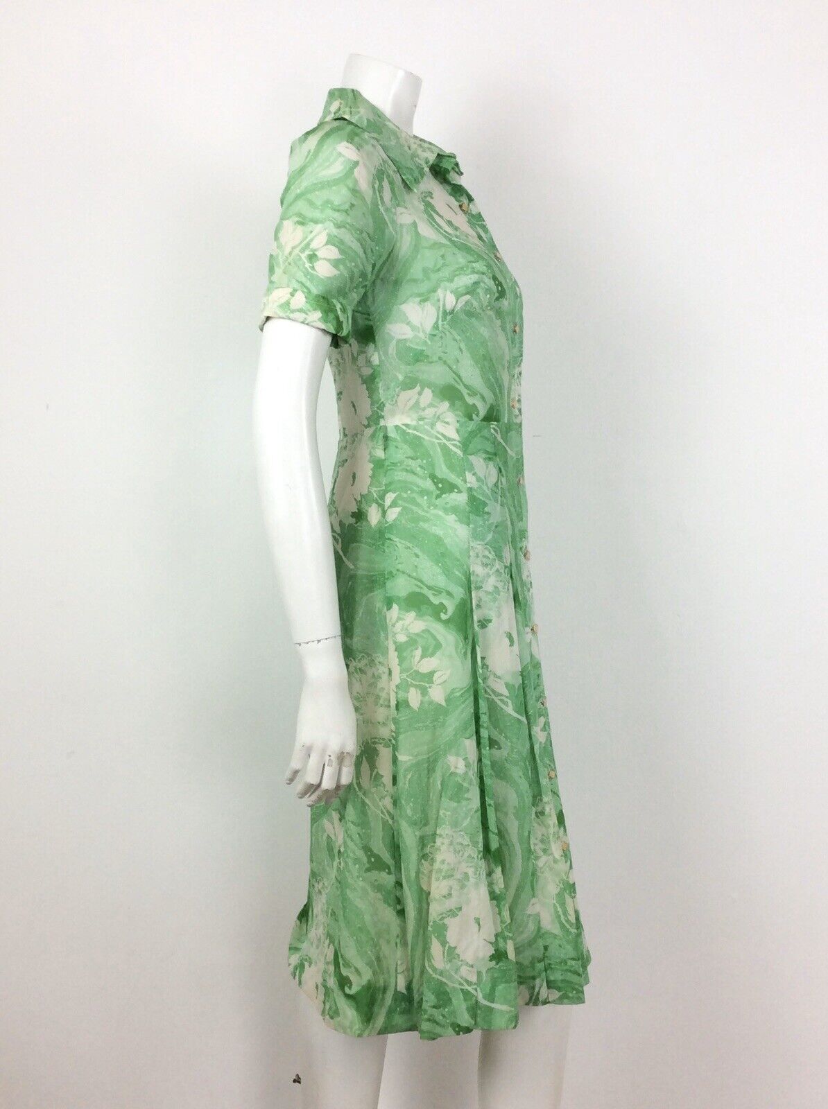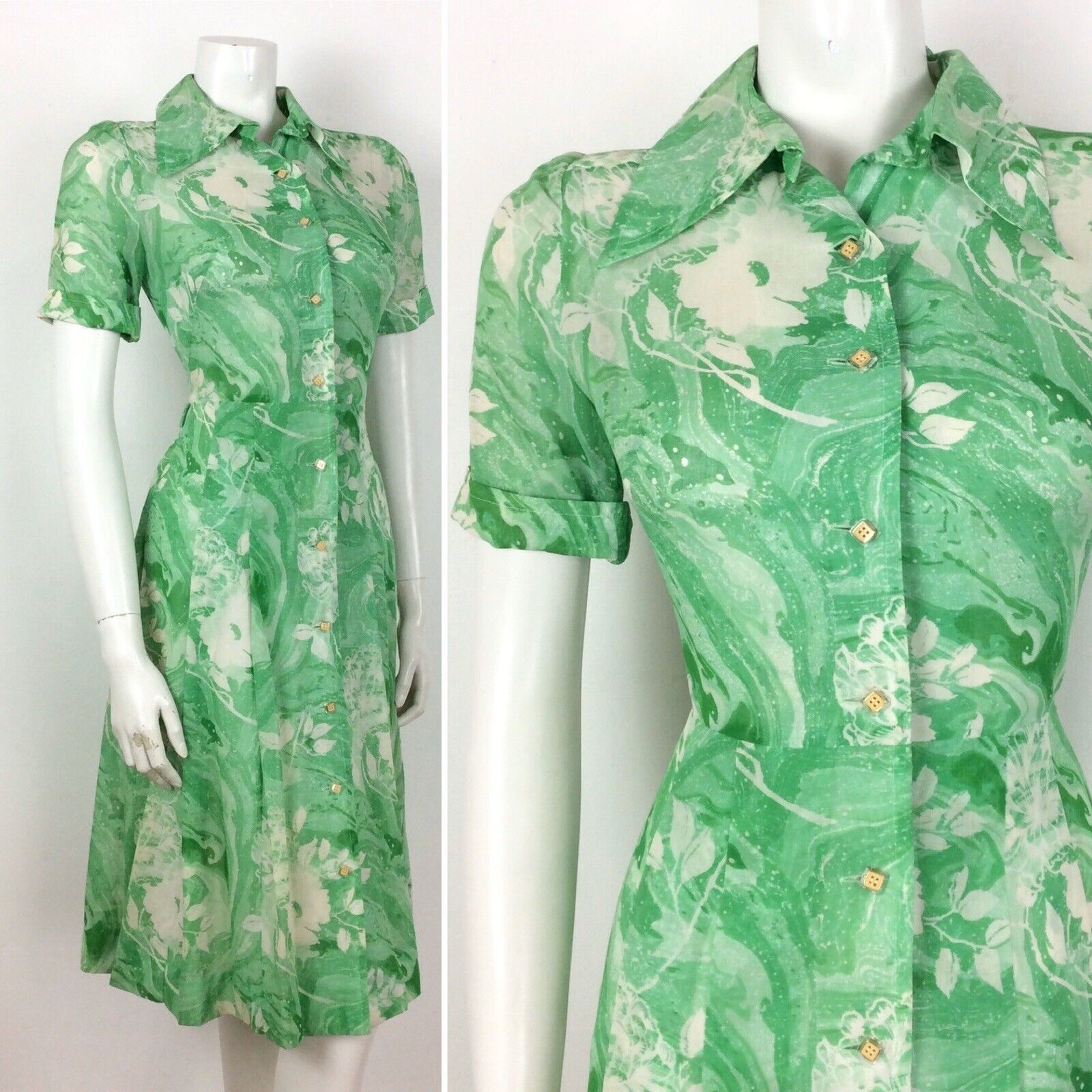 This is a beautiful vintage summer tea dress, with a unique pattern of green swirls and white flowers. This dress would best fit: 10 please check your measurements against the ones provided below, Bust: 35" Waist: 29" Hips: 37" Length: 40" PLEASE NOTE: This garment has been measured flat and doubled for bust (armpit to armpit), waist and hip measurements, we measure the length down the back of the dress, measurements may differ slightly due to dress styles and fabrics. We ignore any existing size labels as vintage brands differed so much. Items shown on our mannequin may be clipped to fit. This garment is true vintage so please be aware there may be some signs of wear as expected from a garment of this age. We do not list stains to area likes linings that are hidden or things that can bearly be seen without close inspection. These can include pin holes, small marks, light piling. We hand pick our items to make sure they are in great condition and fully wearable and we reject anything of poor condition. The majority of our items are 40-70 years old. If you think we've missed something significant please get in touch, we are only human and we lose transaction fees on returns so we don't skip things on purpose. CHECK OUT OUR OTHER ITEMS, WE LIST EVERY WEEK! |