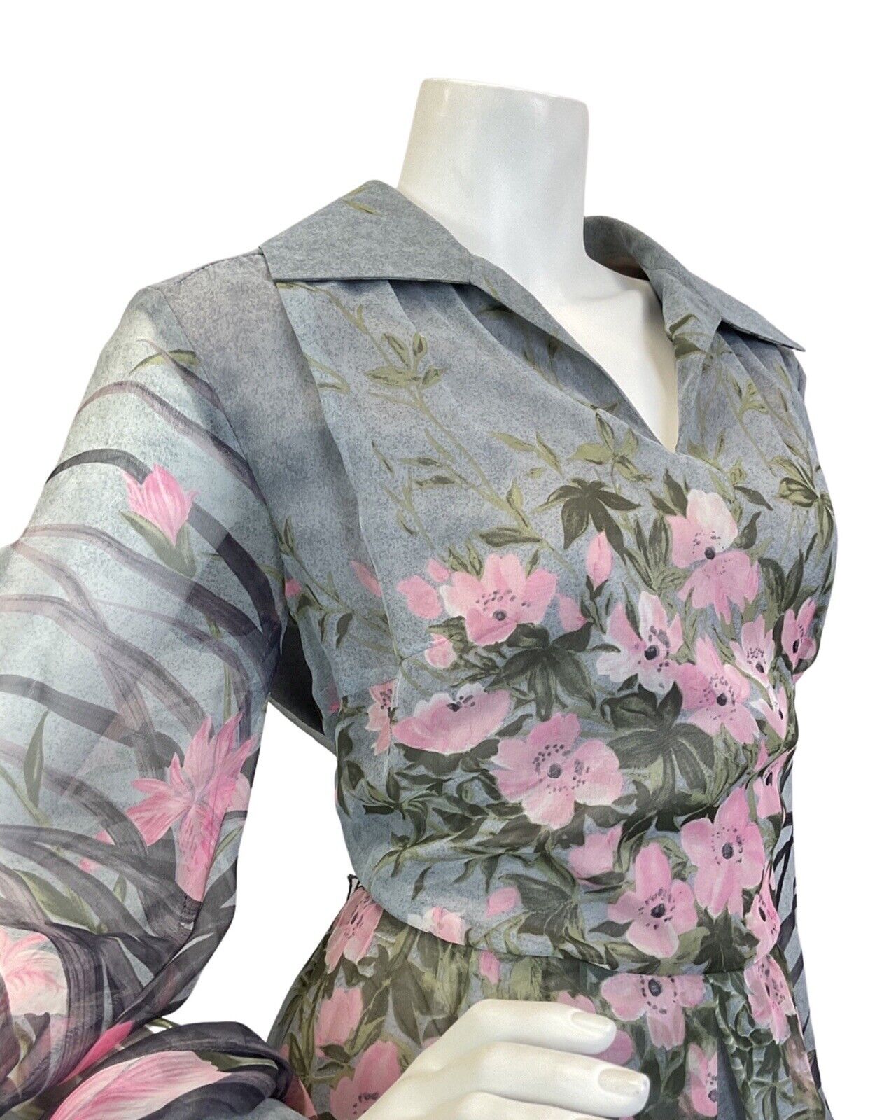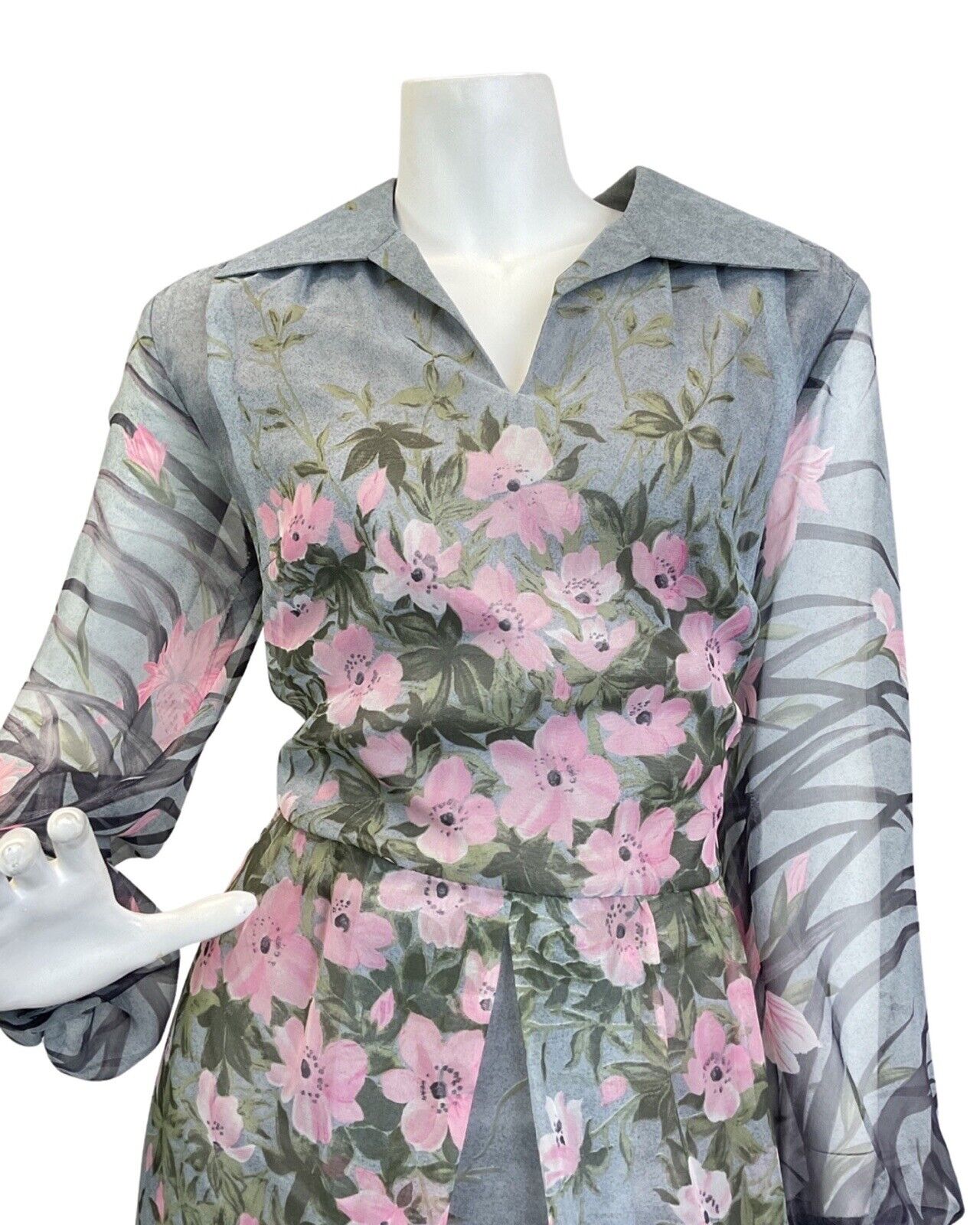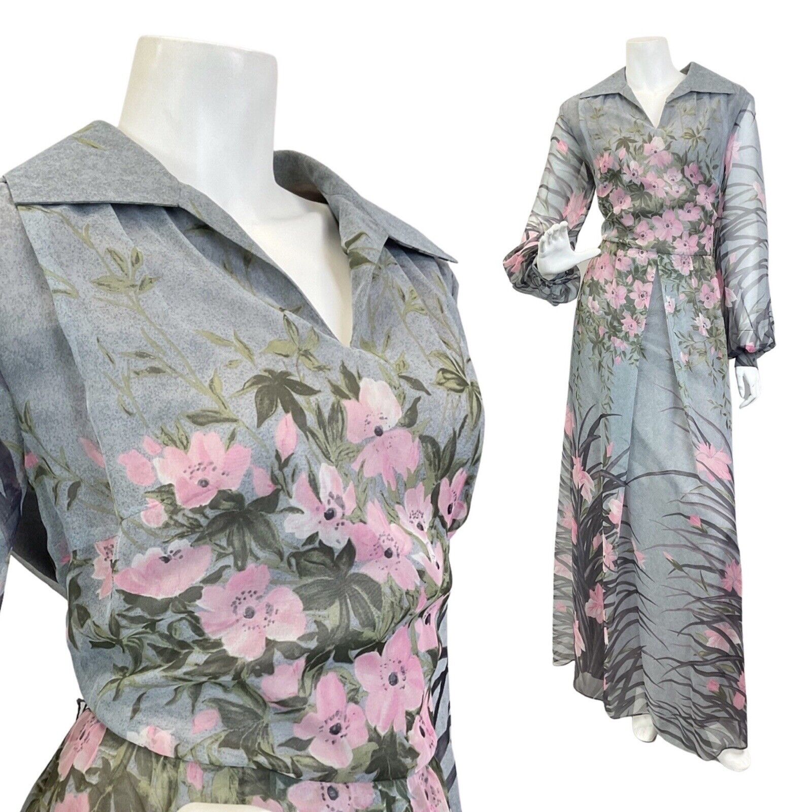VINTAGE 60s 70s GREY PINK WHITE FLORAL BLOSSOM SHEER SHIRT COLLAR MAXI DRESS 14
