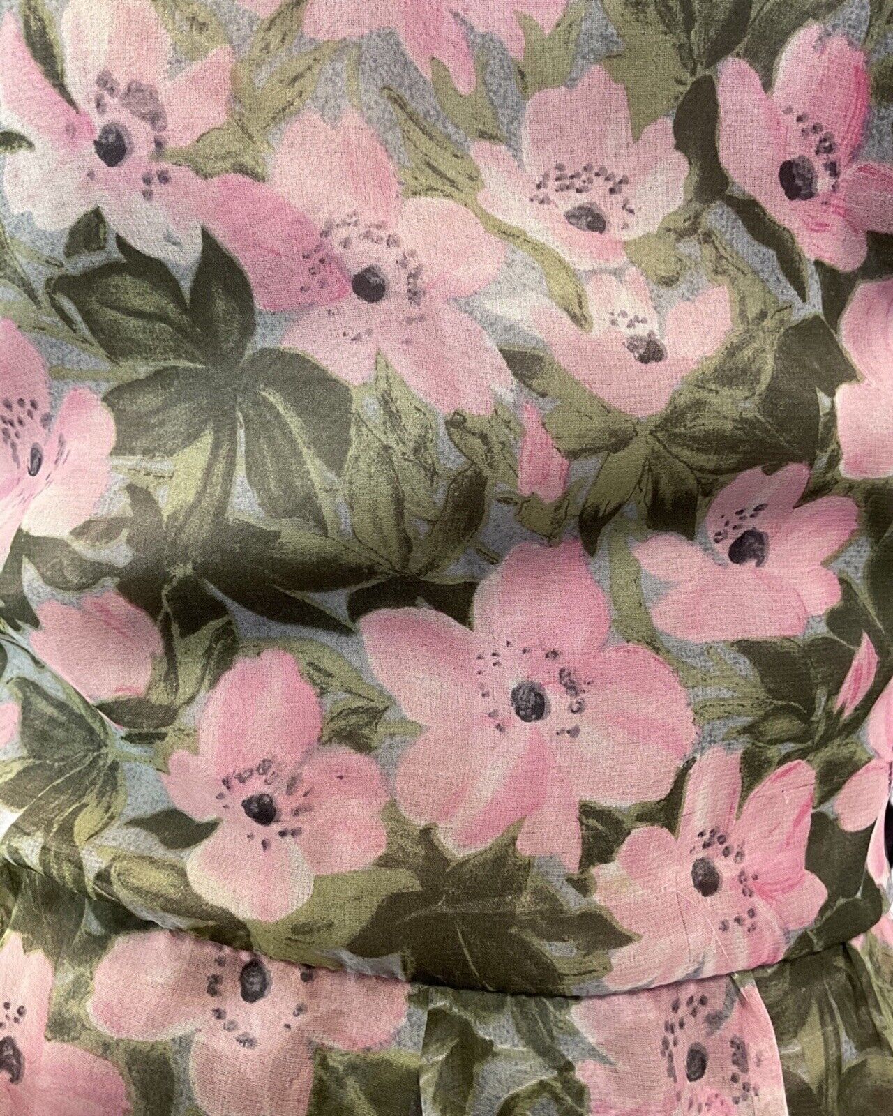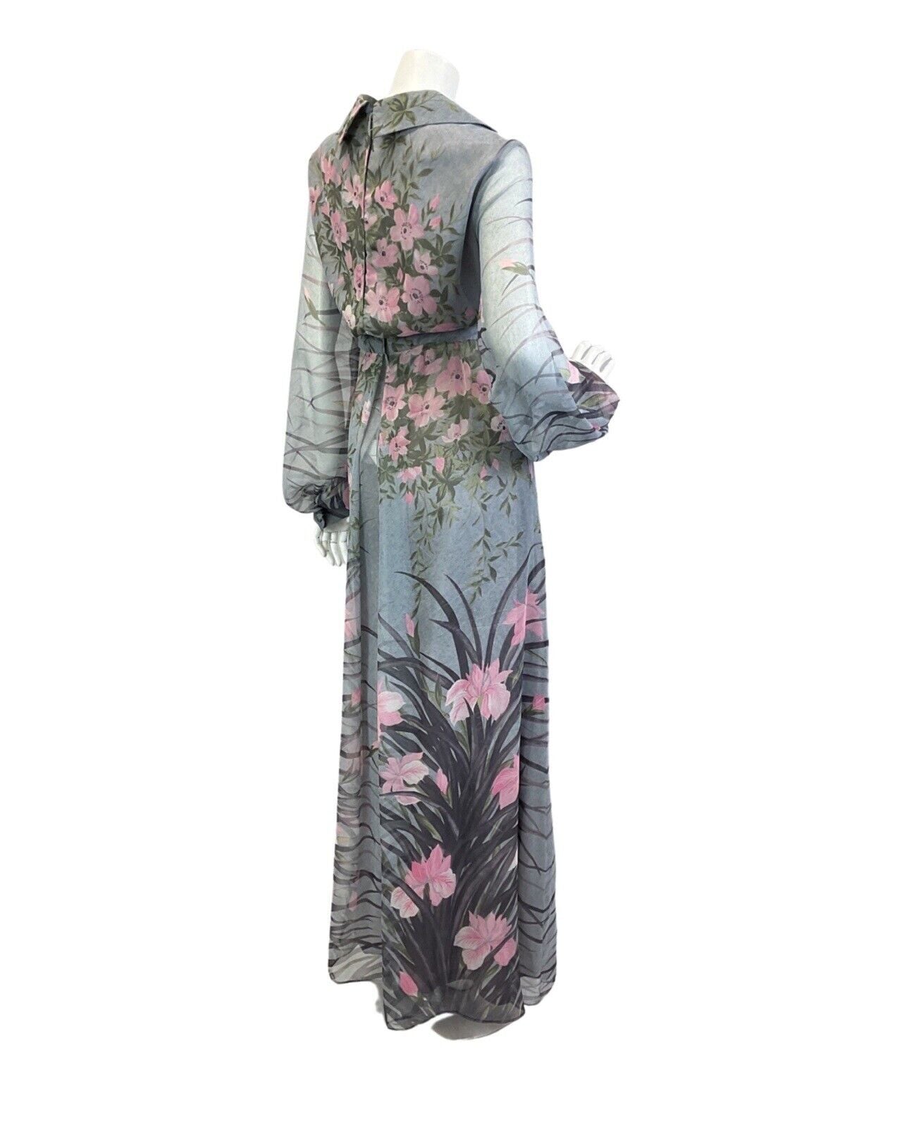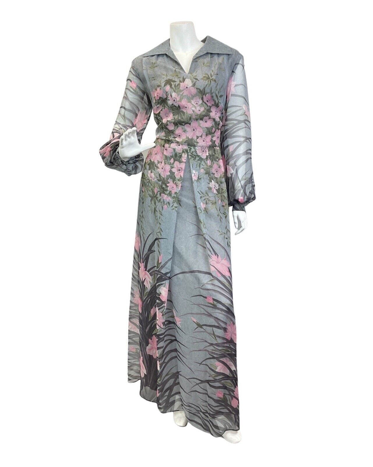 VINTAGE 60s 70s GREY PINK WHITE FLORAL BLOSSOM SHEER SHIRT COLLAR MAXI DRESS 14