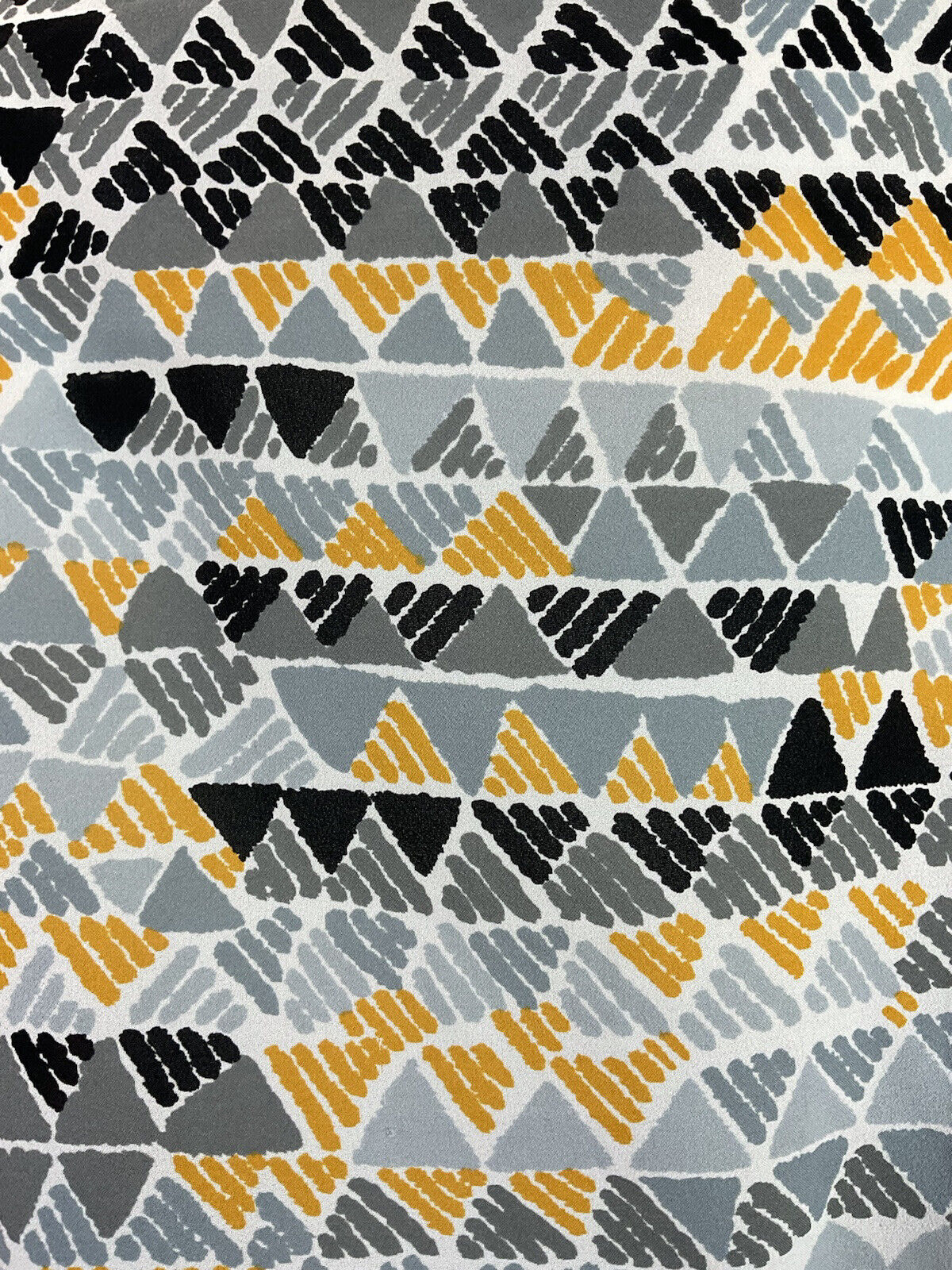Covering the top is a bold geometric pattern in shades of grey, silver, white, black, and yellow.