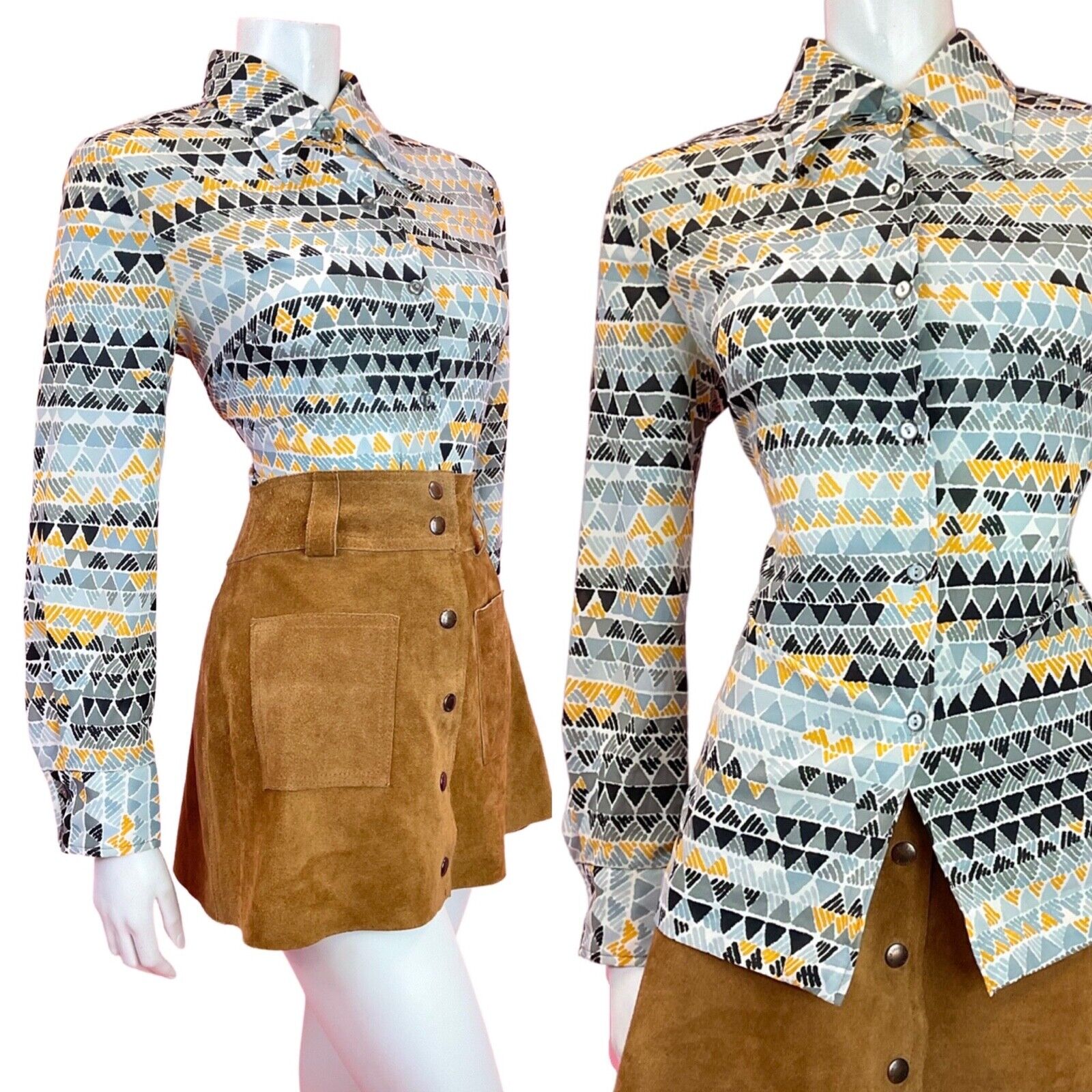 VINTAGE 60s 70s GREY SILVER YELLOW BLACK GEOMETRIC MOD DAGGER SHIRT BLOUSE 12 14