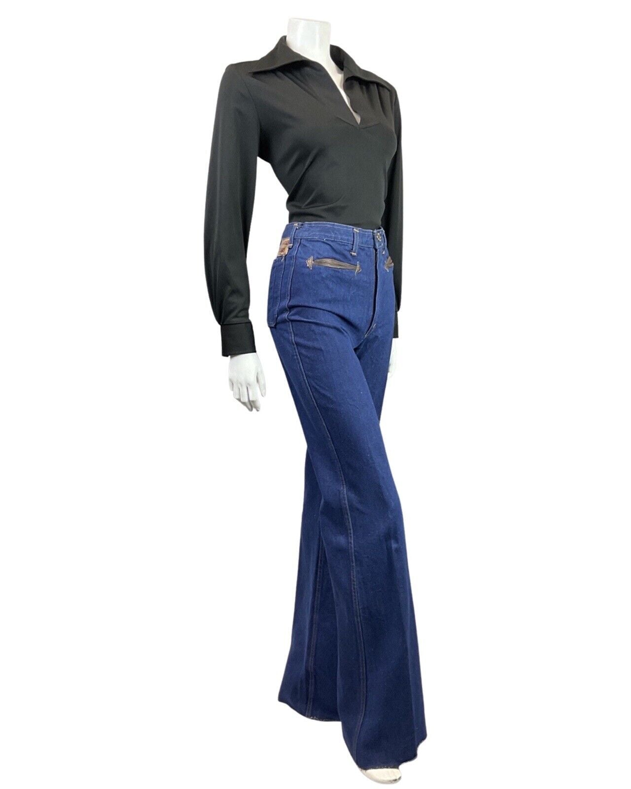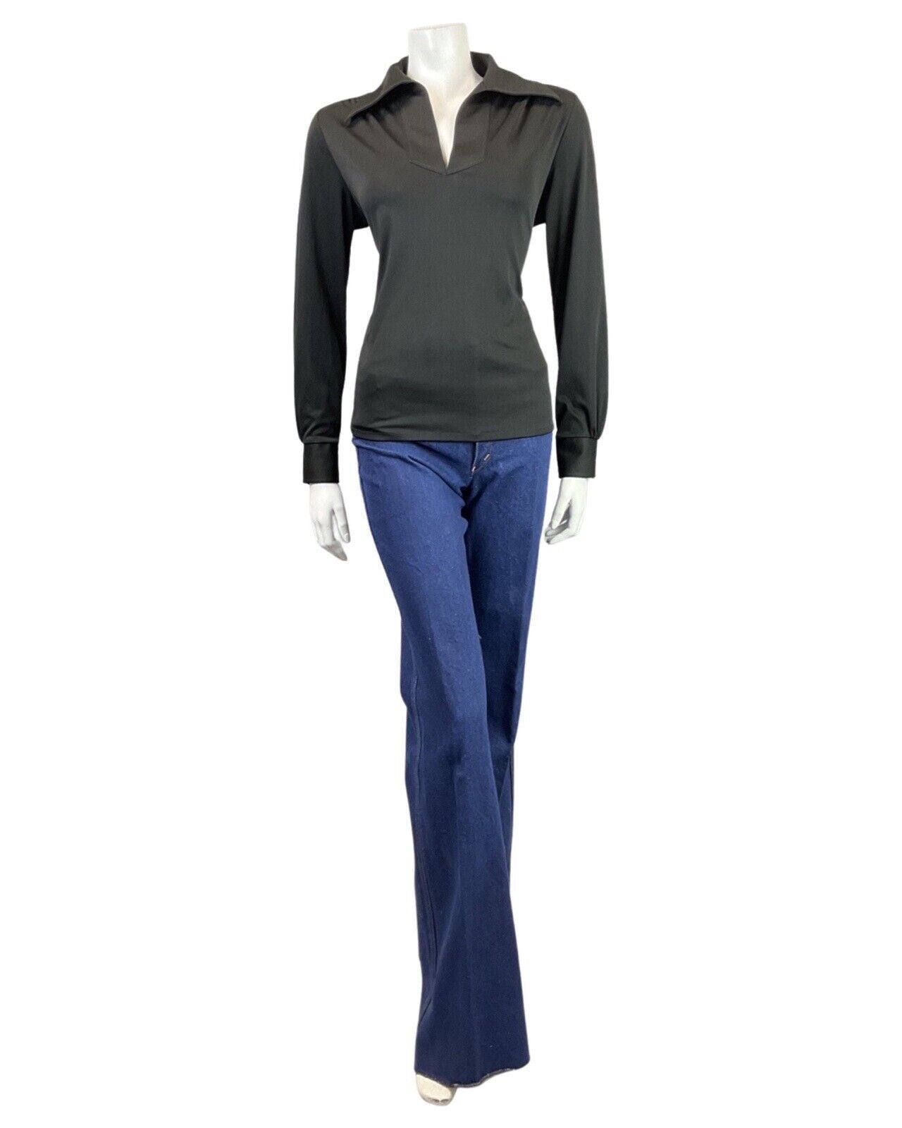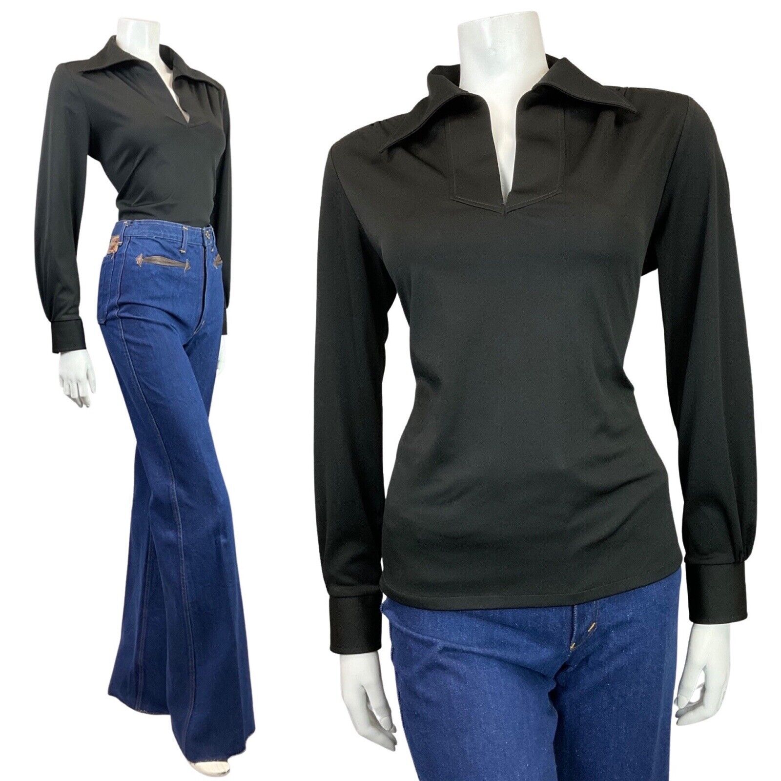 VINTAGE 60s 70s JET BLACK DAGGER COLLAR BLOUSE TOP 14 16