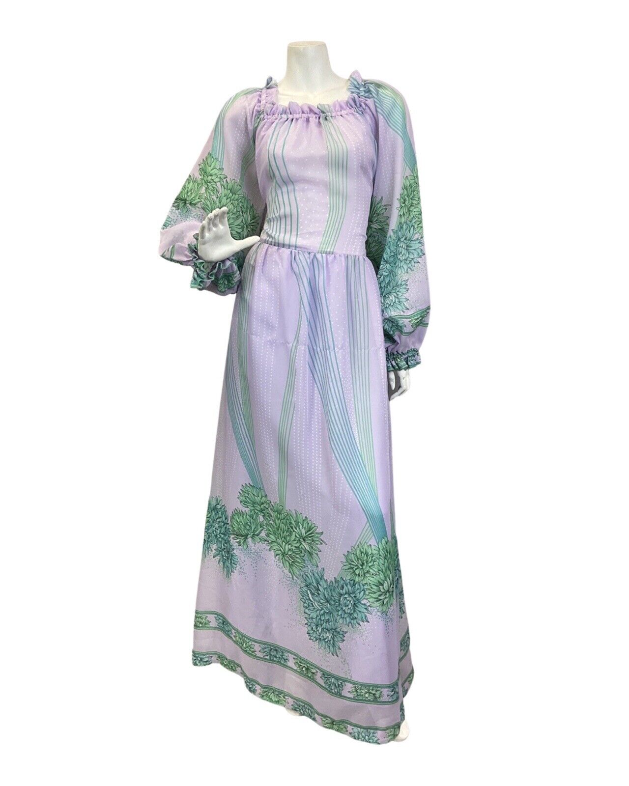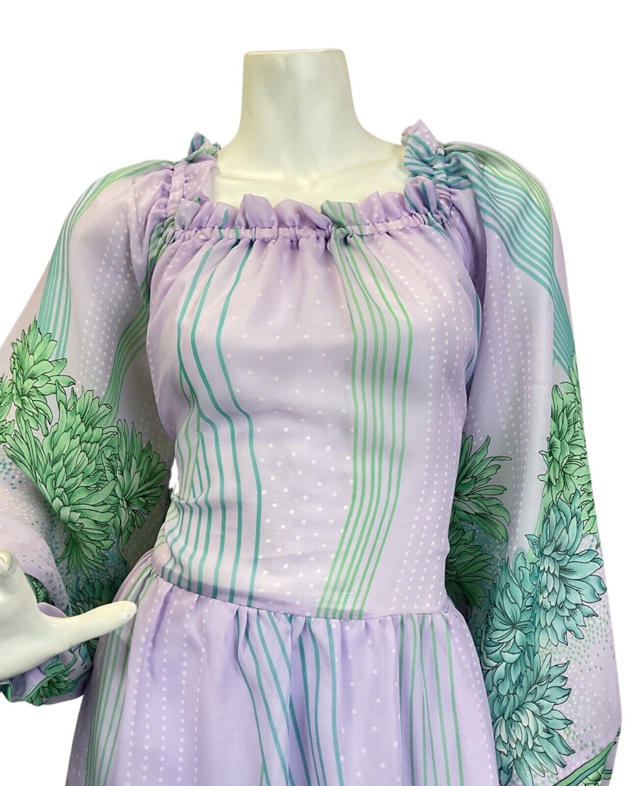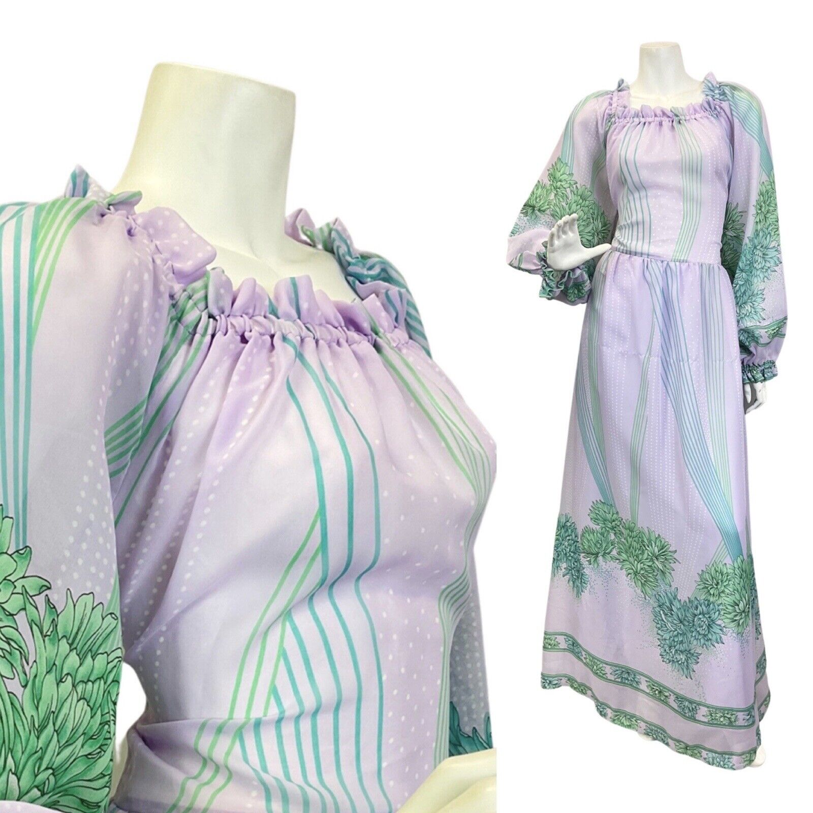 VINTAGE 60s 70s LILAC GREEN BLUE FLORAL BOHO PRAIRIE SUMMER MAXI DRESS 10 12