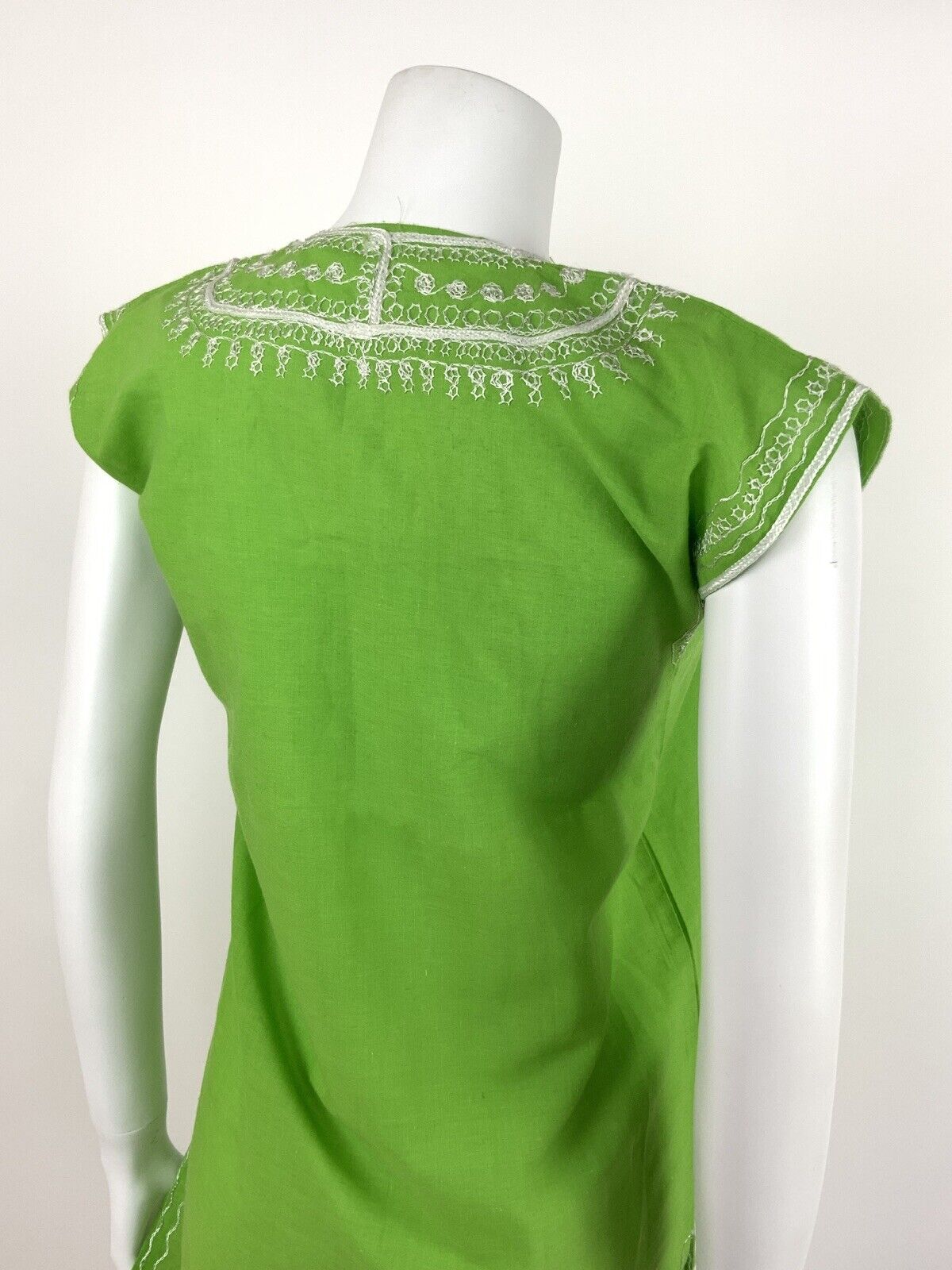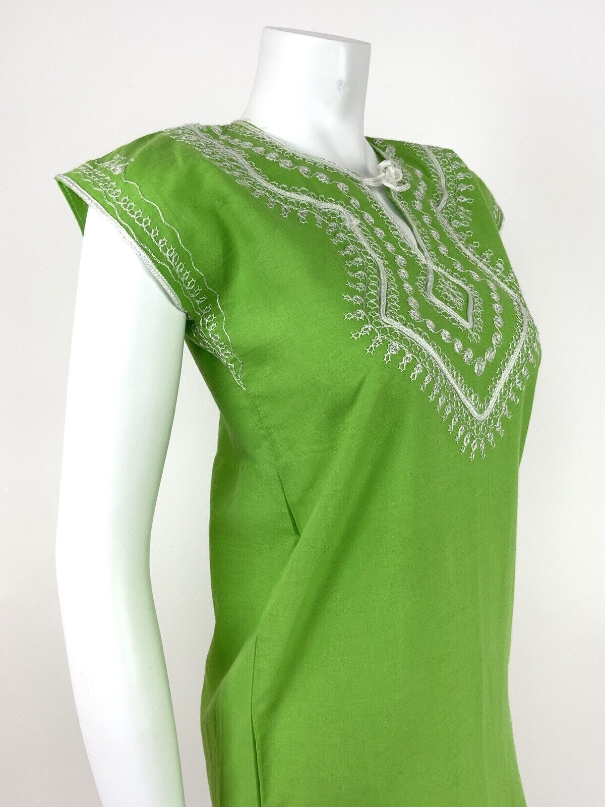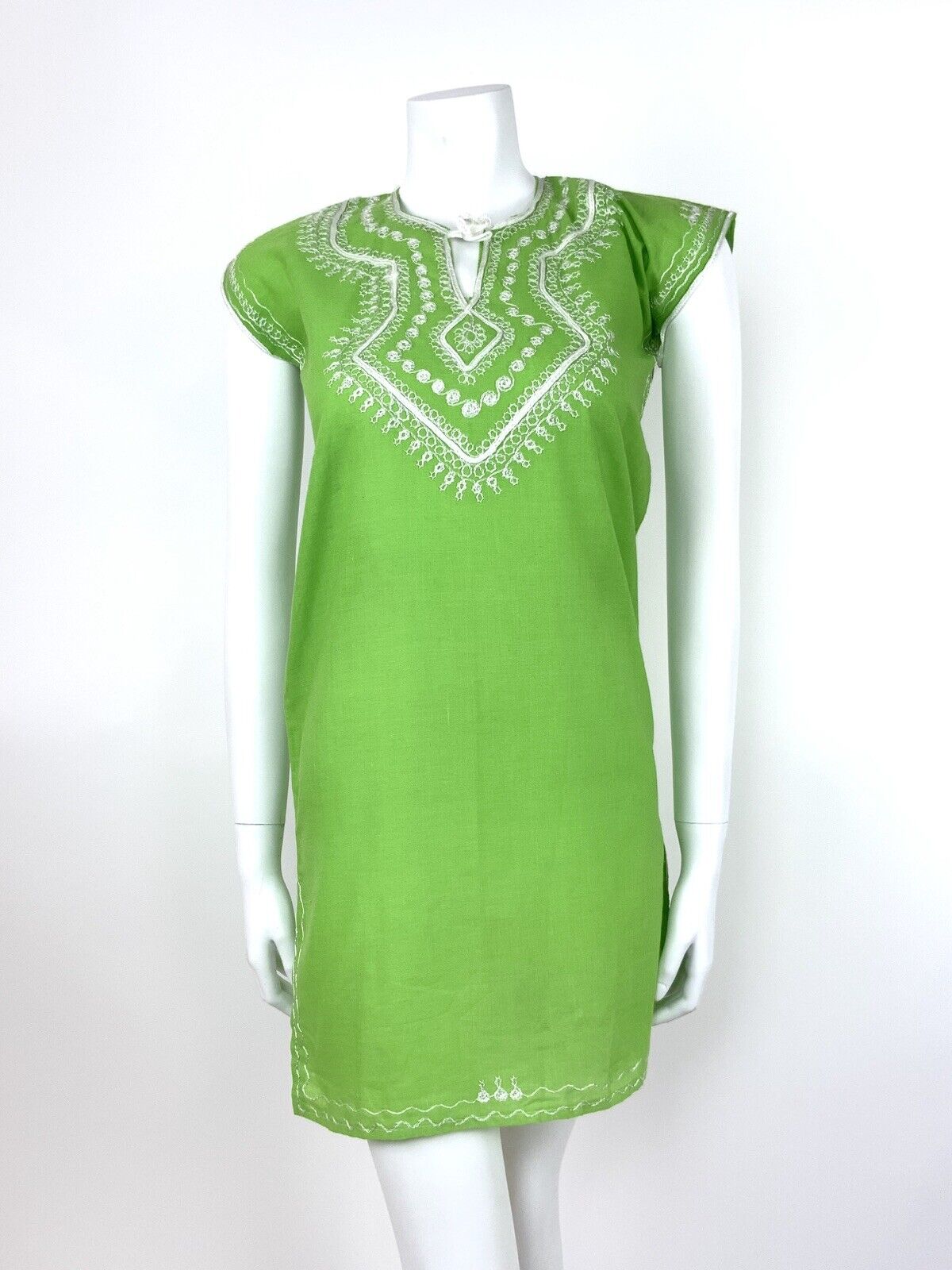 VINTAGE 60s 70s LIME GREEN COTTON KAFTAN WHITE EMBROIDERED ETHNIC 6 8