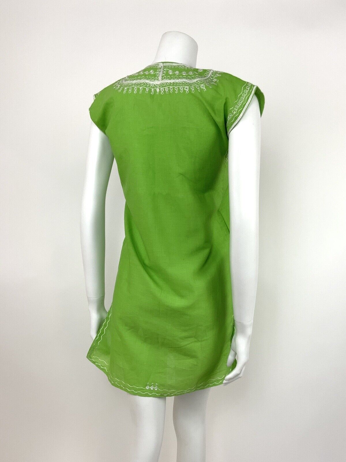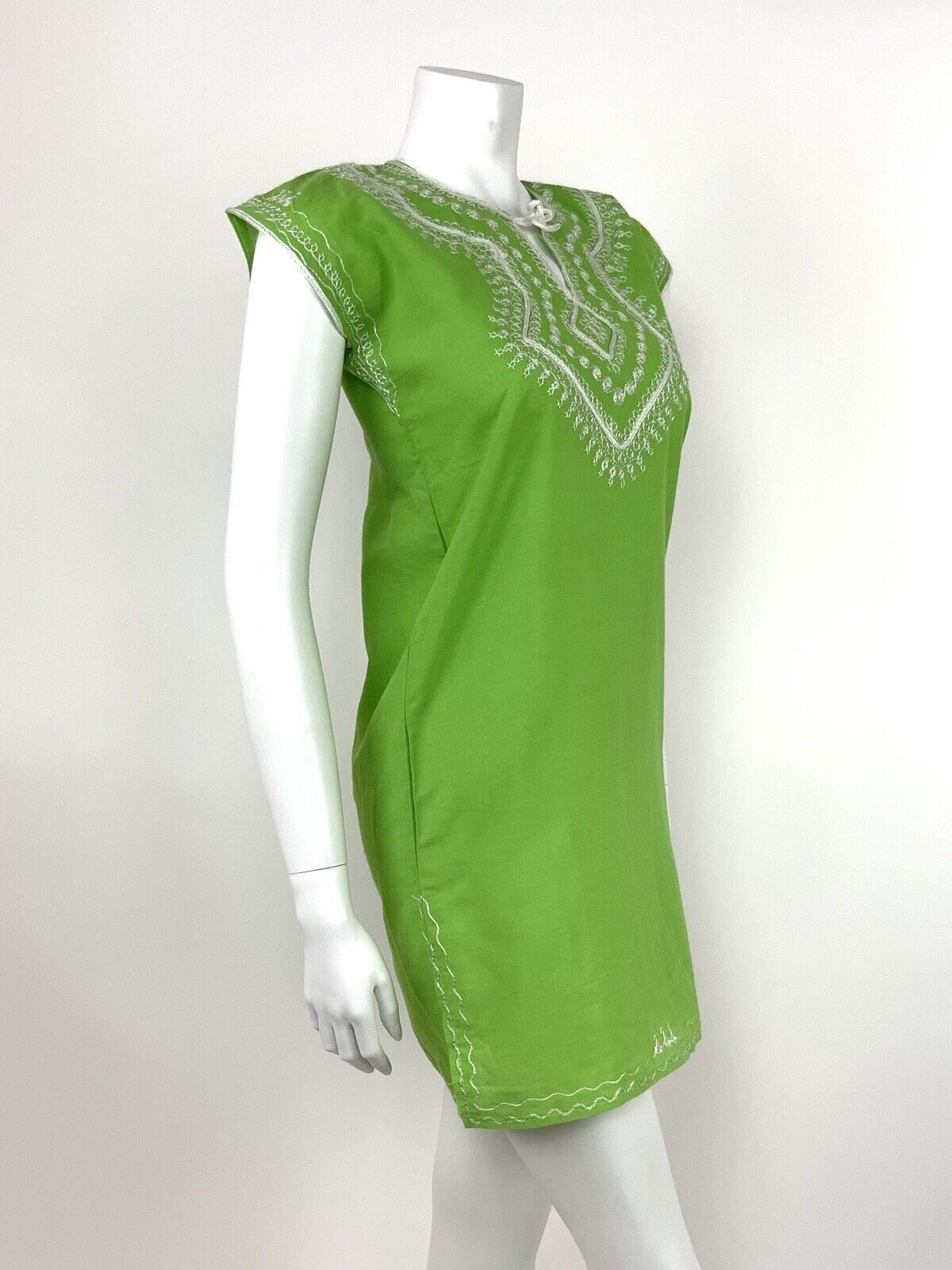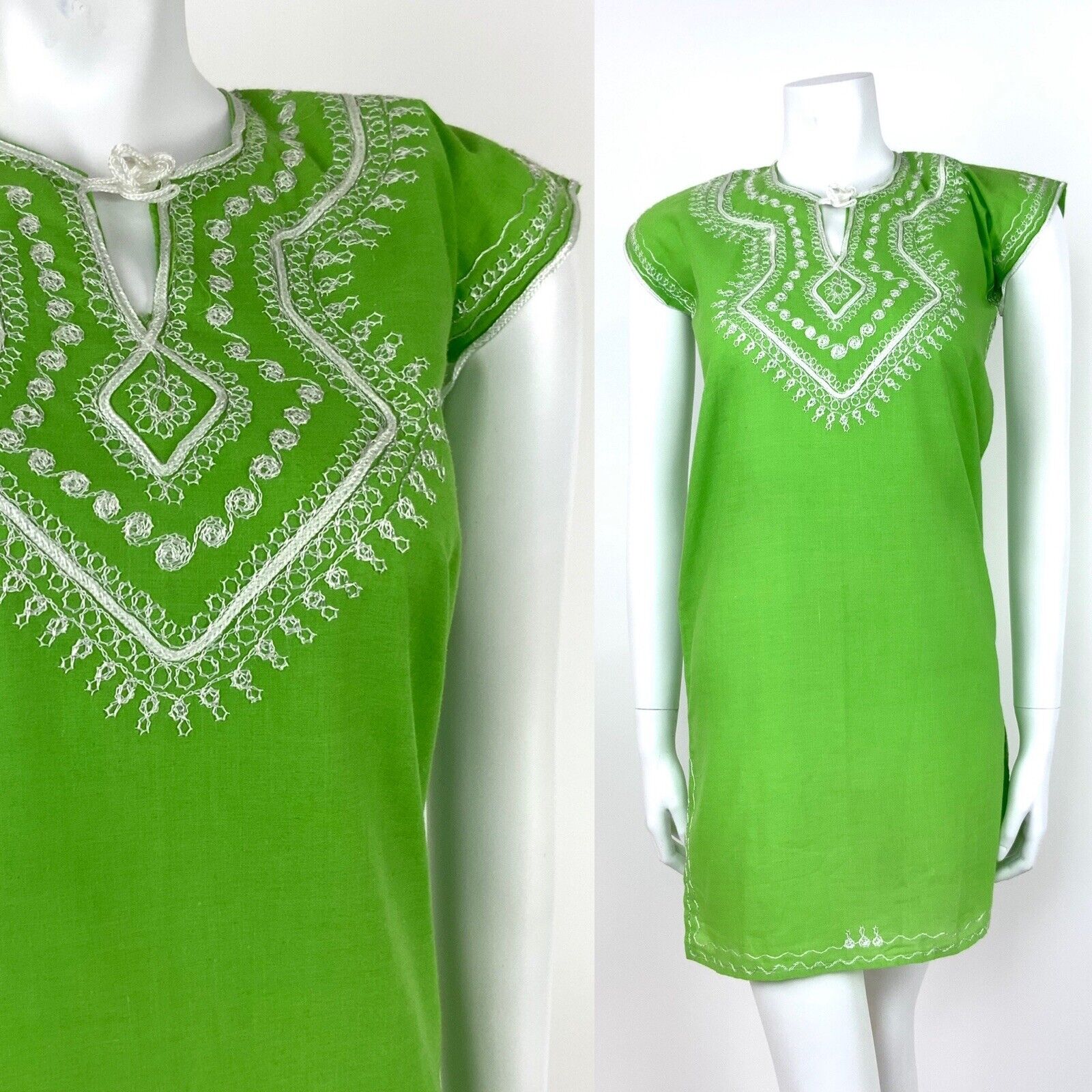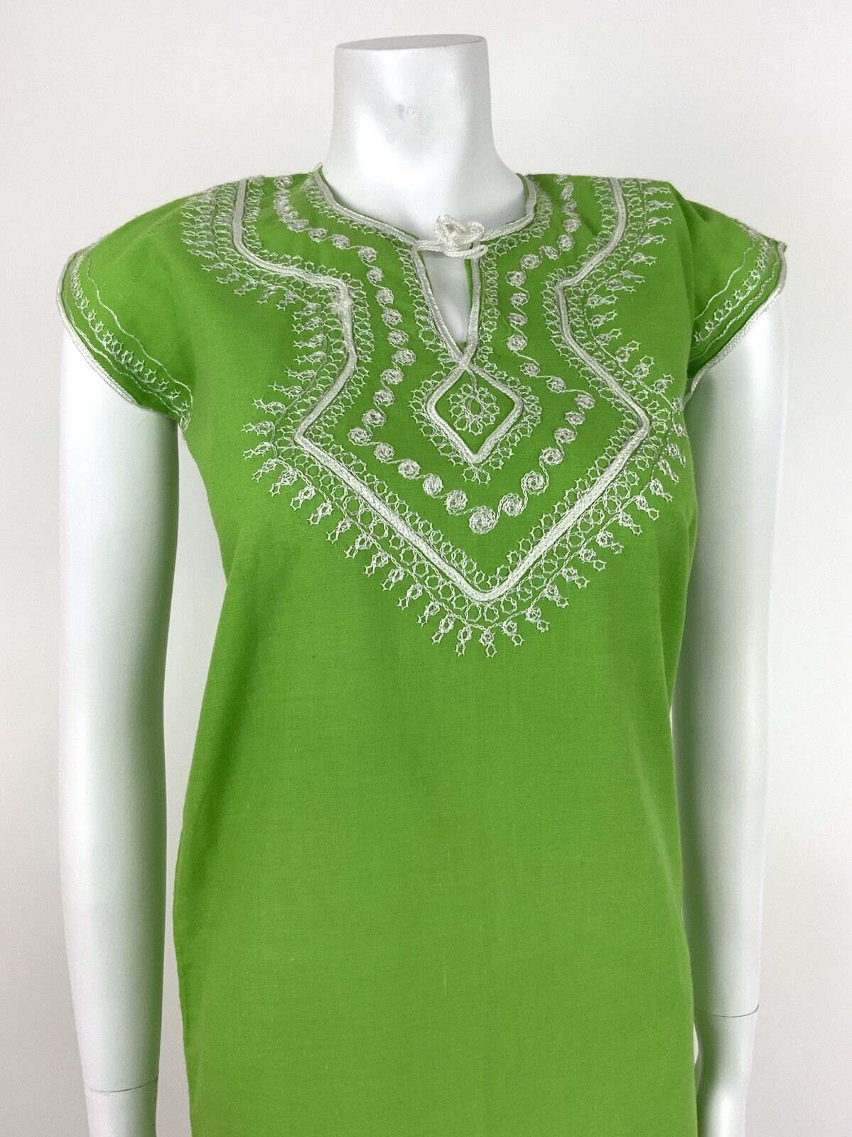 VINTAGE 60s 70s LIME GREEN COTTON KAFTAN WHITE EMBROIDERED ETHNIC 6 8