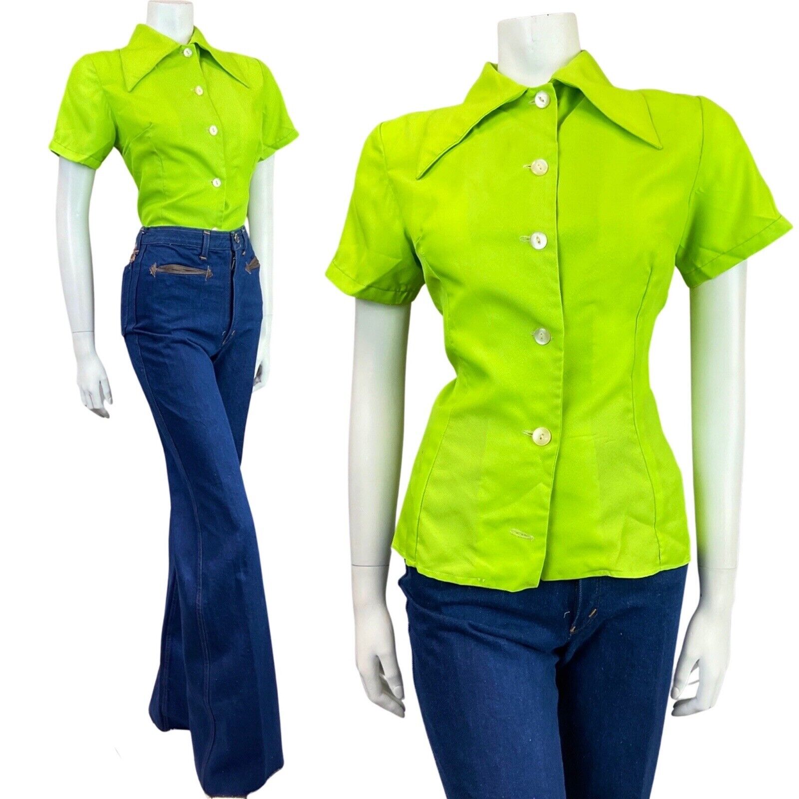 VINTAGE 60s 70s LIME GREEN DAGGER COLLAR SHORT SLEEVE MOD SHIRT 12 14