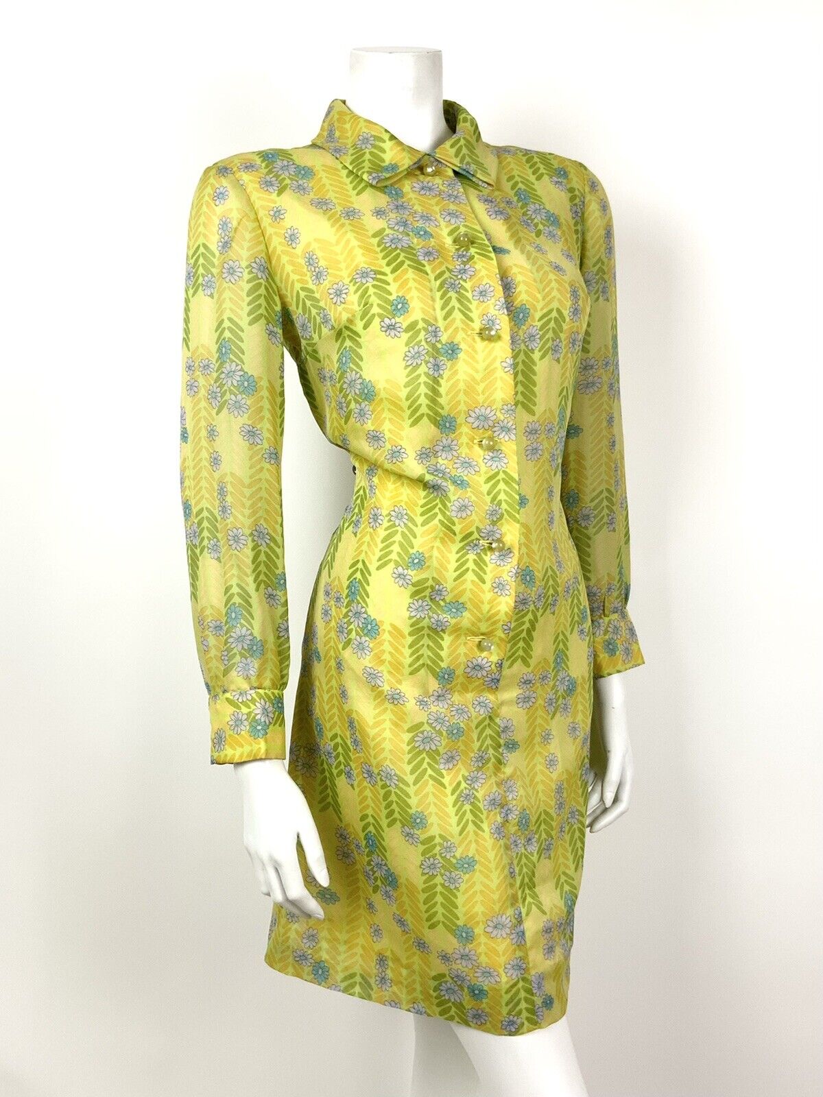 VINTAGE 60s 70s LIME GREEN LILAC BLUE HERRINGBONE FLORAL DAISY SHIRT DRESS 10 12