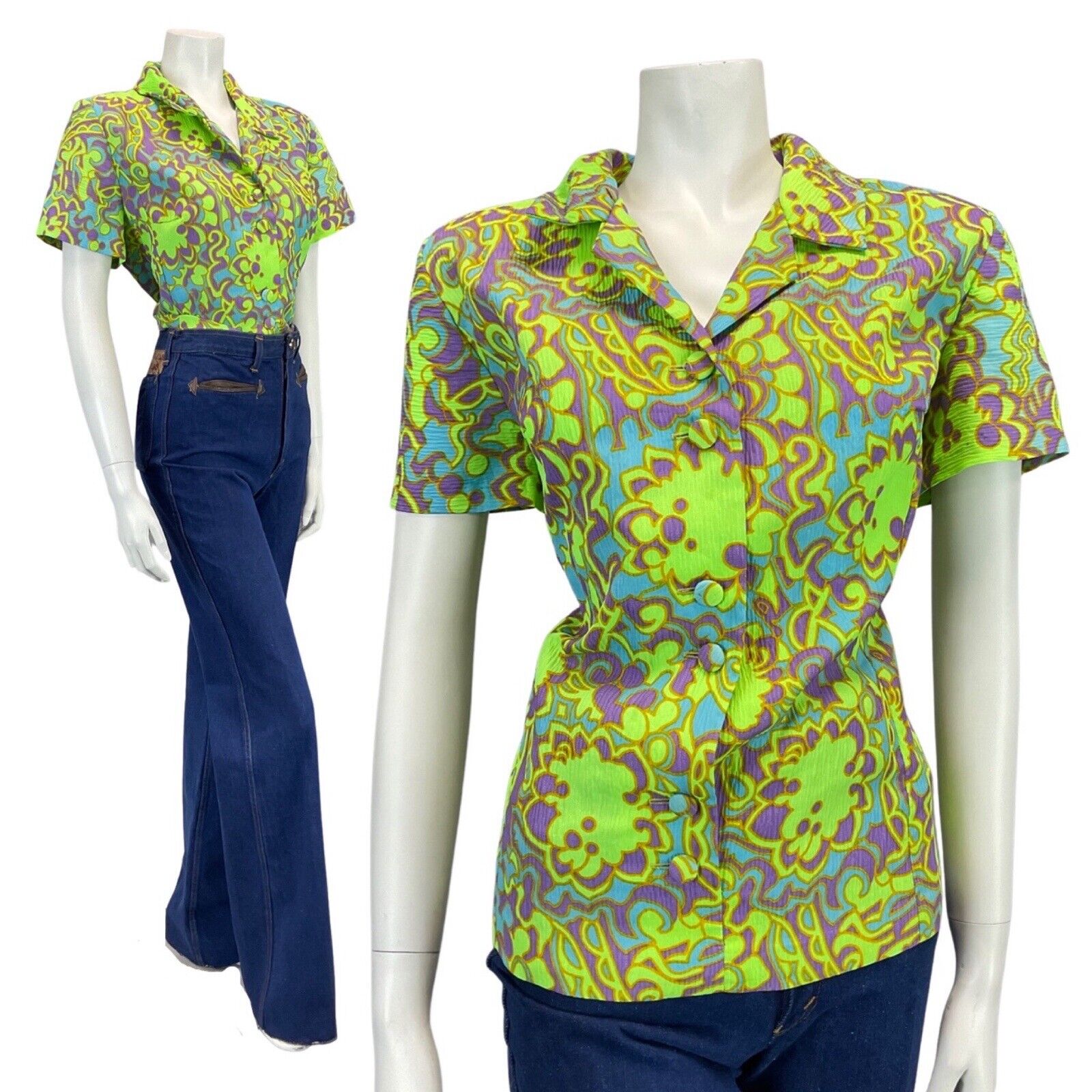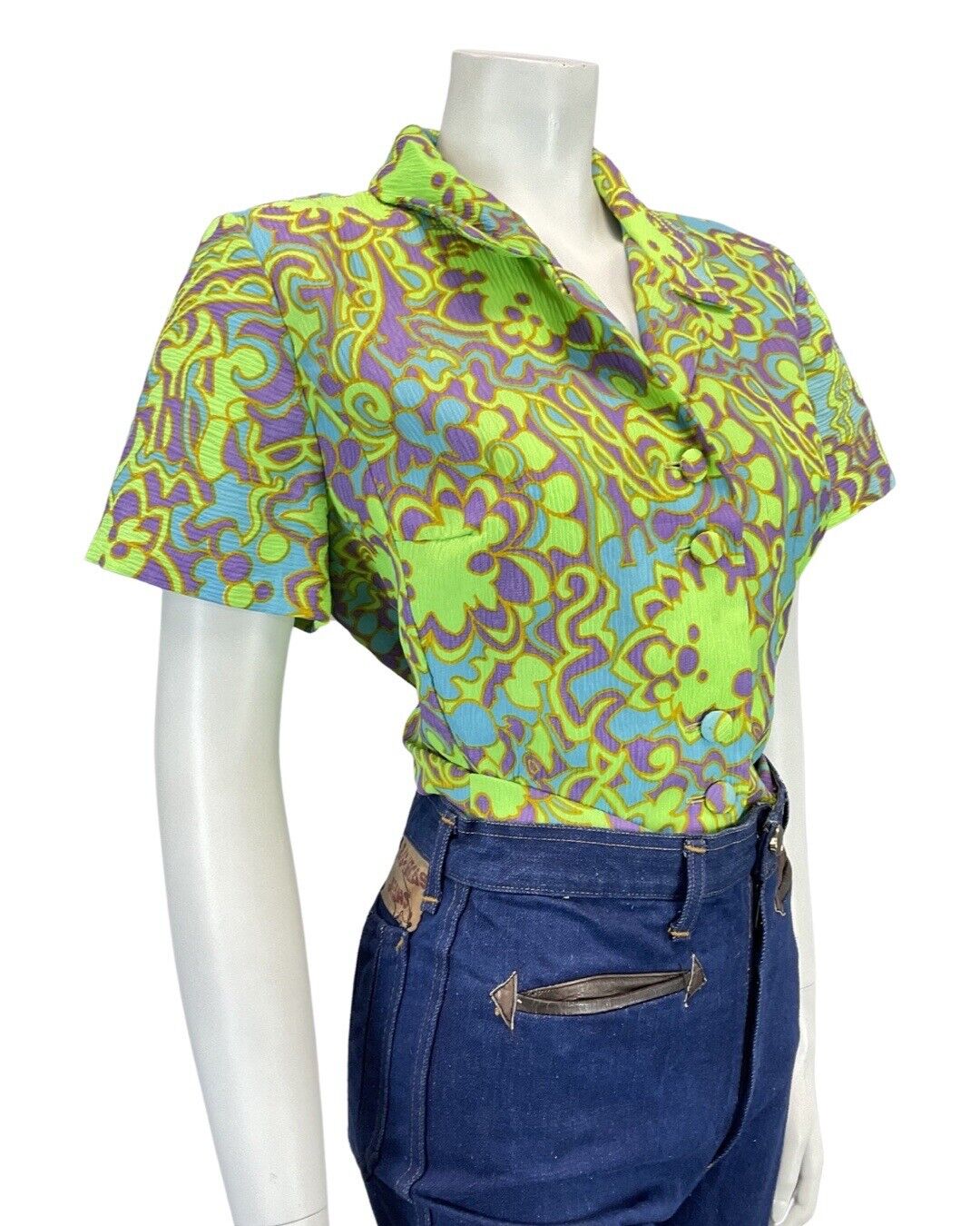VINTAGE 60s 70s LIME GREEN PURPLE BLUE PSYCHEDELIC FLORAL MOD BLOUSE TOP 16 18