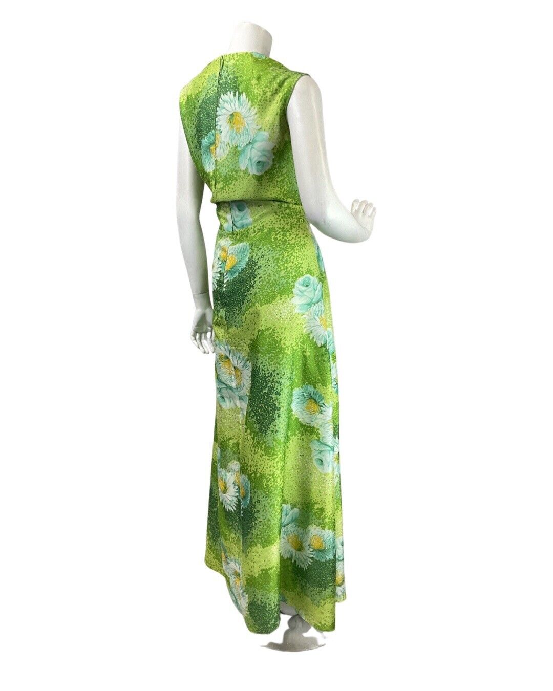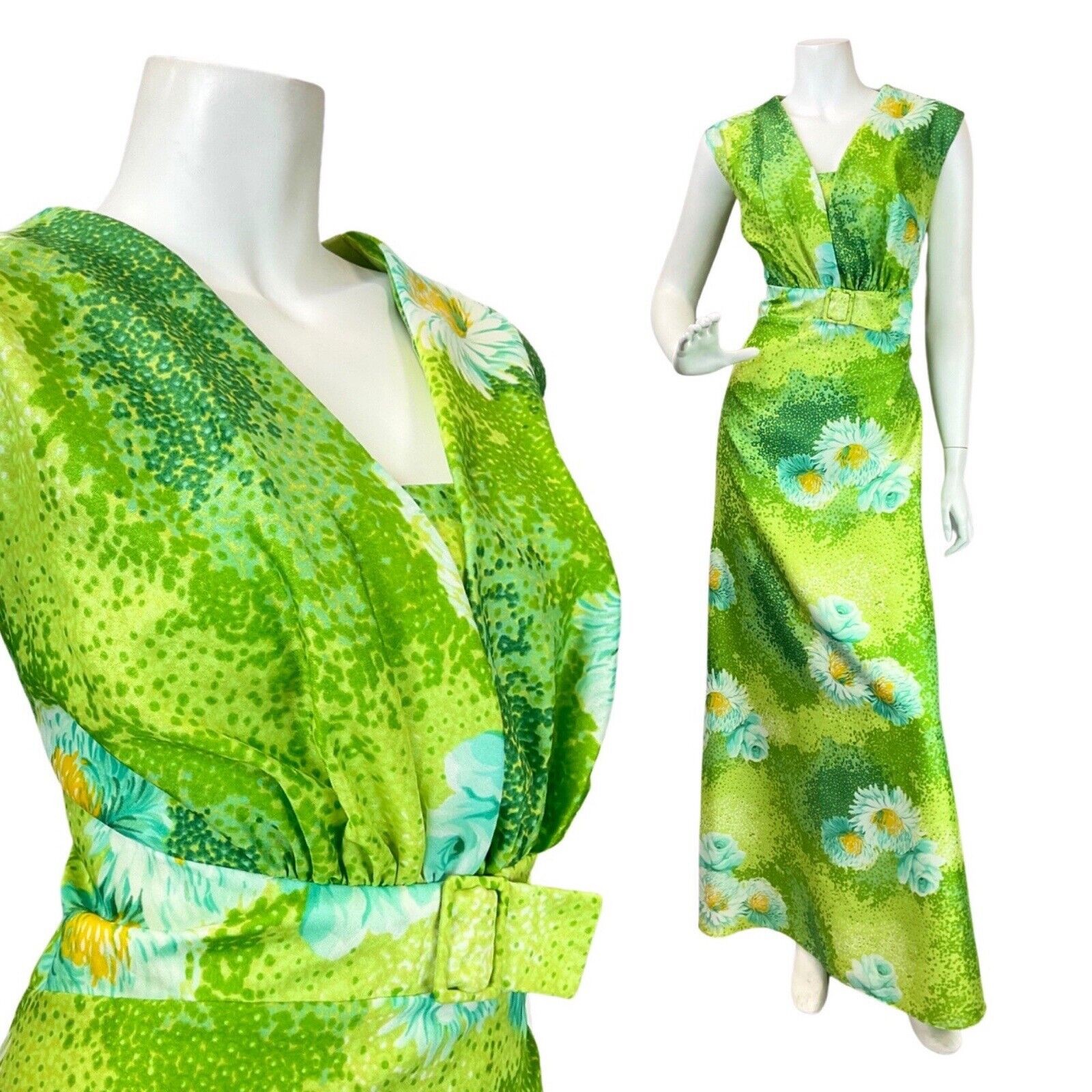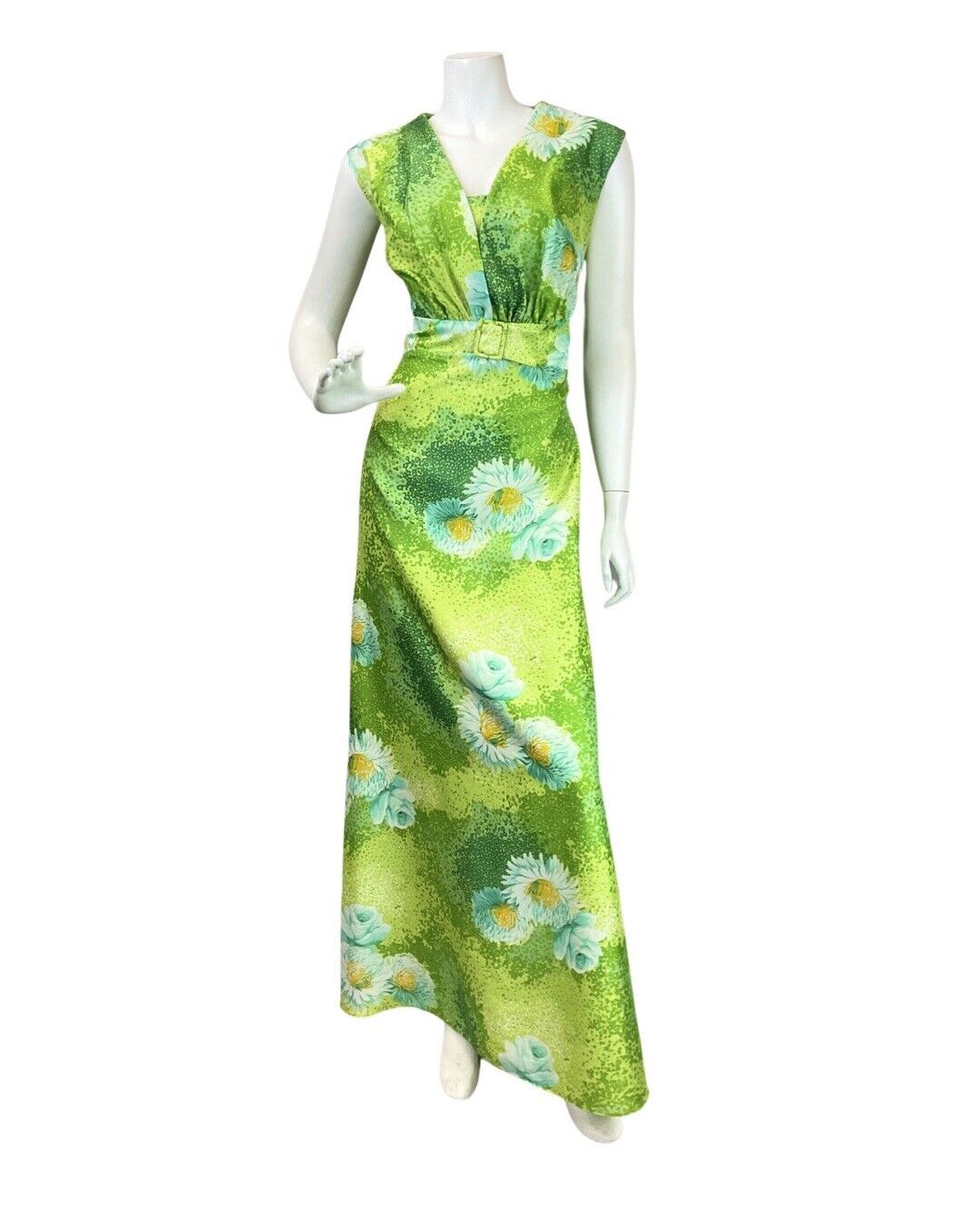 VINTAGE 60s 70s LIME GREEN WHITE DOTTY DAISY FLOWER SLEEVELESS MAXI DRESS 14 16