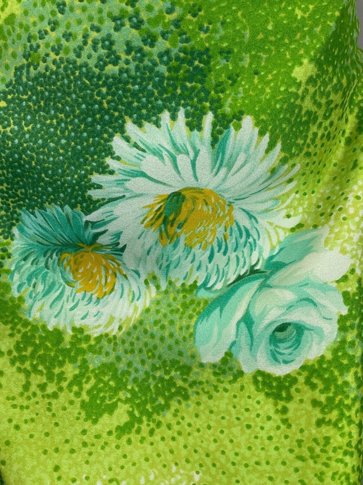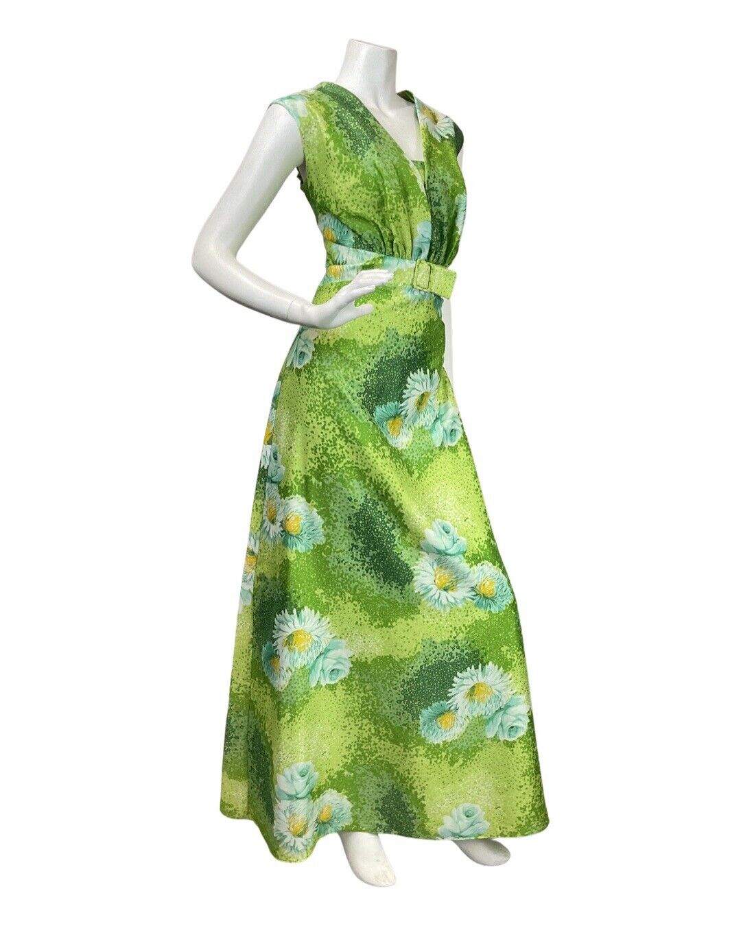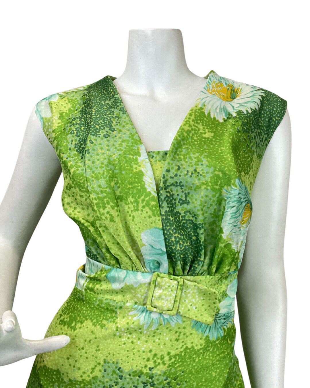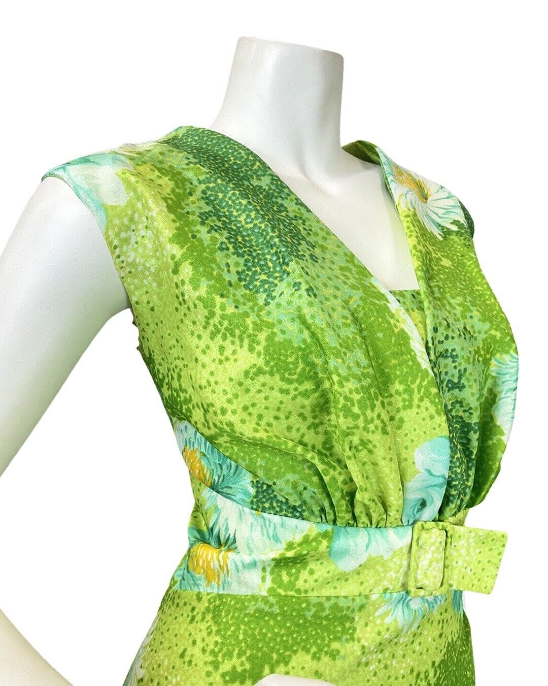 VINTAGE 60s 70s LIME GREEN WHITE DOTTY DAISY FLOWER SLEEVELESS MAXI DRESS 14 16