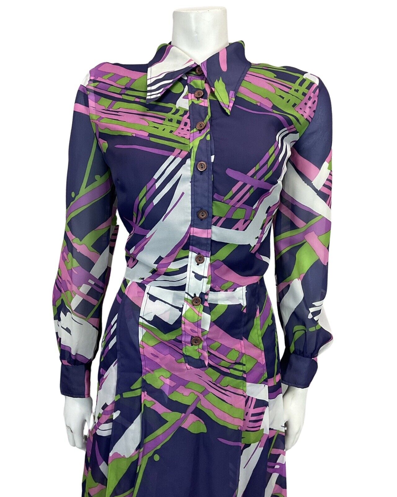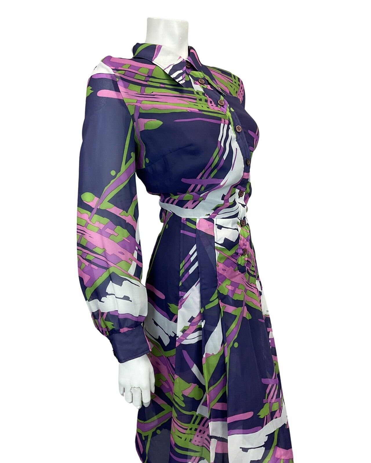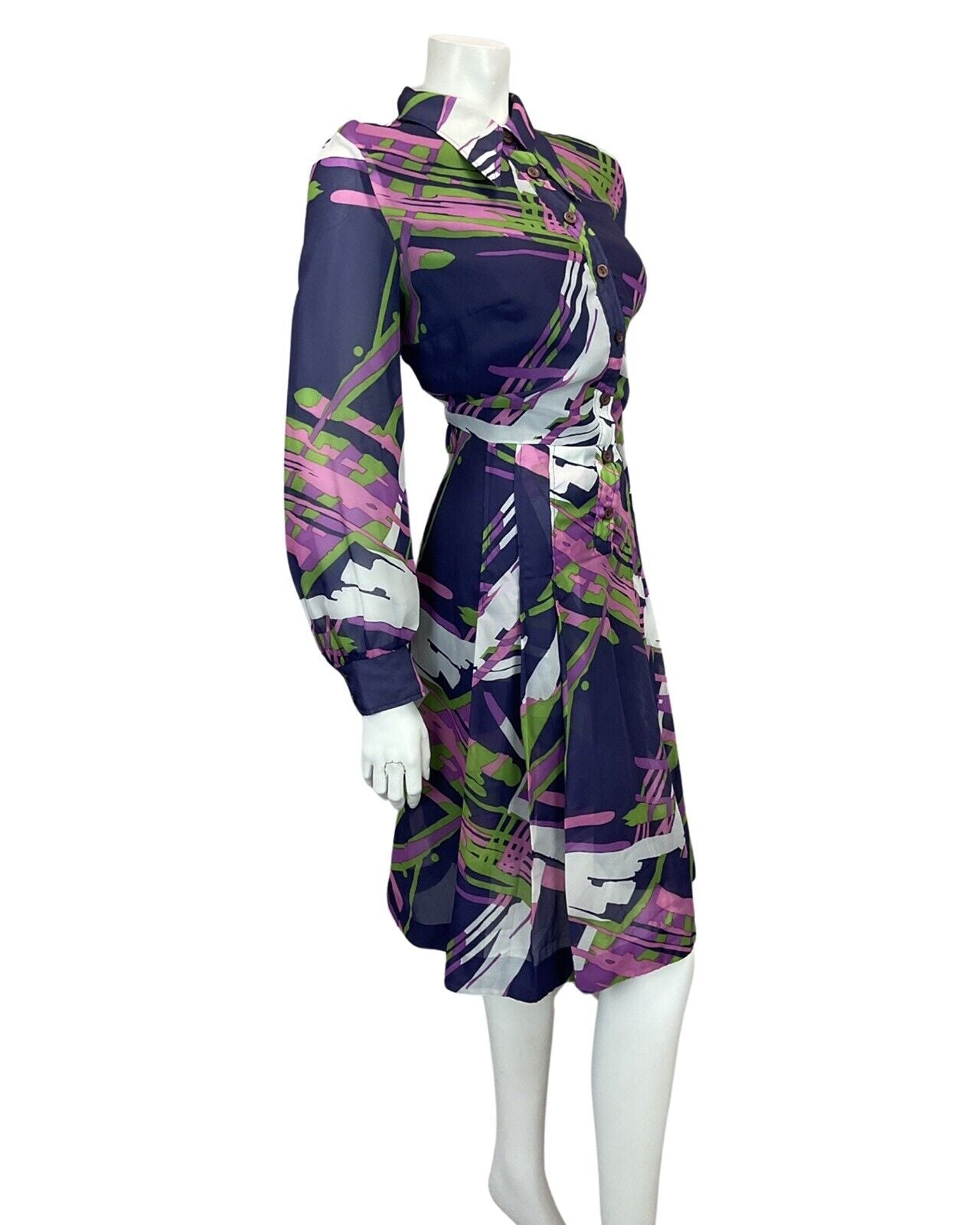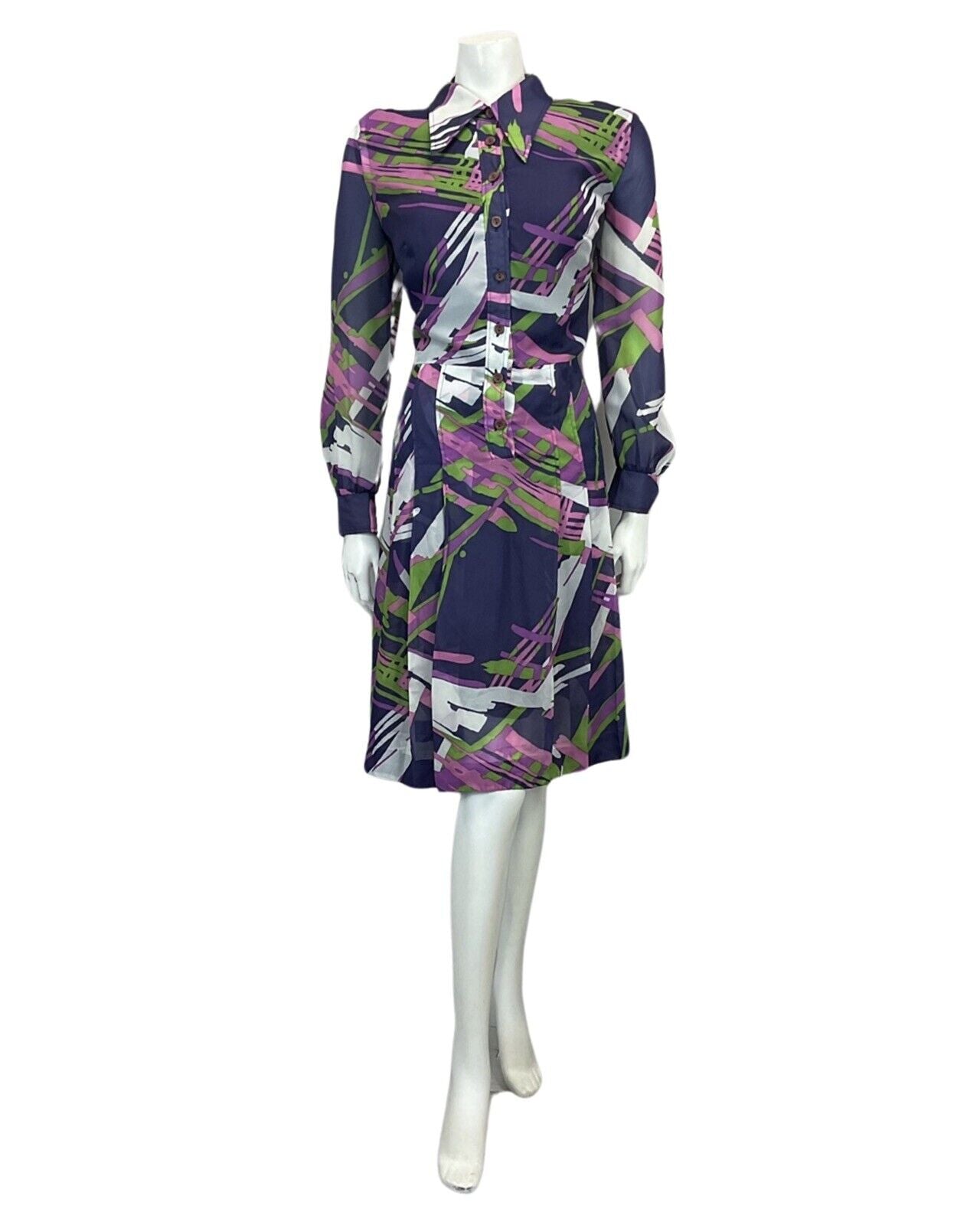 VINTAGE 60s 70s NAVY BLUE GREEN PURPLE PLEATED MIDI MOD DRESS 16