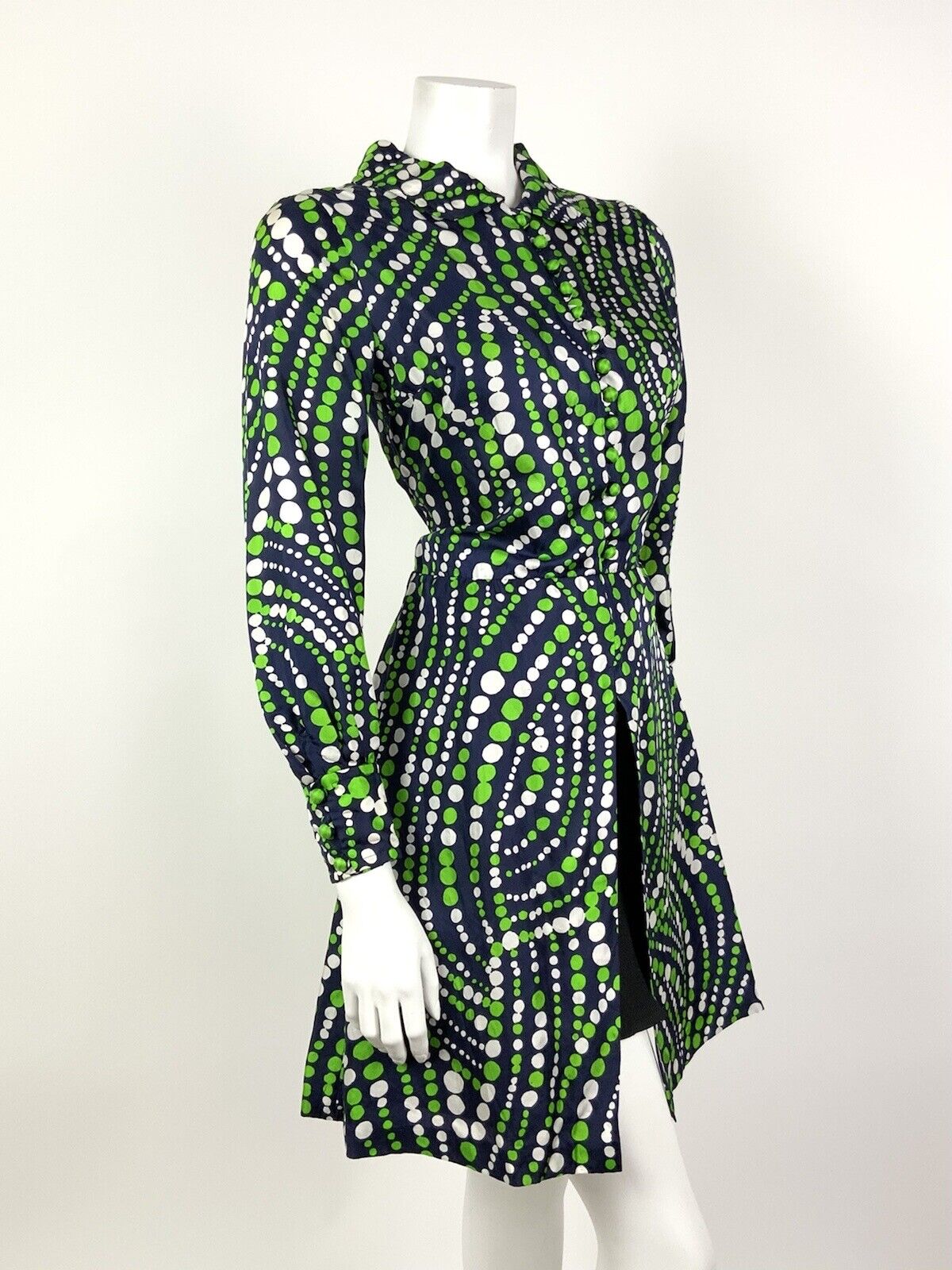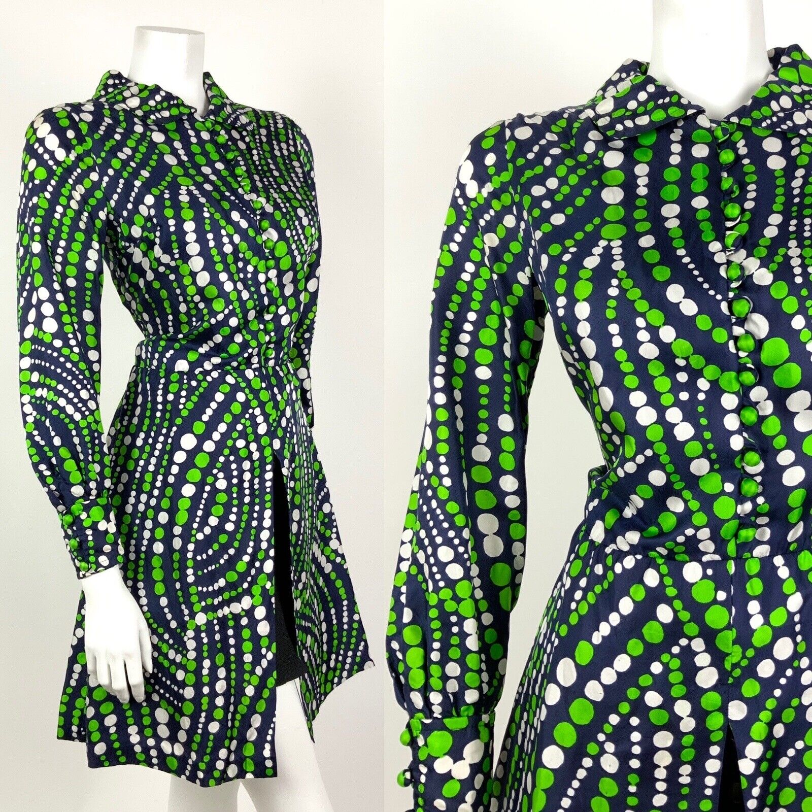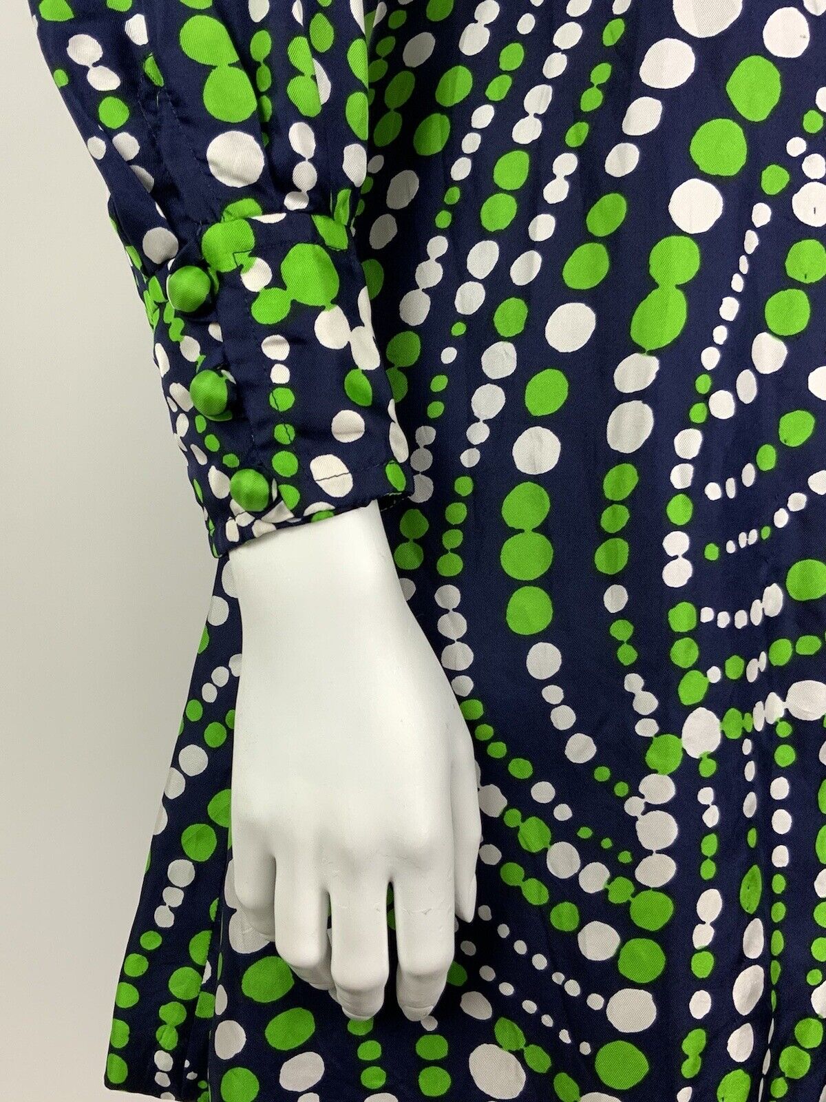 VINTAGE 60s 70s NAVY BLUE GREEN WHITE DOTTY WAVY MOD SPLIT SHIRT DRESS 10